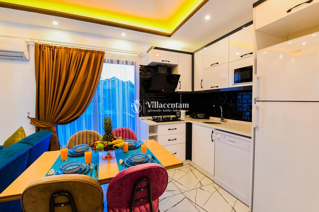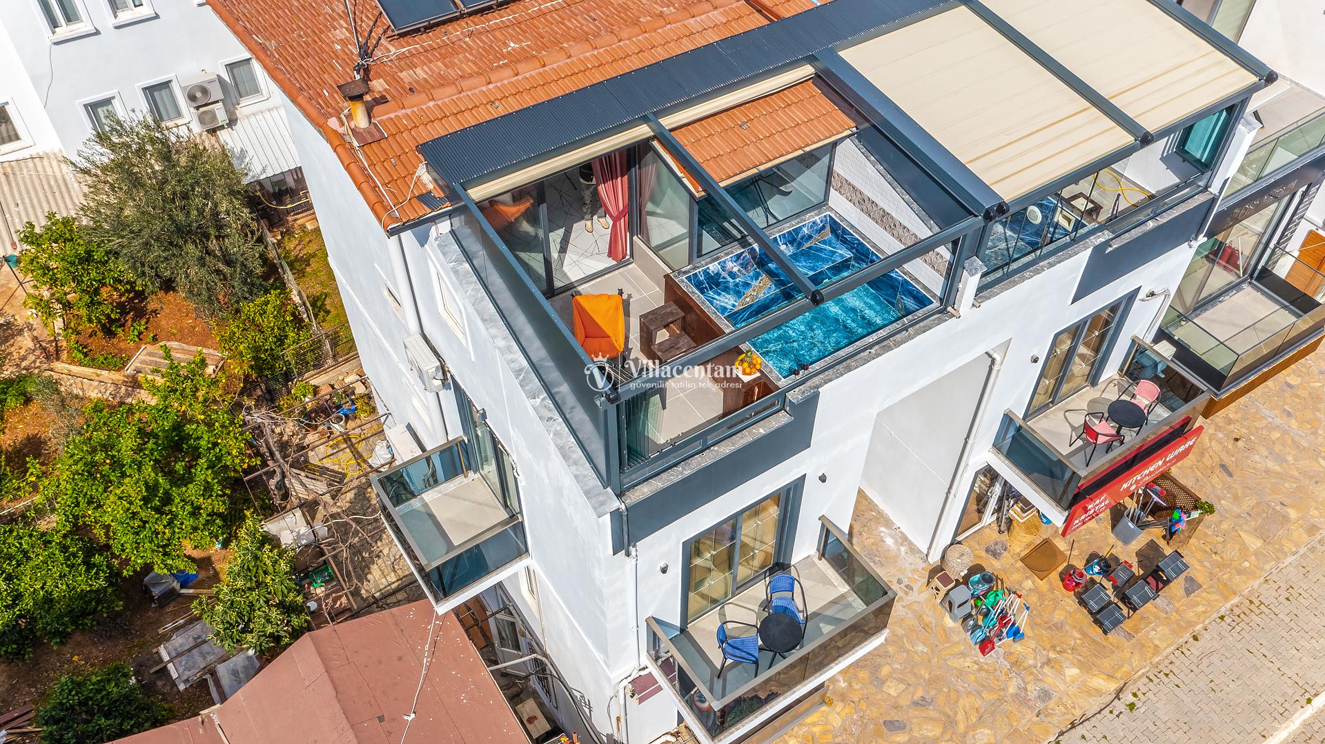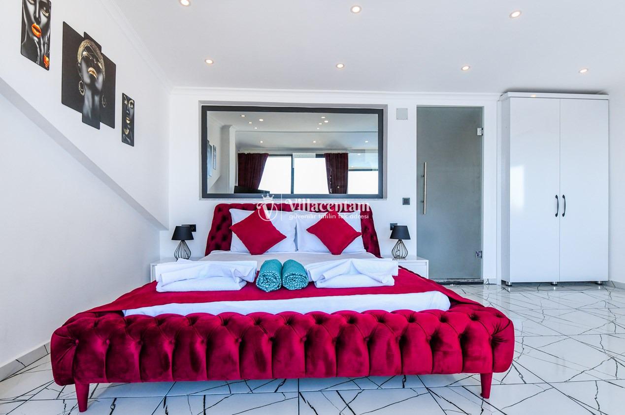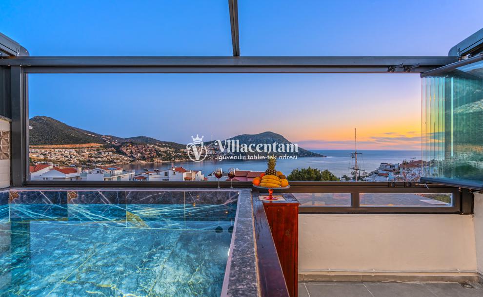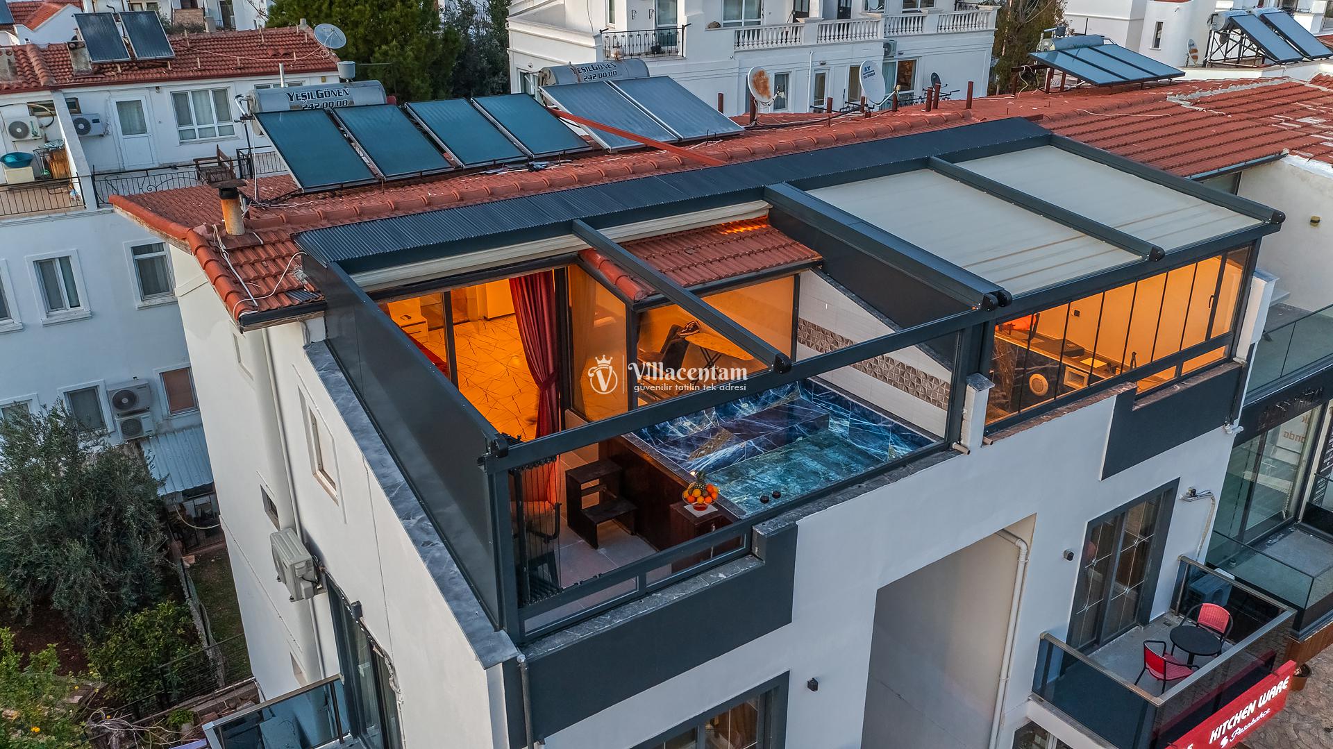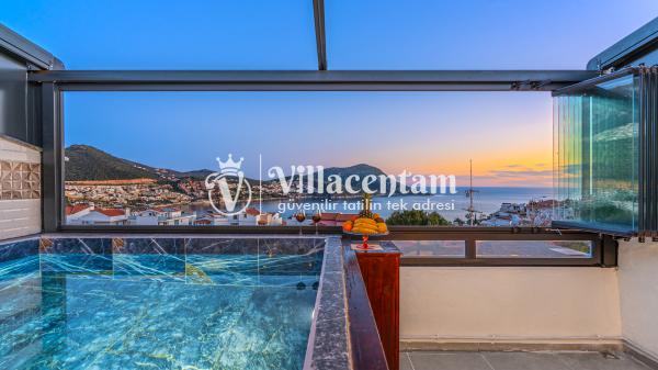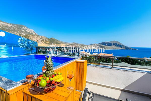Kalkan Merkez de konumlanmakta olan Suit Manzara 1, masmavi deniz manzarasına hakim kiralık dairelemiz arasında yer almaktadır. Yazlık dairemiz 2 katlı bir binanın teras katında yer almaktadır. Şık ve konforlu bir şekilde dekore edilen kiralık dairemizde 2 adet yatak odası bulunmakta olup, 4 kişiye konaklama imkanı sağlamaktadır. Özellikle balayı çiftlerimize ve çekirdek ailelere hitap eden yazlık dairemizin terasında havuz bulunmaktadır. Yatak odalarının bir tanesinin banyo ve tuvaleti odanın dış kısmında ortak kullanım olarak yer almaktadır. Sessizlik ve sakinlik içerisinde keyif dolu bir tatil için Suit Manzara 1’ i tercih edebilirsiniz.