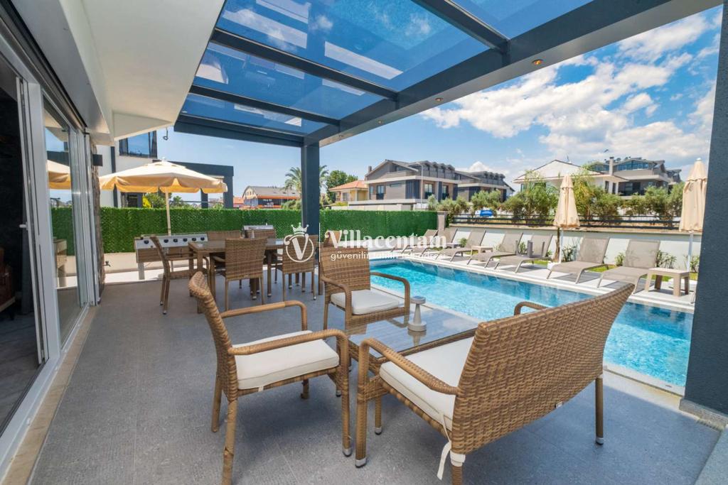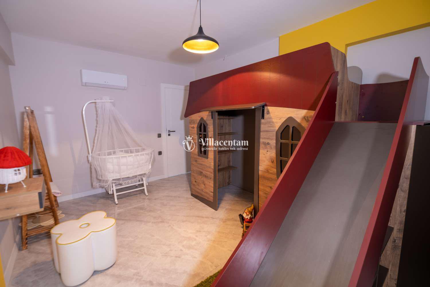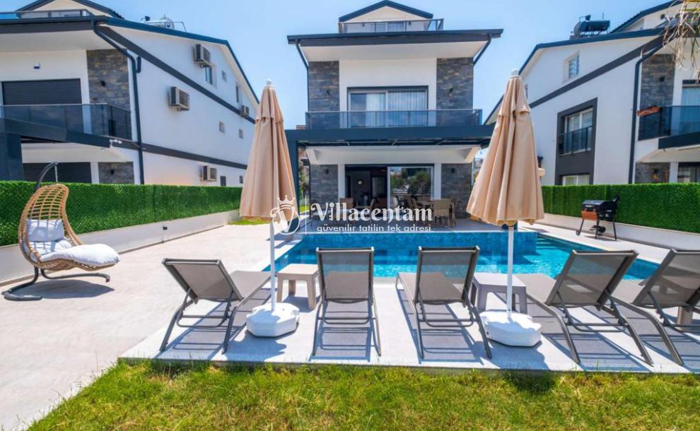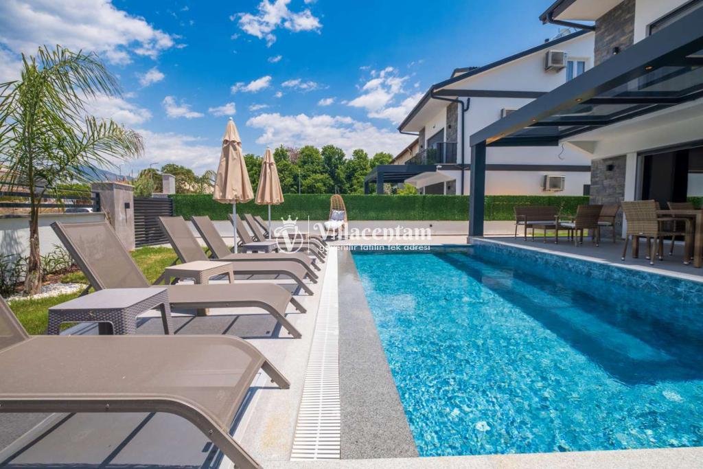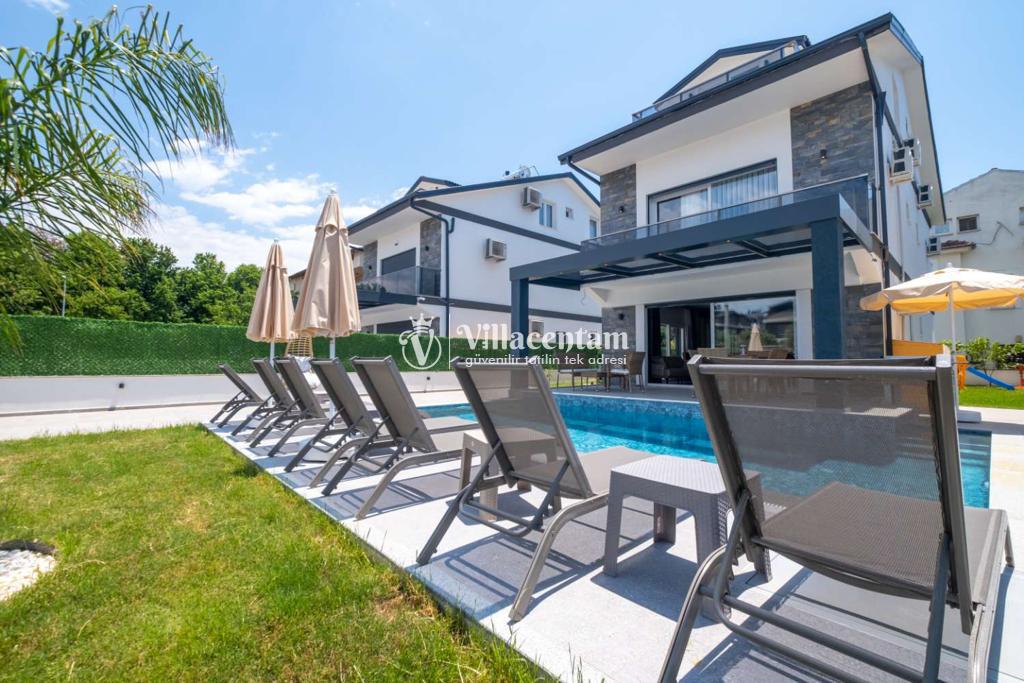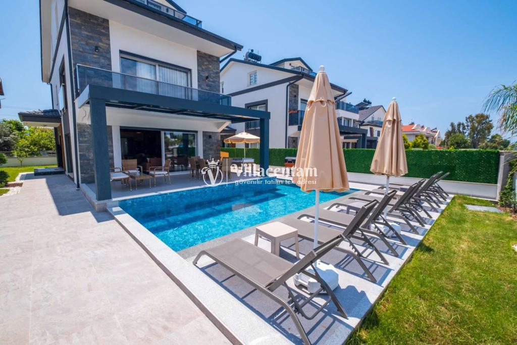 Dış mekânda özel yüzme havuzu, yeşil bahçe ve çocuk oyun alanı gibi donatılar yer alır; bu sayede gün boyu hem dinlenebilir hem de eğlenceli vakit geçirebilirsiniz. Villa, ayrıca özel otopark ve ferah teras alanıyla konforlu bir tatil deneyimi sağlar.