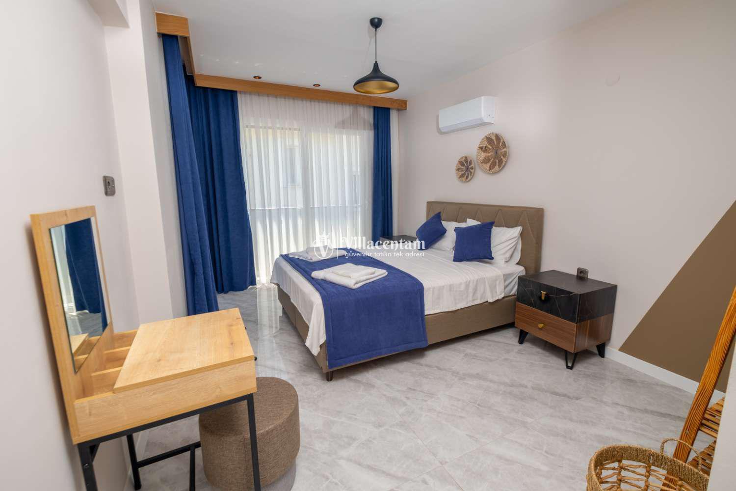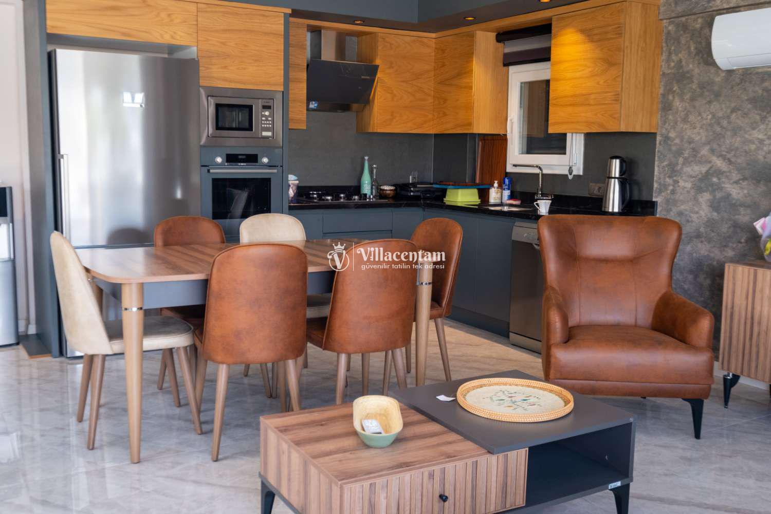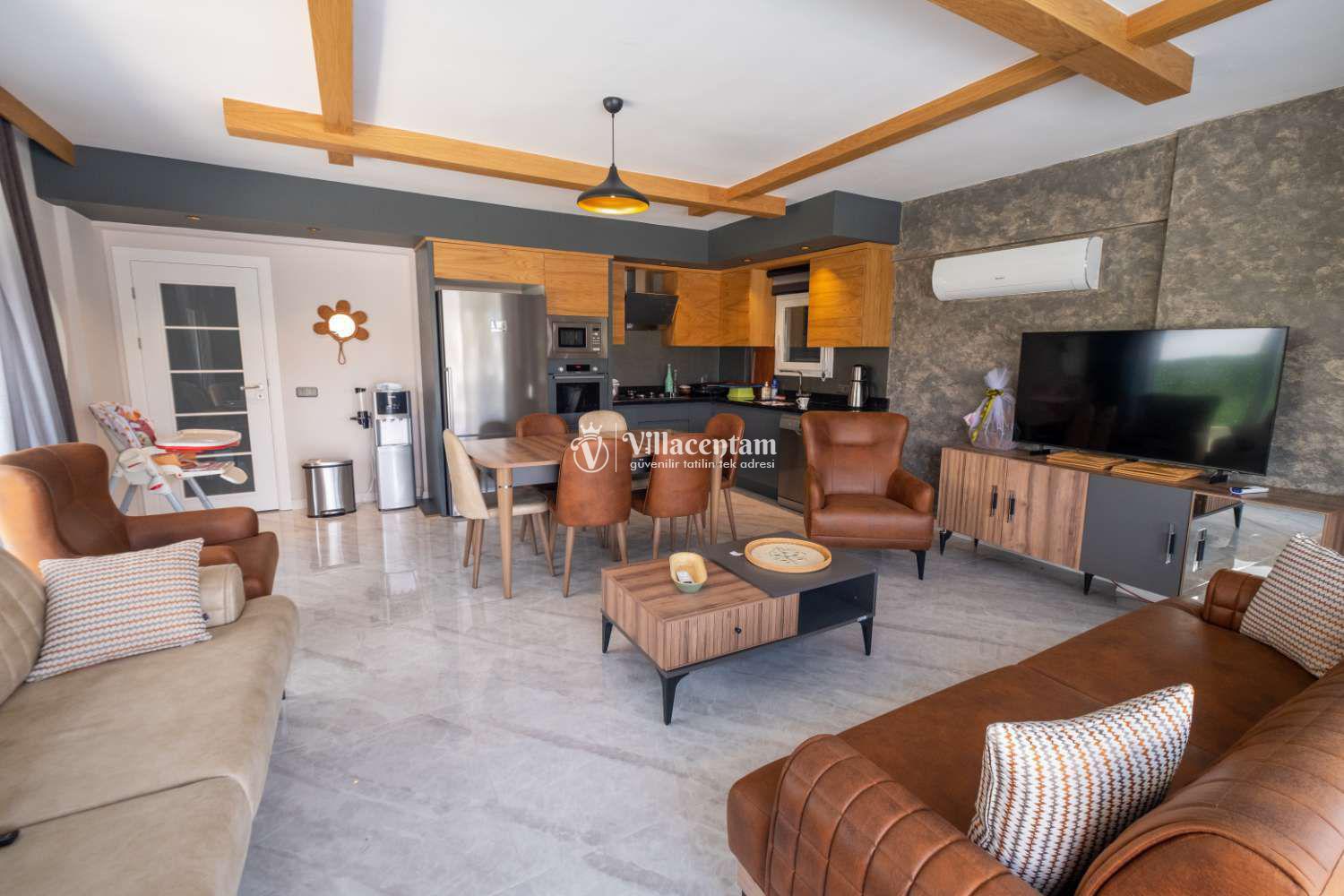 Fethiye Çalış’ın sunduğu restoranlar, kafeler, alışveriş imkânları ve ünlü gün batımı manzarasıyla çevrili bu villa, deniz ve sosyalleşme olanaklarına da kolay erişim avantajı sunar (en yakın denize girme imkânı Çalış Plajı’dır).
