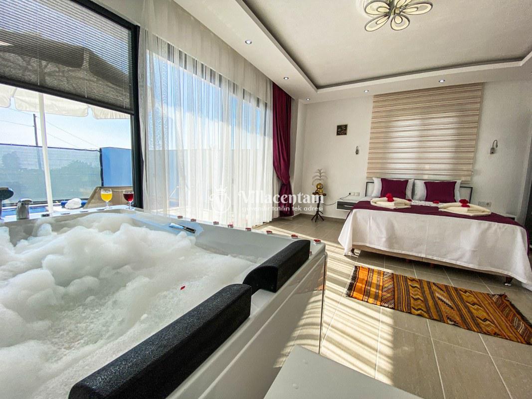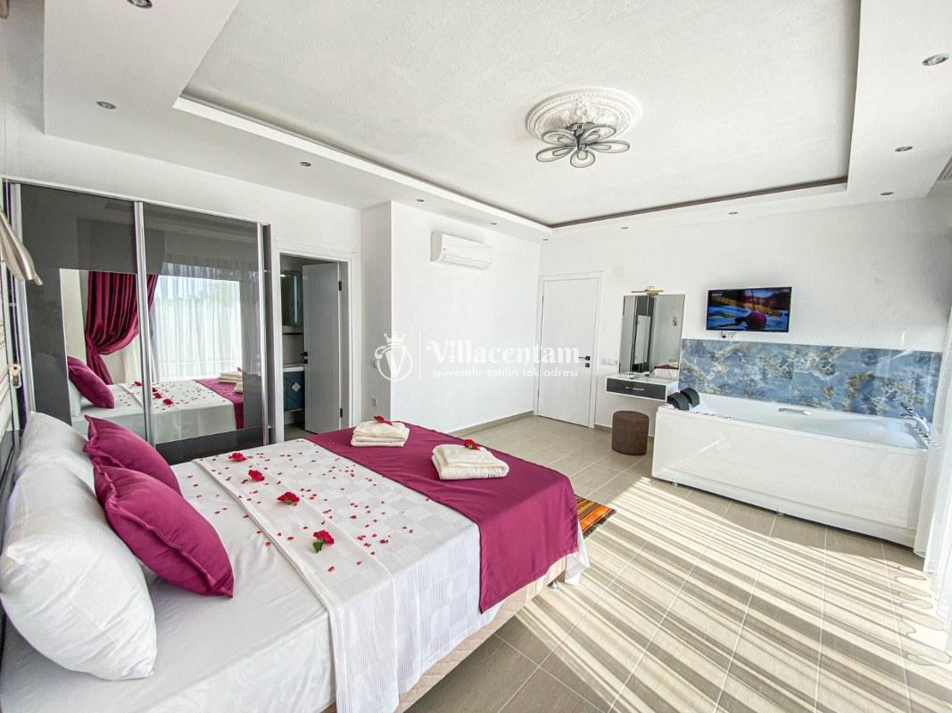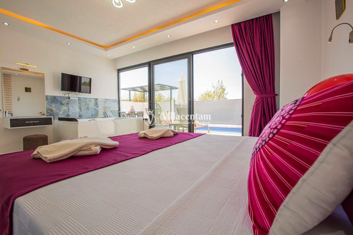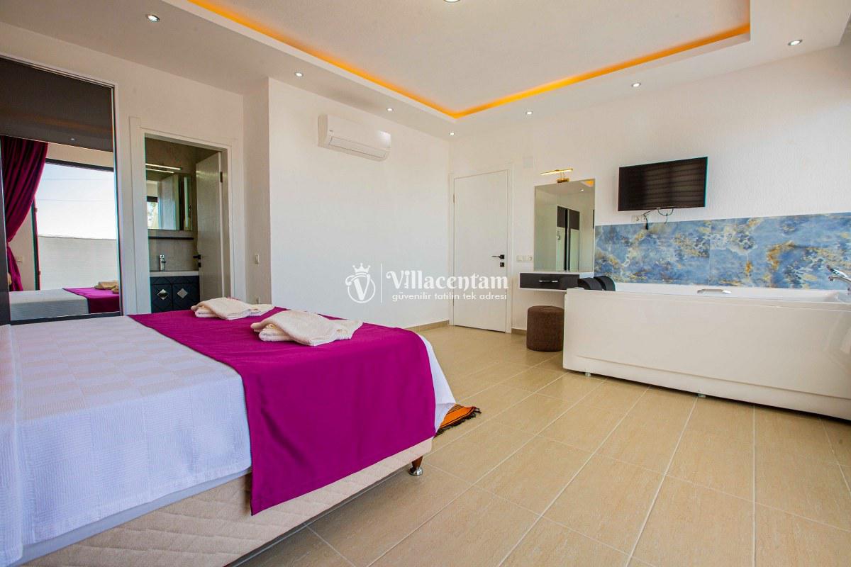 Villa Ahdem, Kalkan Üzümlü köyünde konumlanmakta olan, yeşilliklerin arasında doğa manzaralı kiralık bir villadır. Modern ve konforlu bir şekilde dizayn edilen yazlık villamızda 1 adet yatak odası bulunmakta olup, 2 kişiye konaklama imkanı sağlamaktadır. Yatak odasının içerisinde tüm yorgunluğunuzu atabileceğiniz jakuzi yer almaktadır. Özellikle balayı çiftlerimize hitap eden yazlık villamızın havuz ve havuz terası korunaklı hale getirilmiştir. Kiralık villamız dışarıdan gözükmemektedir. Muhafazakar çiftlerimiz de gönül rahatlığı ile tercih edebilirler. Sessizlik ve sakinlik içerisinde huzur dolu bir balayı tatili için Villa Gürel sizler için doğru bir tercih olacaktır.