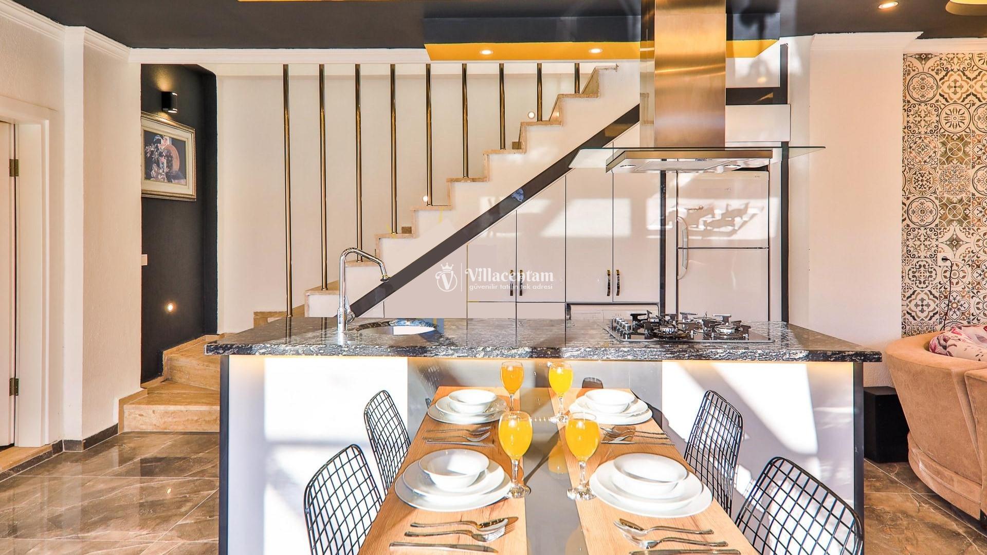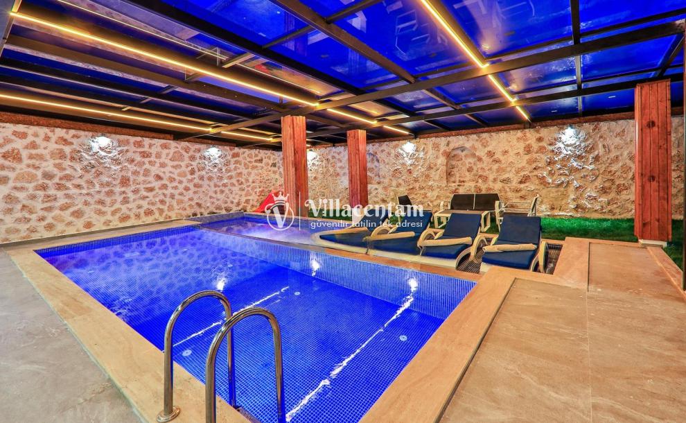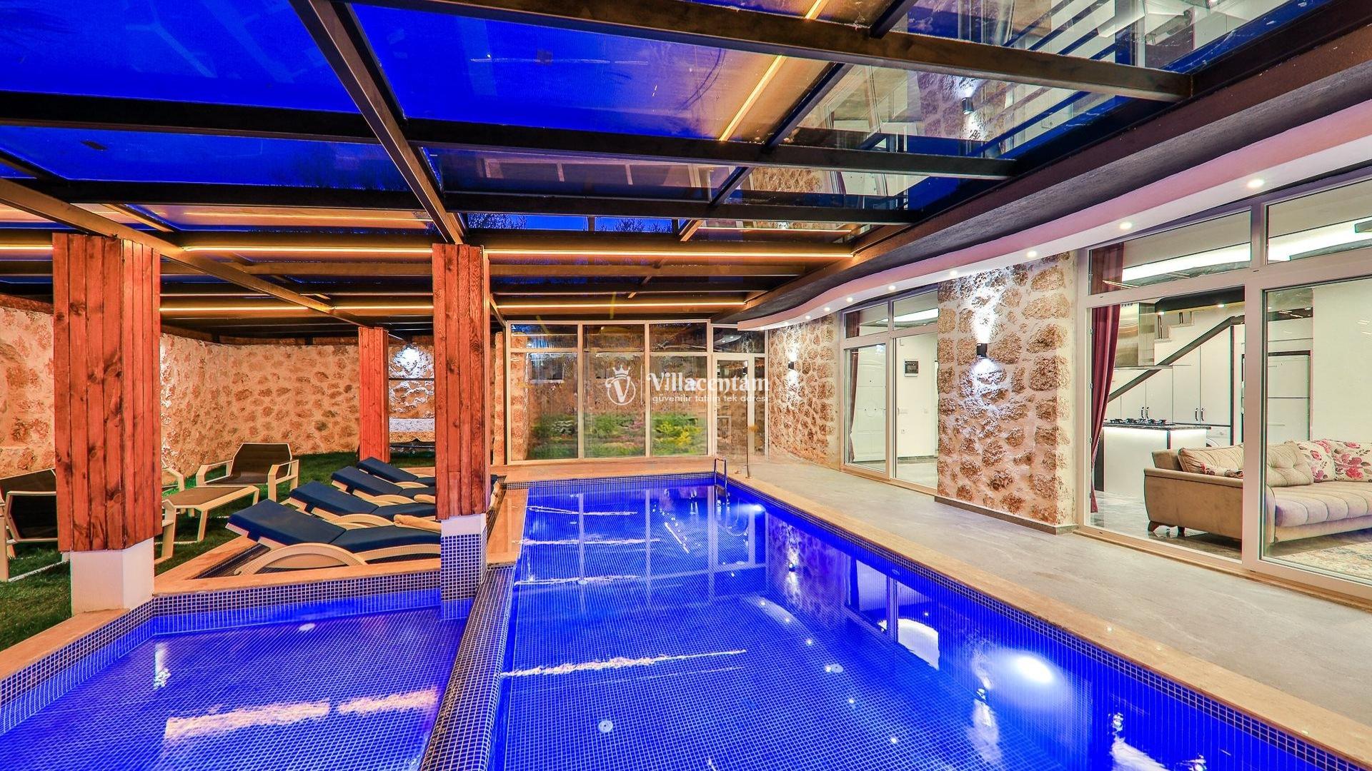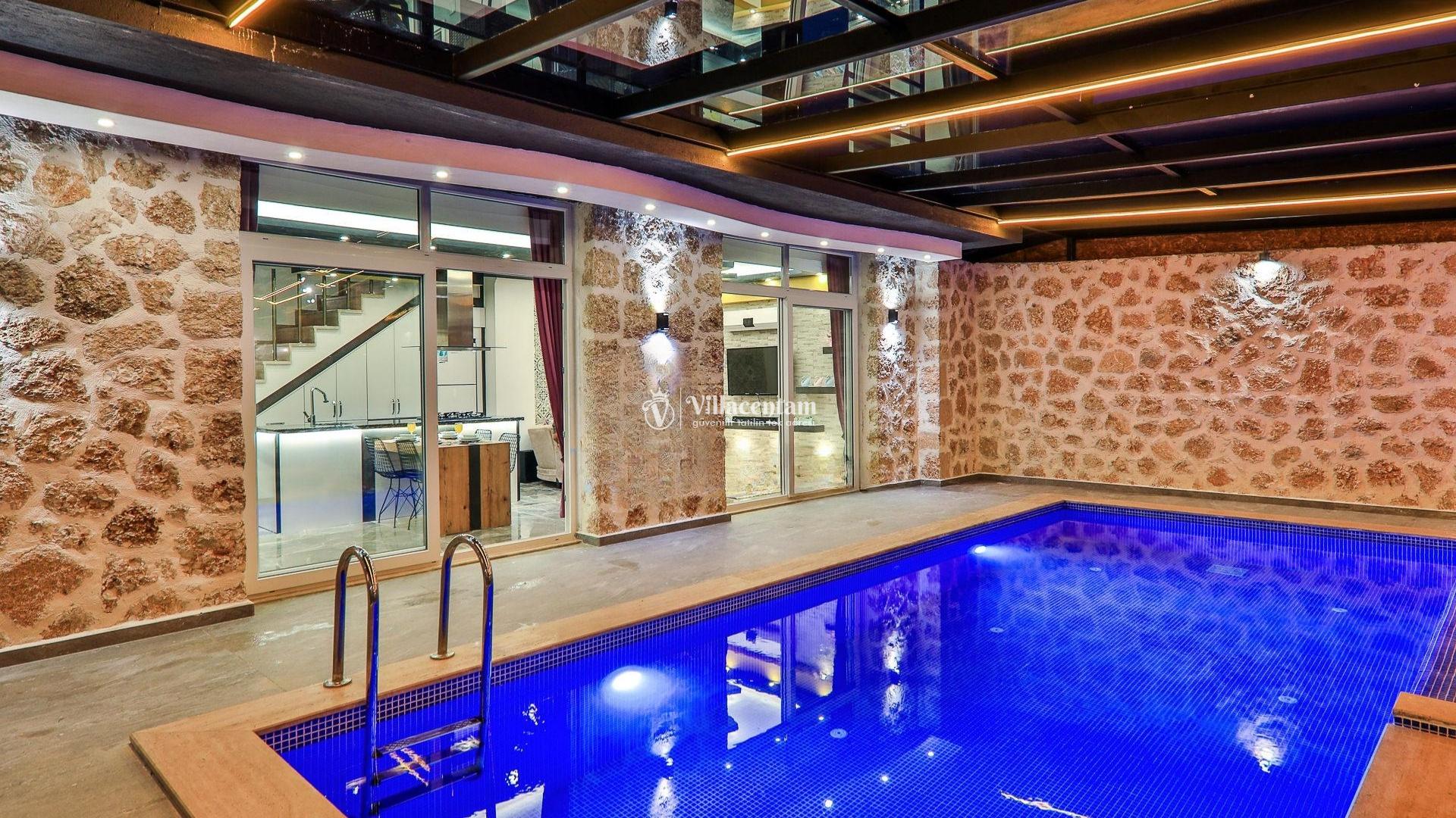 Villanın en dikkat çekici özelliklerinden biri, ısıtmalı kapalı yüzme havuzu ve jakuzisidir; bu sayede yılın büyük bir bölümünde havuz keyfini sürdürebilirsiniz. Modern yaşam konforu sunan salon, tam donanımlı mutfak ve ferah yaşam alanları tatilinizi ev rahatlığında geçirmenizi sağlar.