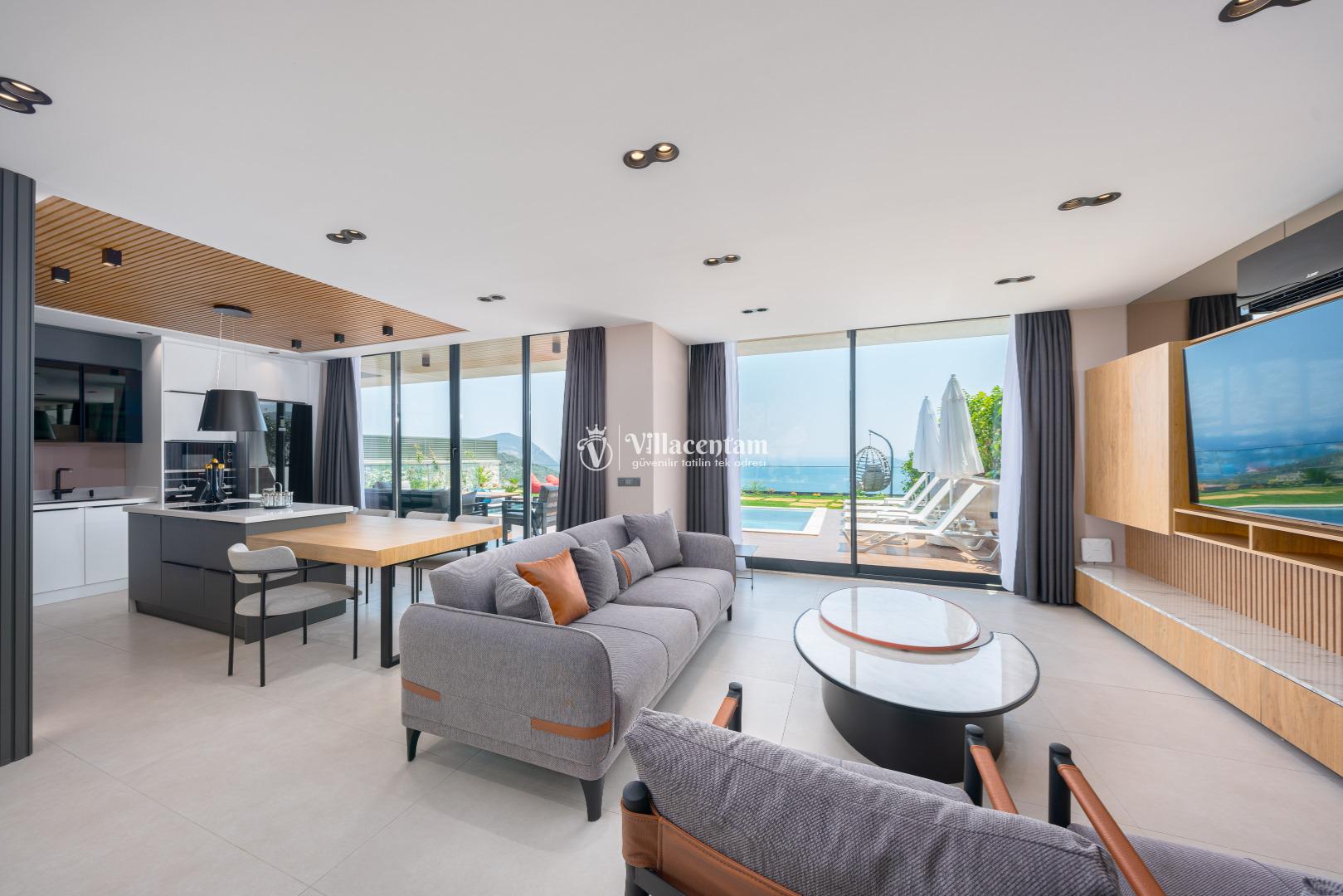 Villanın geniş ve modern tasarımlı salonunda lüks oturma grubu, TV, sehpa ve klima gibi tüm temel olanaklar mevcuttur. Salon, doğrudan havuz terasına açılan yapısı sayesinde ferah ve aydınlık bir kullanım alanı sağlar.