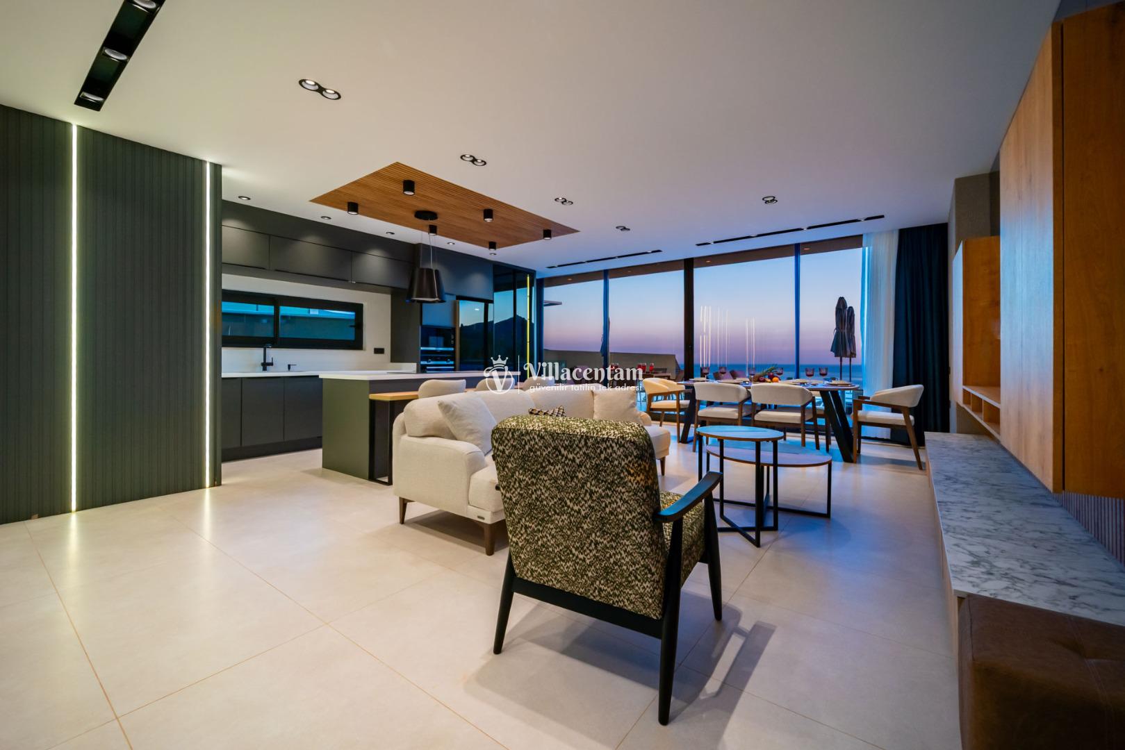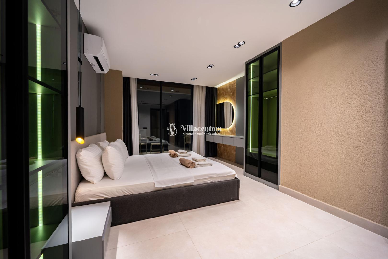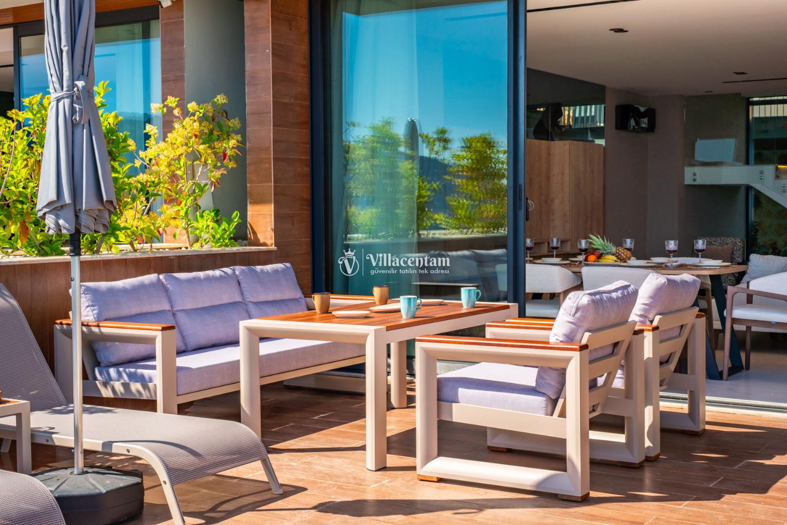 Konforlu oturma odasında lüks oturma grubu, TV, sehpa ve klima gibi tüm temel olanaklar bulunmaktadır. Aydınlık ve ferah salon alanı doğrudan havuz terasına açılarak keyifli bir yaşam alanı oluşturur.