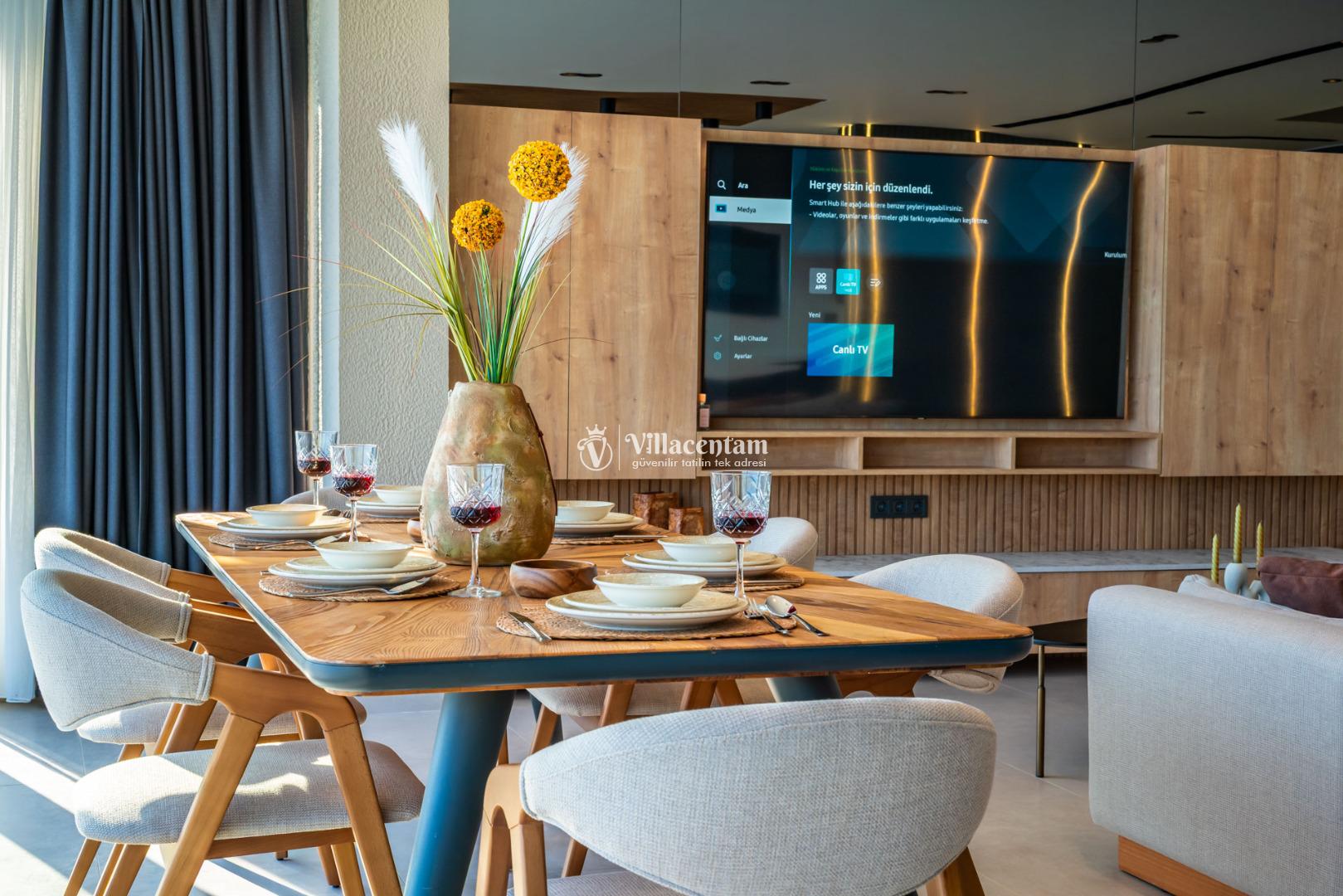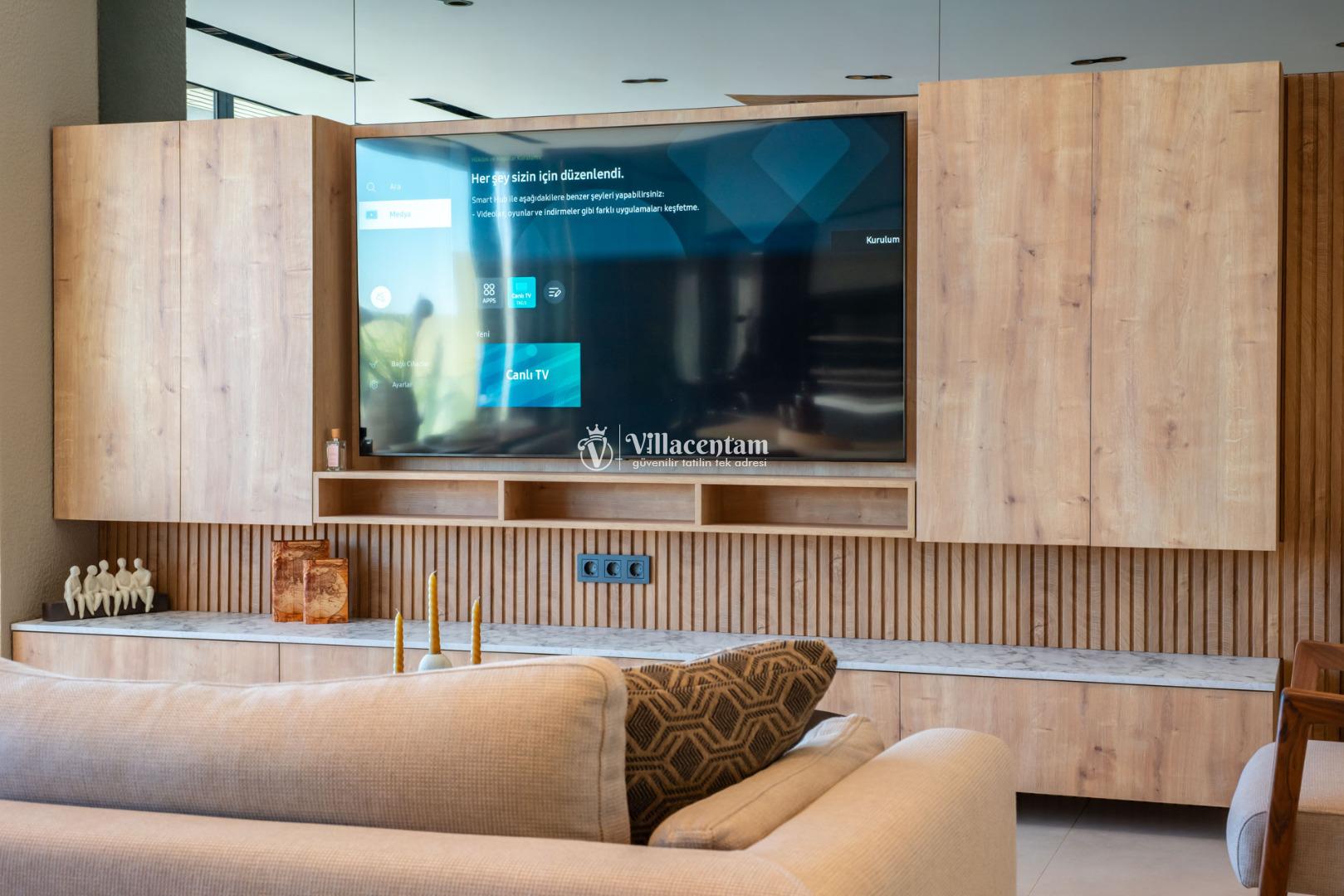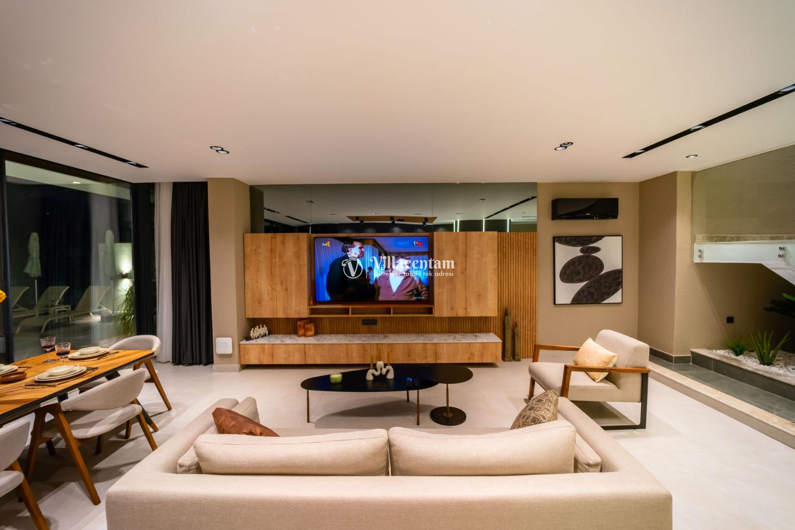 Geniş ve konforlu oturma odasında lüks oturma grubu, TV, sehpa ve klima gibi tüm temel olanaklar bulunmaktadır. Aydınlık salon, doğrudan havuz terasına açılan yapısıyla ferah bir yaşam alanı oluşturur.