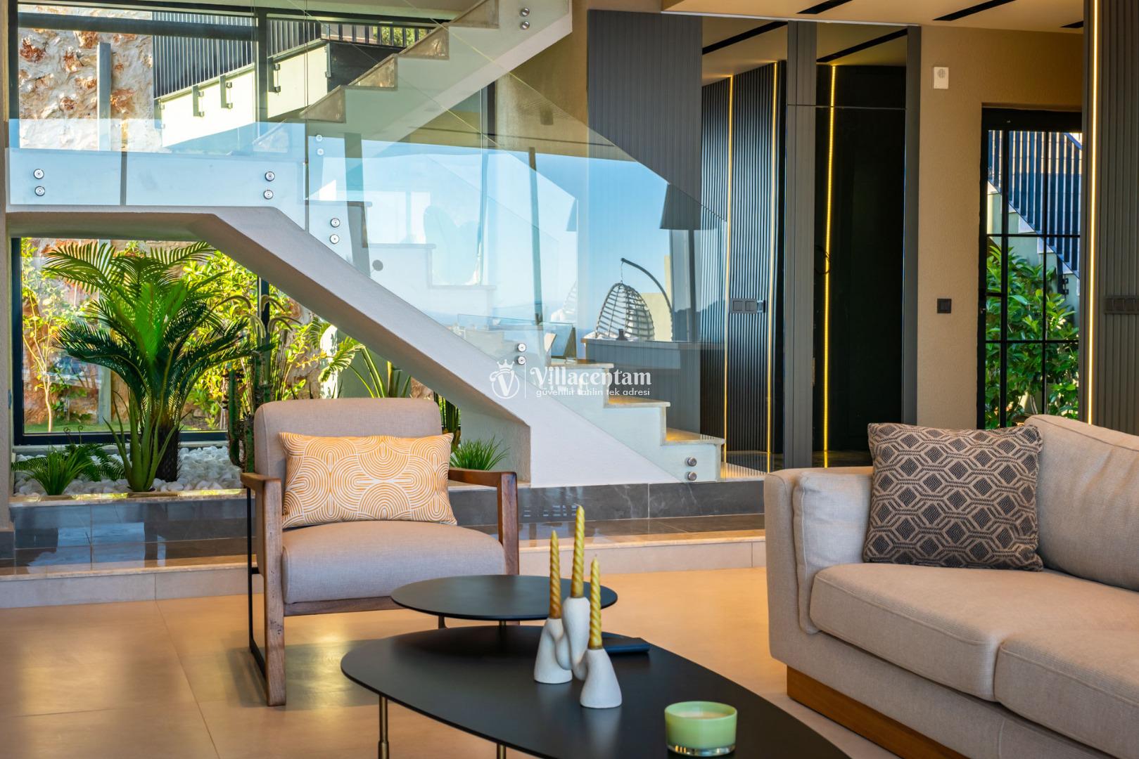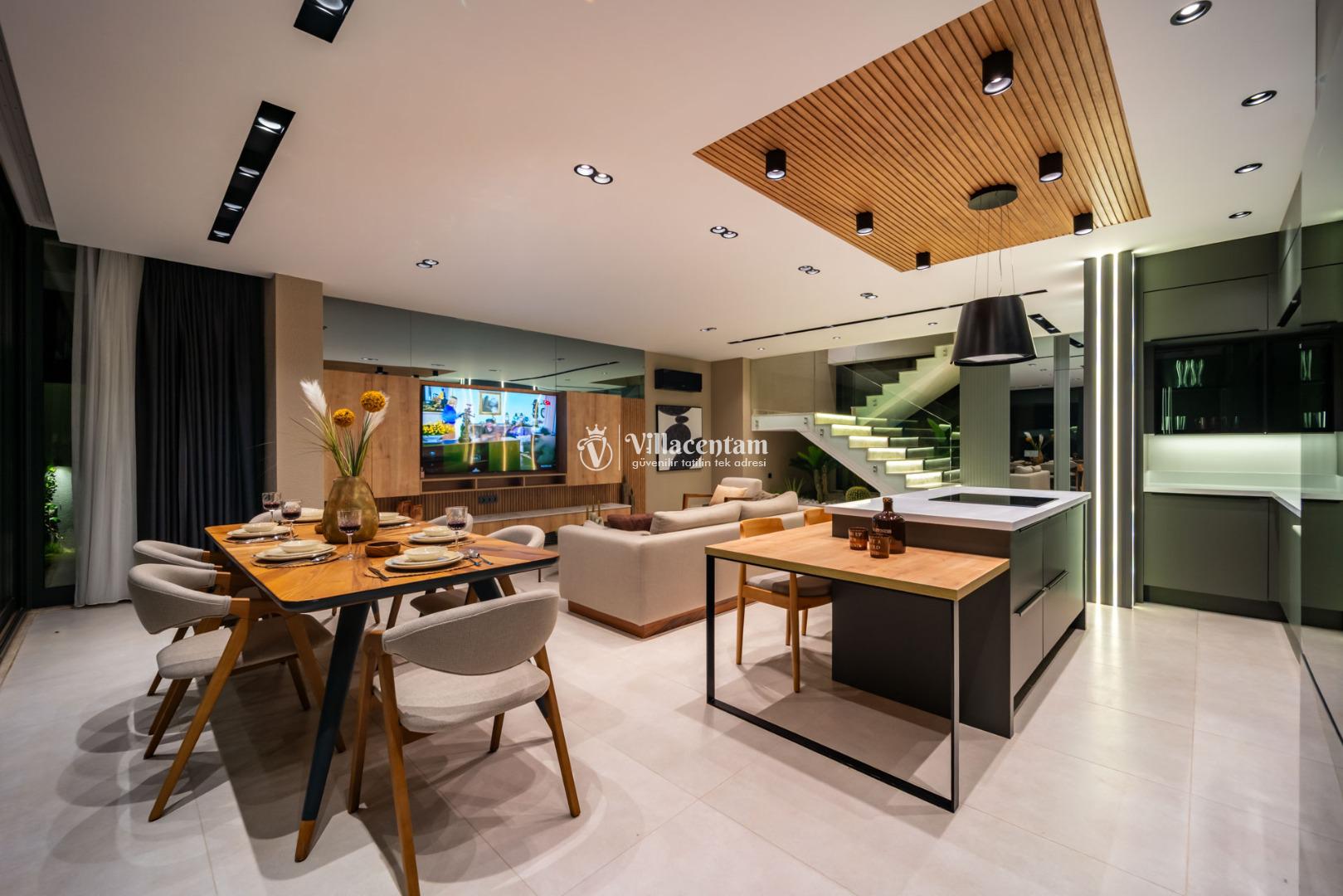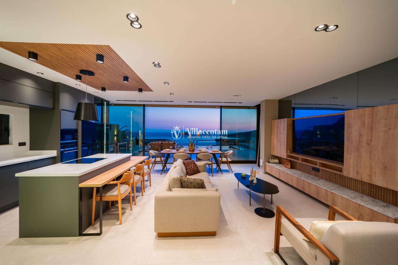 Geniş ve konforlu oturma odasında lüks oturma grubu, TV, sehpa ve klima gibi tüm temel olanaklar bulunmaktadır. Aydınlık salon, doğrudan havuz terasına açılan yapısıyla ferah bir yaşam alanı oluşturur.