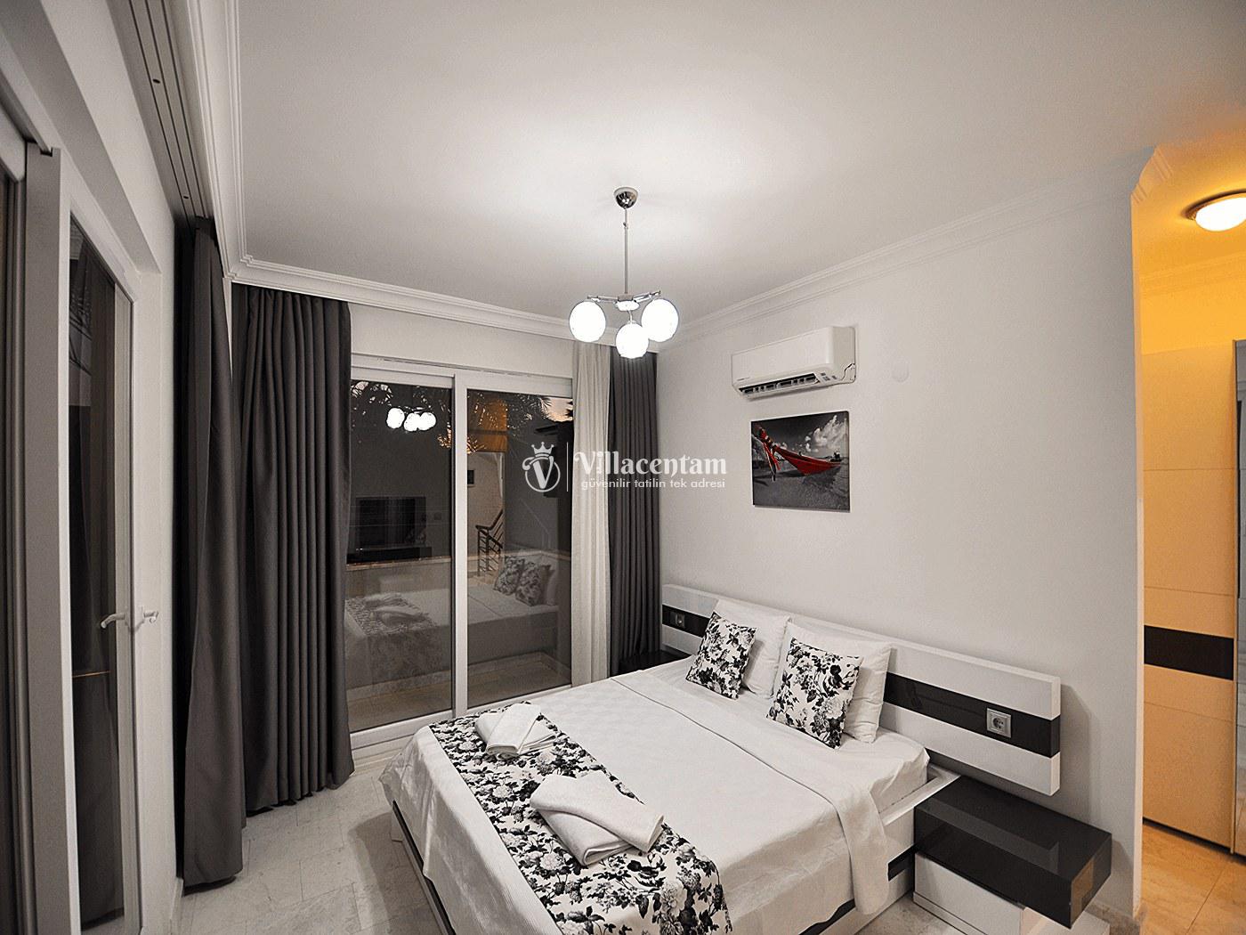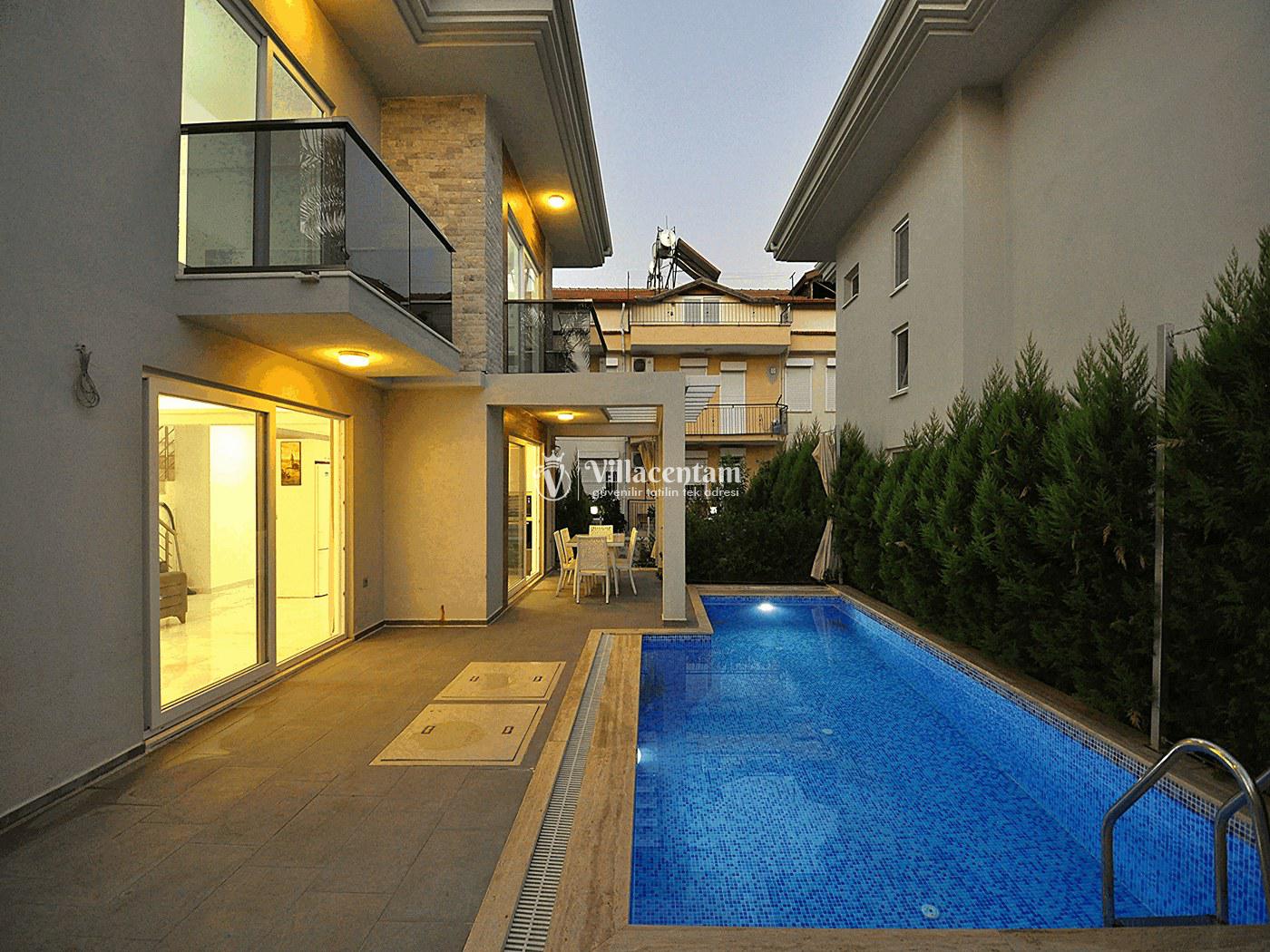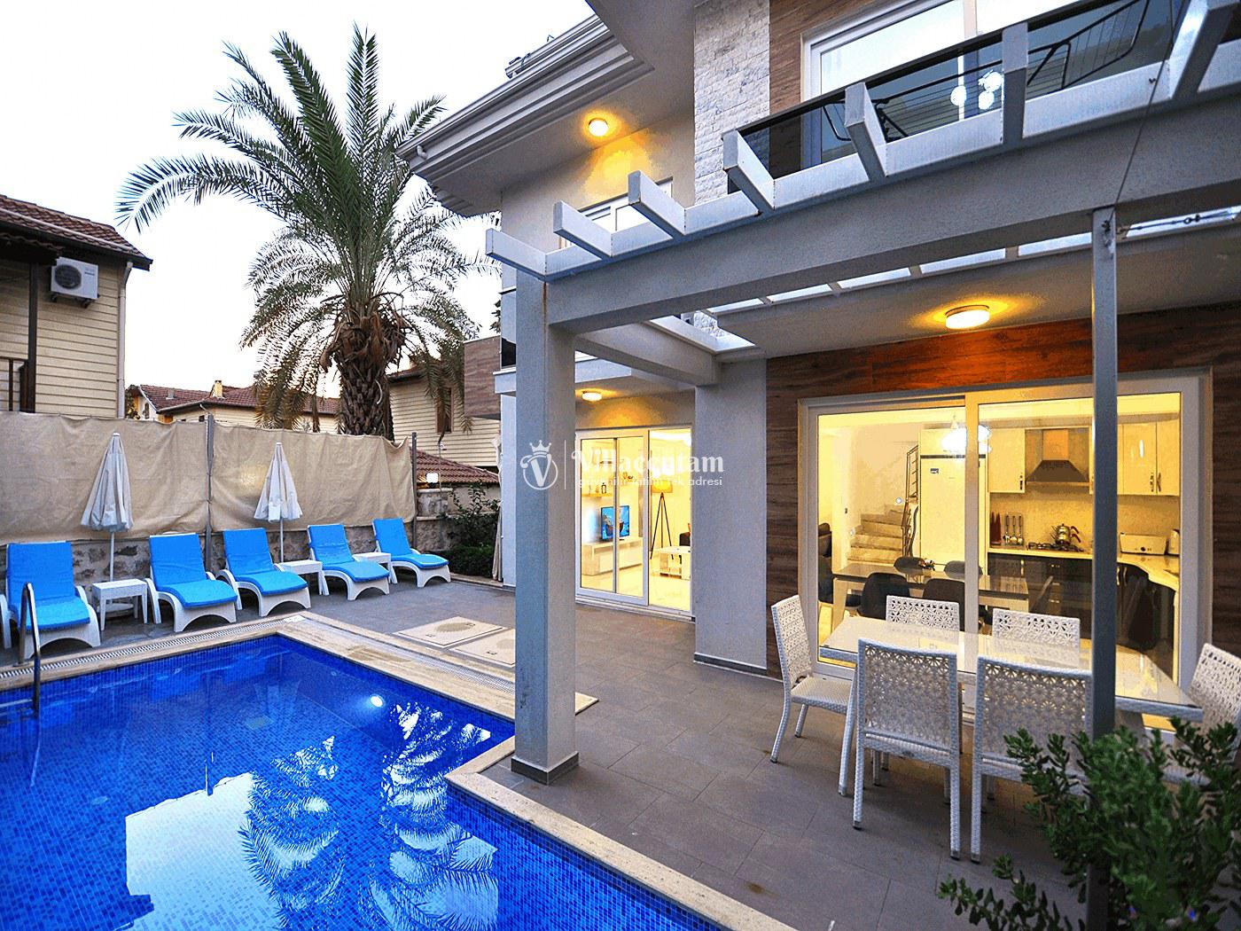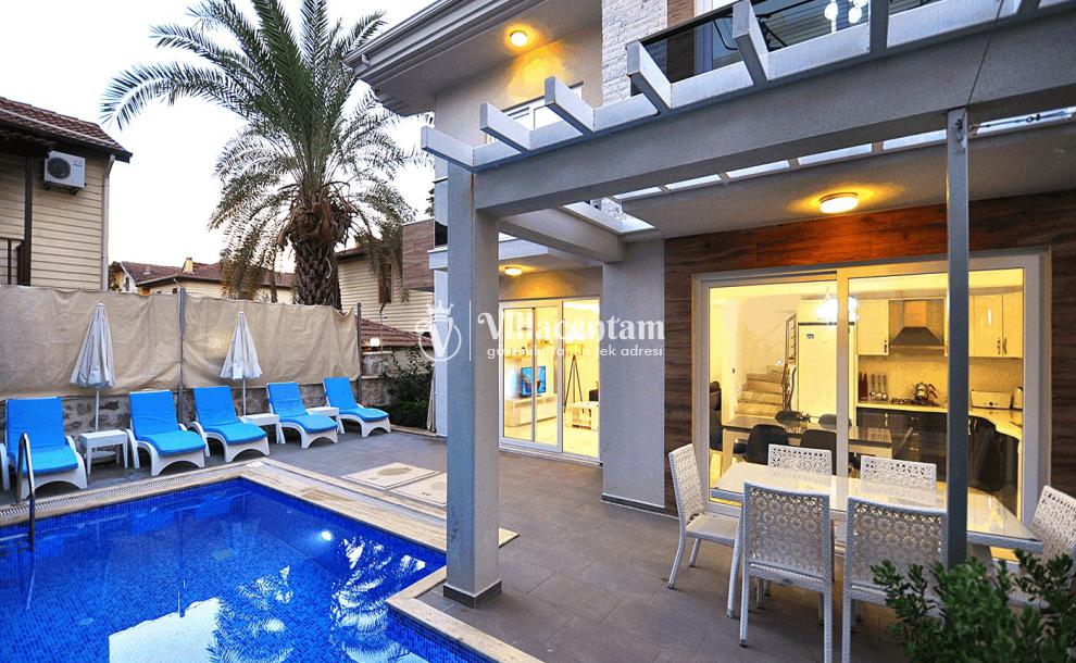 Fethiye’nin merkezi konumlarından birinde yer alan Villa Aydın, modern tasarımı ve özel yüzme havuzu ile hem kalabalık aileler hem de arkadaş grupları için ideal bir tatil seçeneğidir. 4 yatak odası ve 4 banyosu ile ferah bir yaşam alanı sunar ve toplamda 8 kişiye kadar konaklama kapasitesine sahiptir.