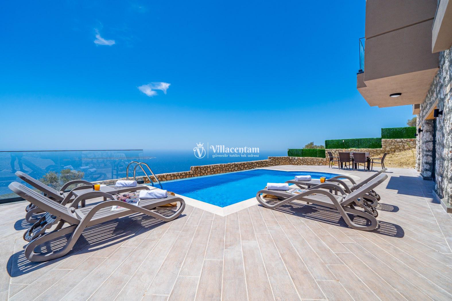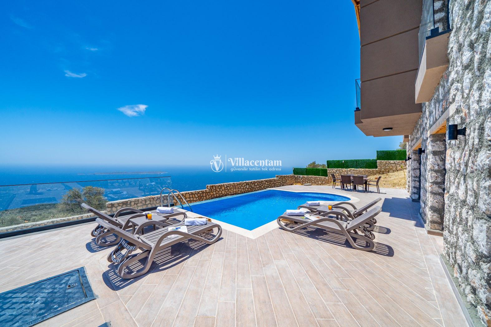 Villanın dış alanında yer alan özel yüzme havuzu ve geniş teras bölümü, deniz manzarasına karşı keyifli anlar yaşamanız için tasarlanmıştır. Havuz alanı korunaklı değildir; bu nedenle villa muhafazakâr hassasiyeti olmayan misafirler için uygundur. Güneşlenme alanları ve açık hava oturma bölümleri ile sevdiklerinizle birlikte unutulmaz tatil anları yaşayabilirsiniz.
