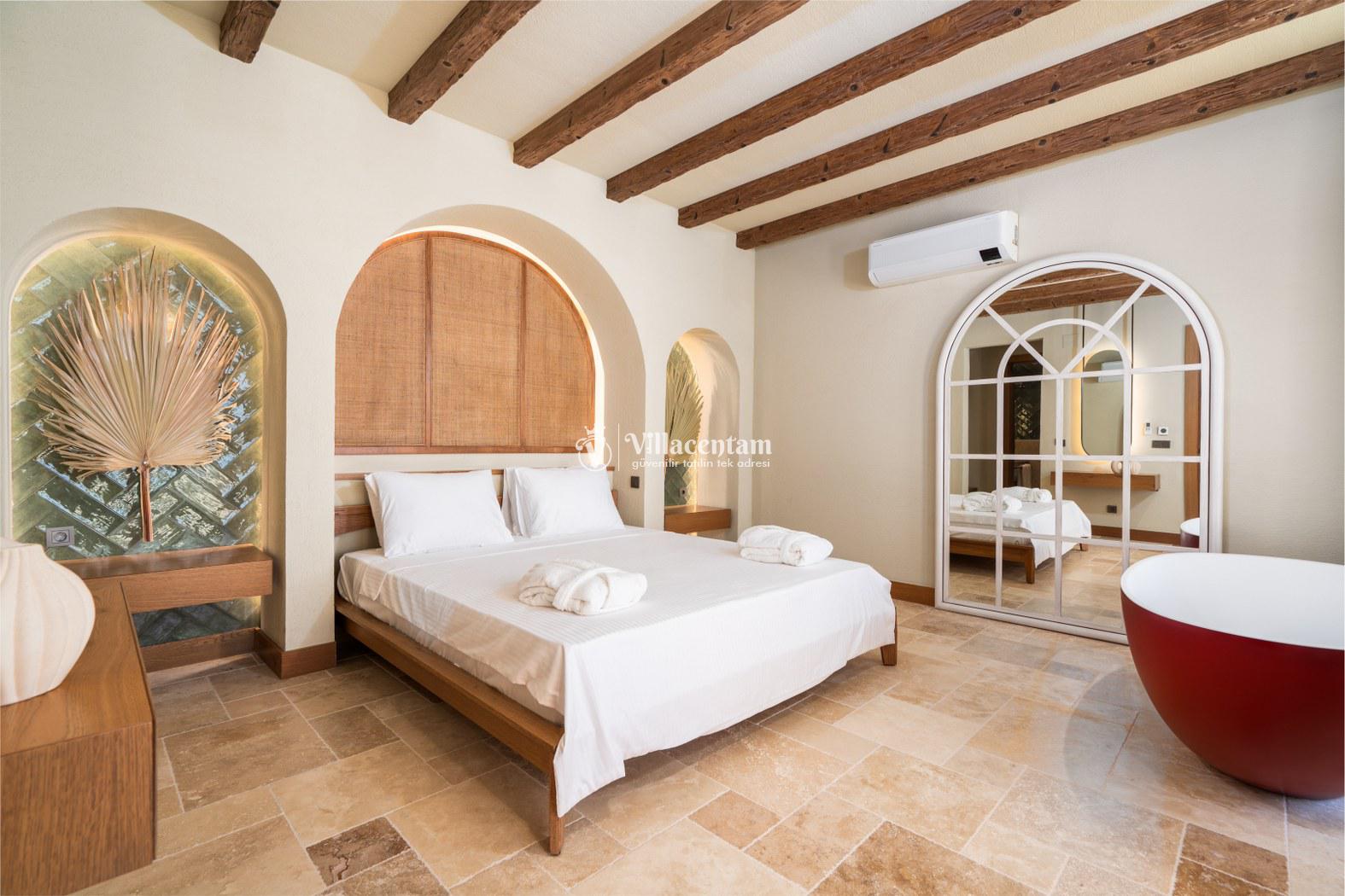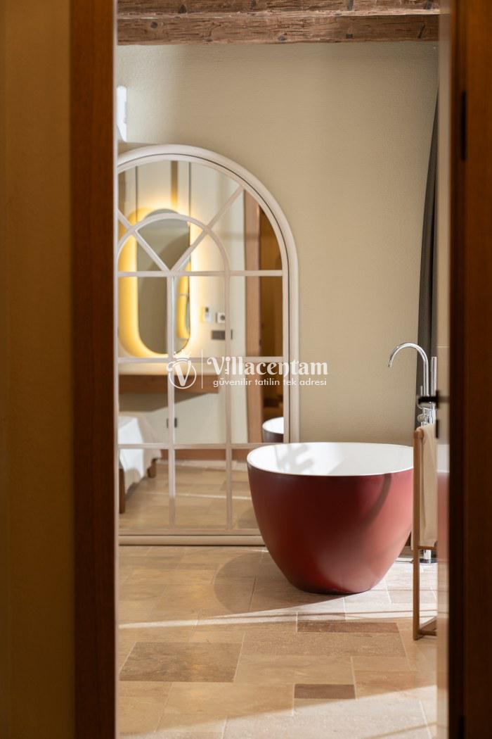 *Villalarda sıcak su için güneş enerjili su ısıtma sistemleri kullanılmaktadır. Çok yoğun sıcak su kullanımında, yoğunluğa ve su tankının büyüklüğüne bağlı olarak su tankında sıcak su tükenebilmekte ve tekrar suyun ısınması için belirli bir süre geçmesi gerekmektedir. Bu not sadece bu villa ile ilgili değil, tüm villalarımız için geçerli bir durumdur.