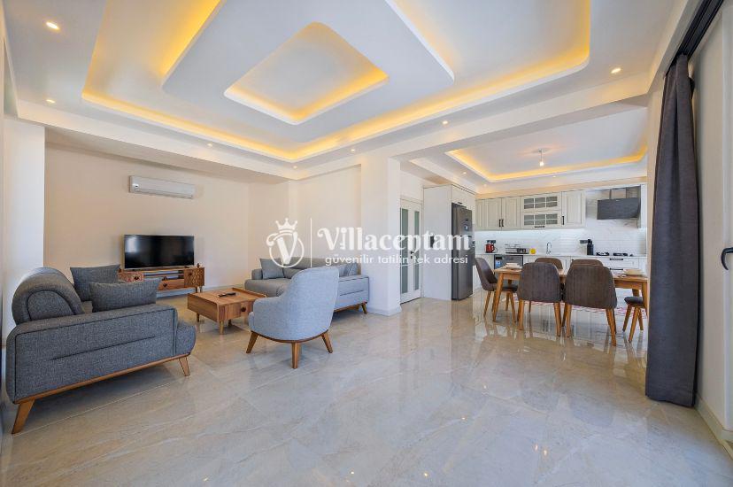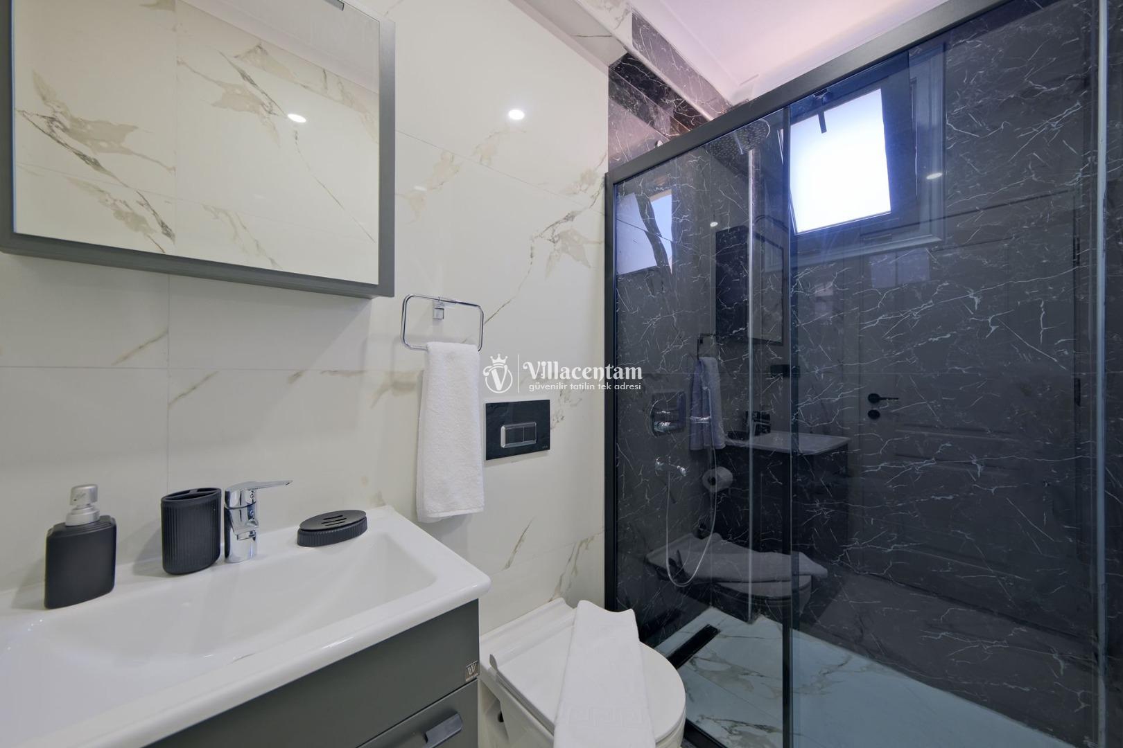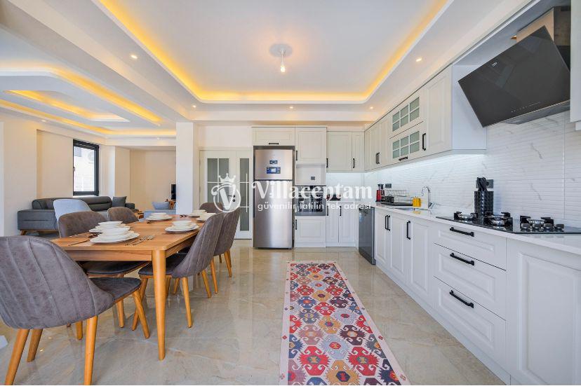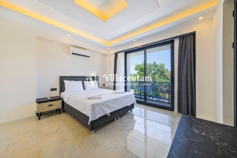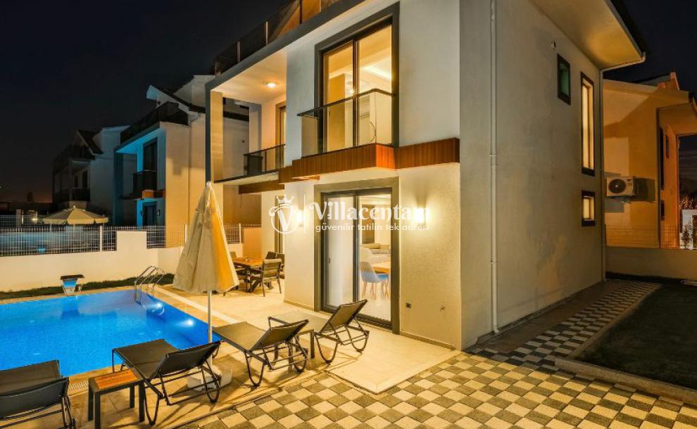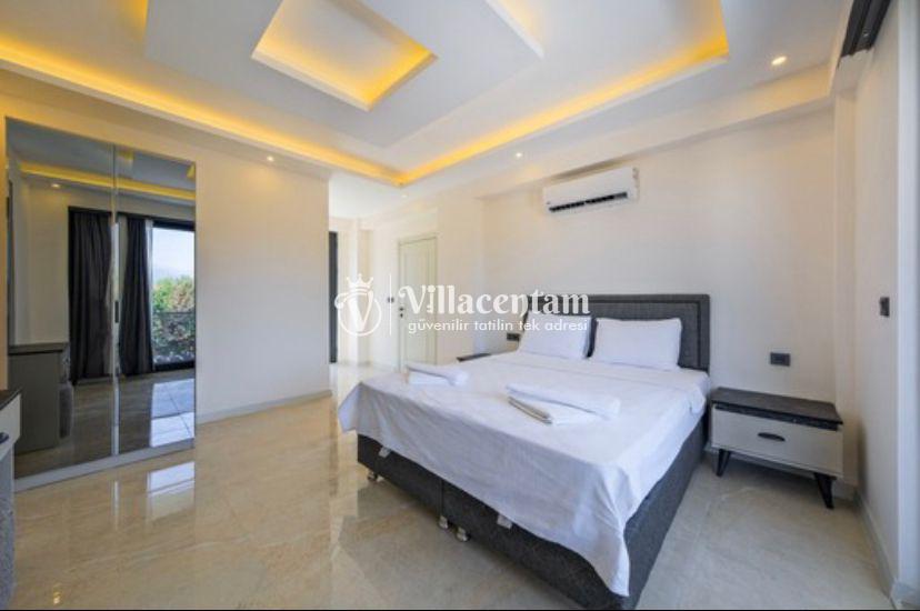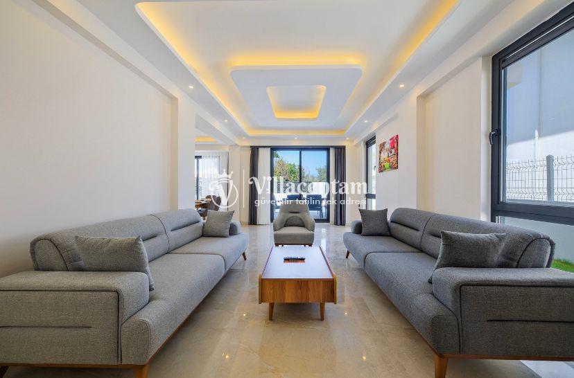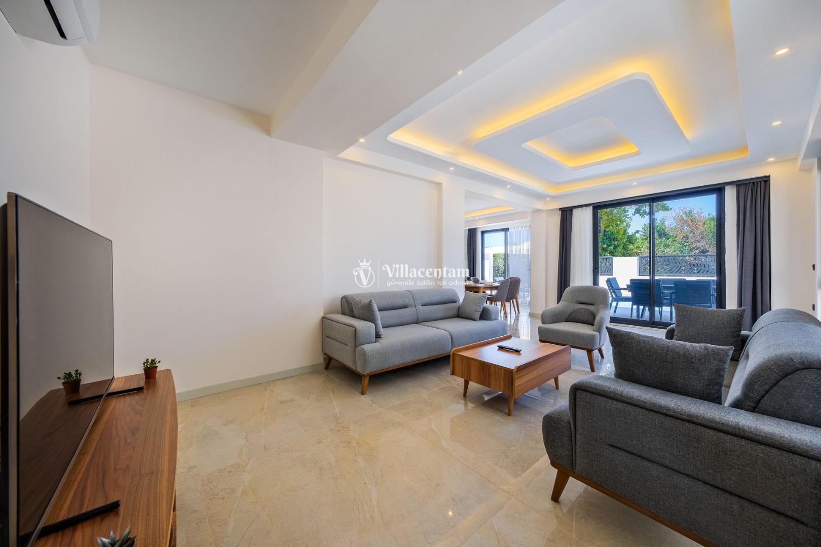 Villa içi ferah ve aydınlık yaşam alanlarına sahip olup, her yatak odasında ebeveyn banyosu bulunur; bu da konforlu ve özel bir konaklama imkanı sağlar. Geniş salon ve tam donanımlı mutfak, tatilinizi evinizdeymiş gibi geçirmenize yardımcı olur.