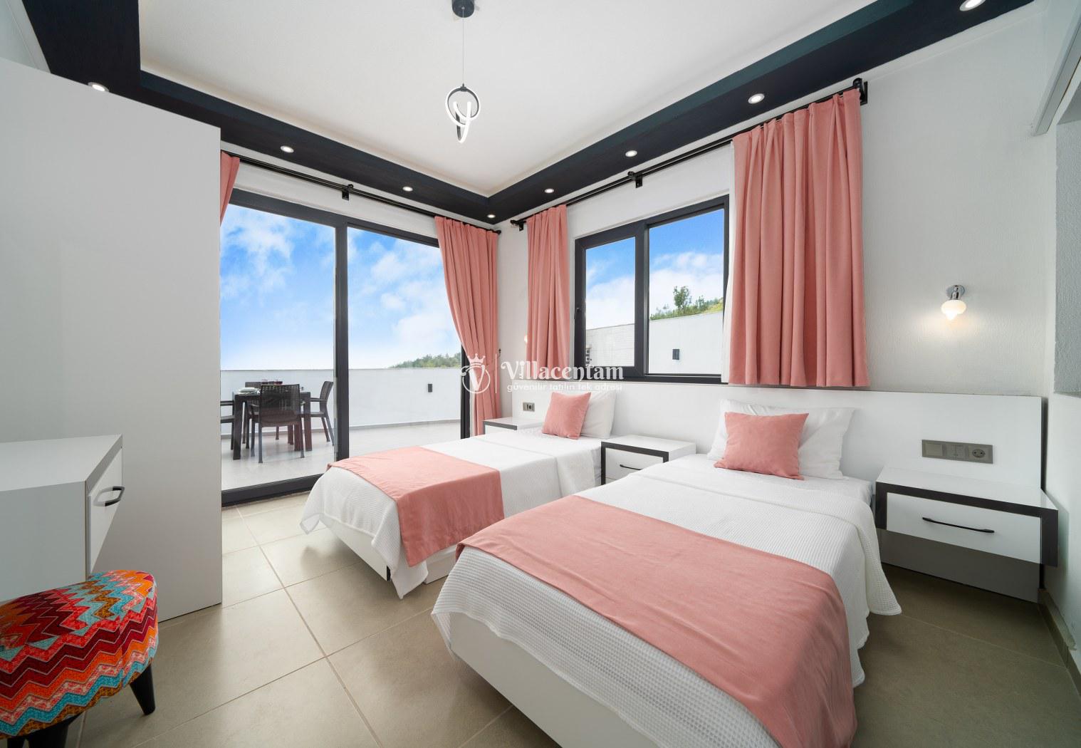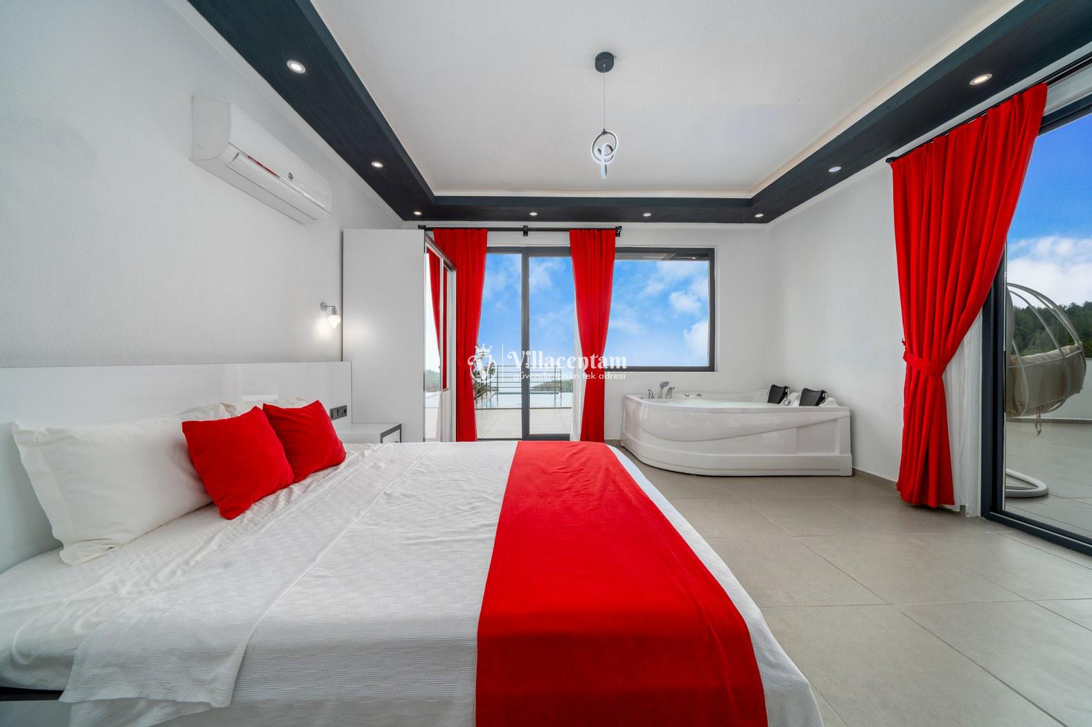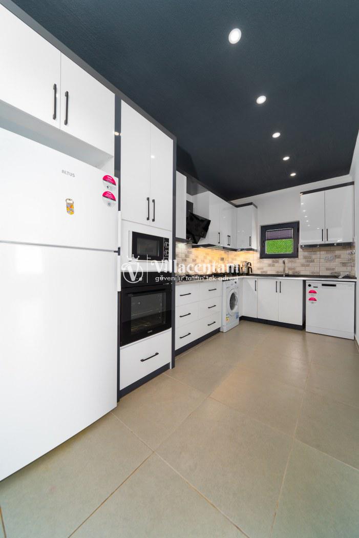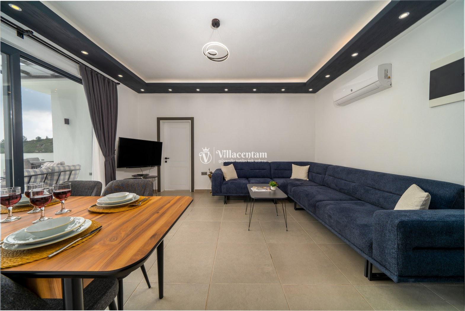 Villanın iç mekânı modern ve konforlu şekilde düzenlenmiştir. Açık plan salonu, tam donanımlı mutfağı ve yaşam alanları ile ev konforunda bir tatil deneyimi sağlar. Bir yatak odasında çift kişilik yatak ve jakuzi yer alırken, diğer odada iki adet tek kişilik yatak bulunmaktadır; her odada ebeveyn banyosu mevcuttur.
