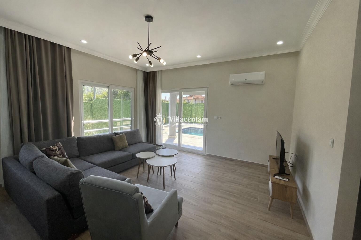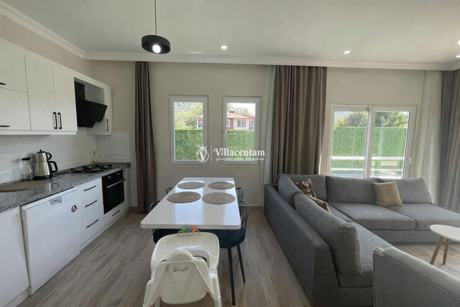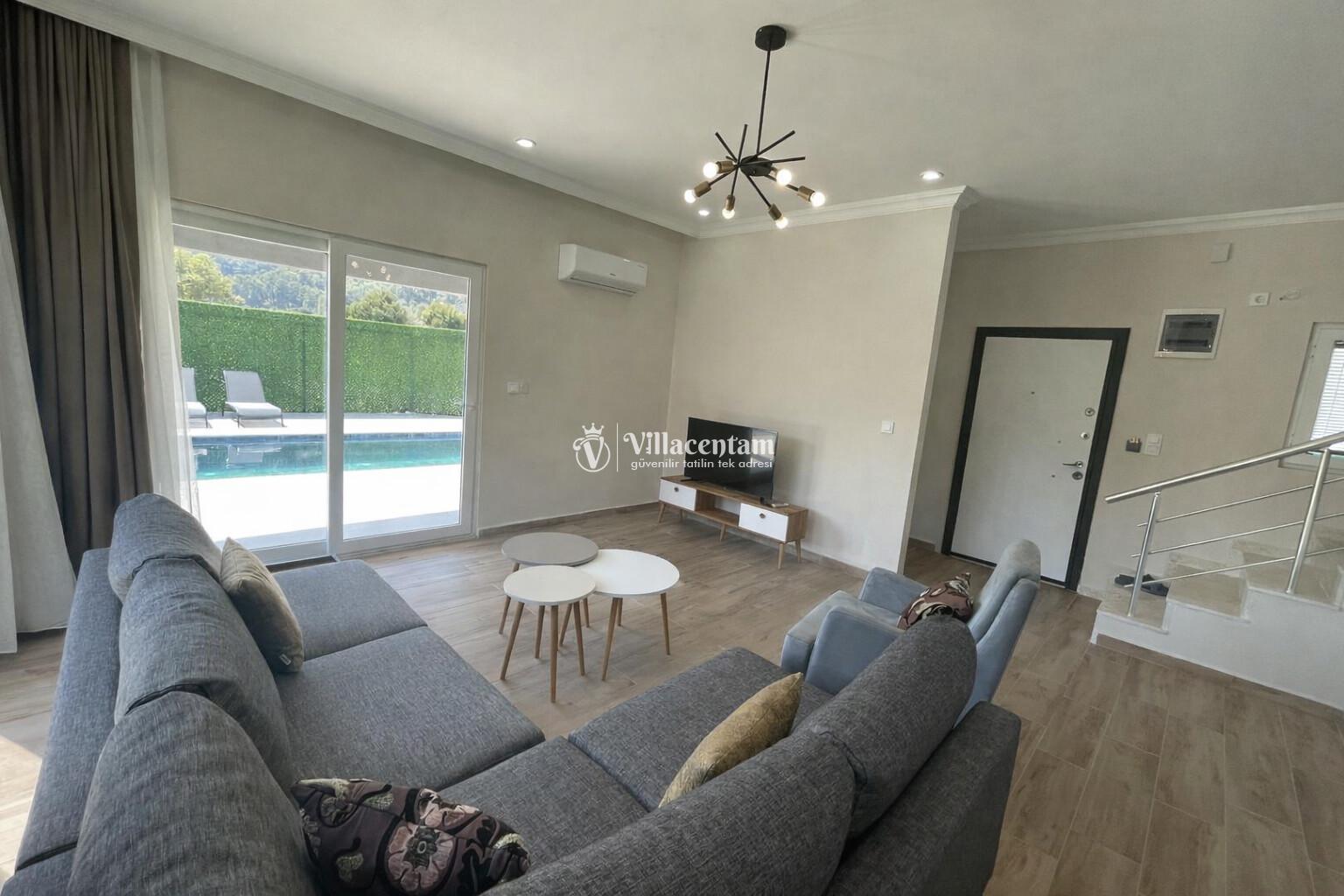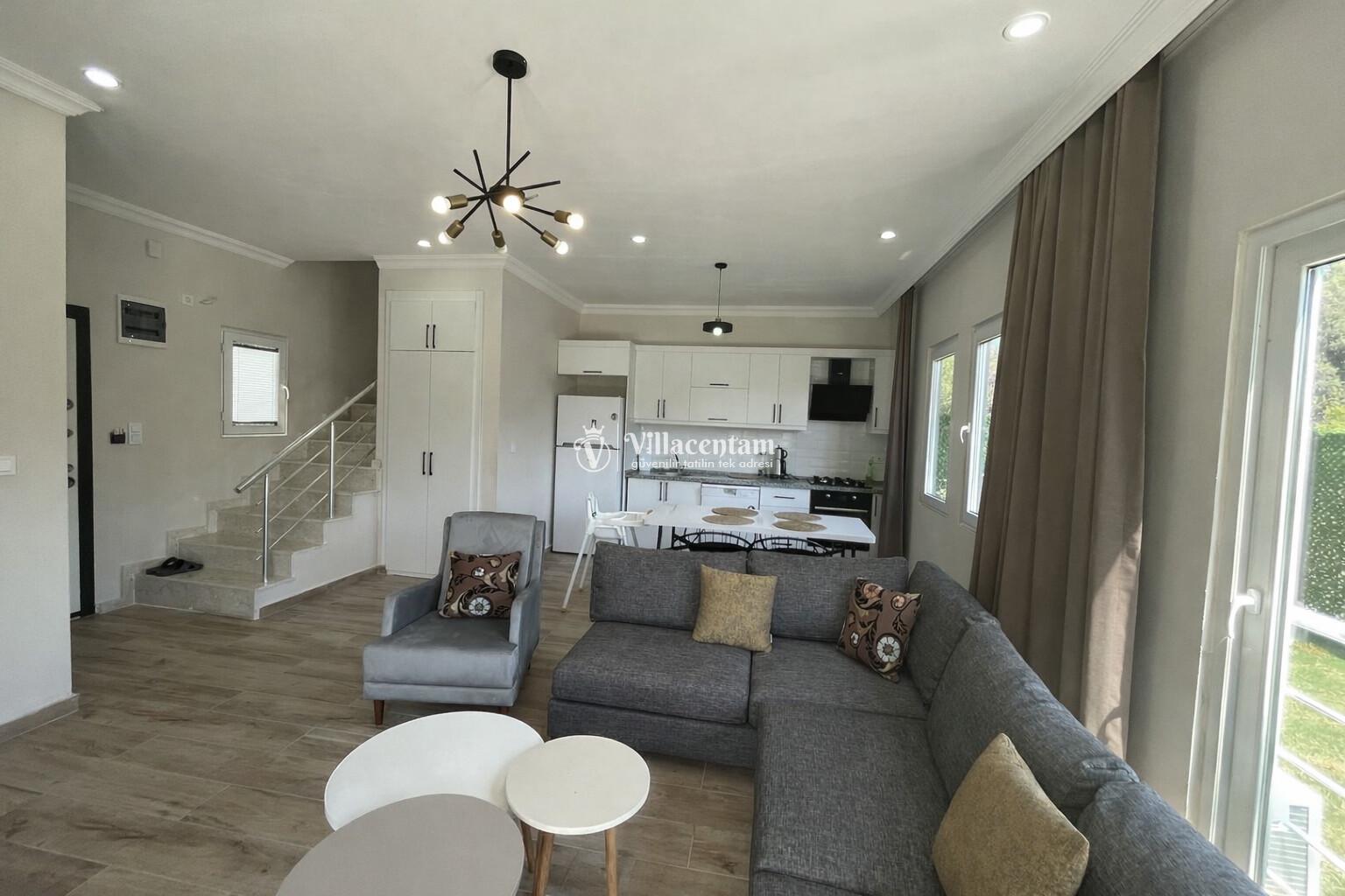 Villanın iç alanı modern ve ferah şekilde dizayn edilmiştir; konforlu salon, tam donanımlı mutfak ve estetik detaylarla tatilinizi unutulmaz kılar. Büyük pencereler sayesinde iç mekân doğal ışıkla aydınlanırken, keyifli vakit geçirmeniz için tüm gereksinimler düşünülmüştür.