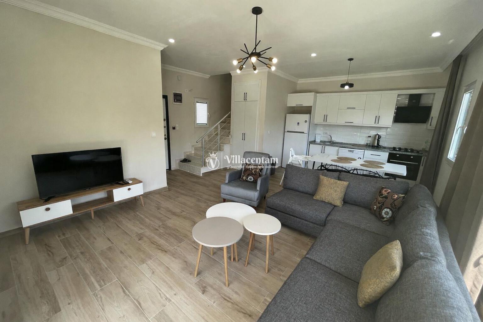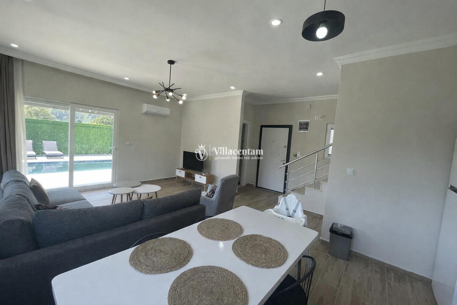 Villanın iç alanı modern ve ferah şekilde dizayn edilmiştir; konforlu salon, tam donanımlı mutfak ve estetik detaylarla tatilinizi unutulmaz kılar. Büyük pencereler sayesinde iç mekân doğal ışıkla aydınlanırken, keyifli vakit geçirmeniz için tüm gereksinimler düşünülmüştür.