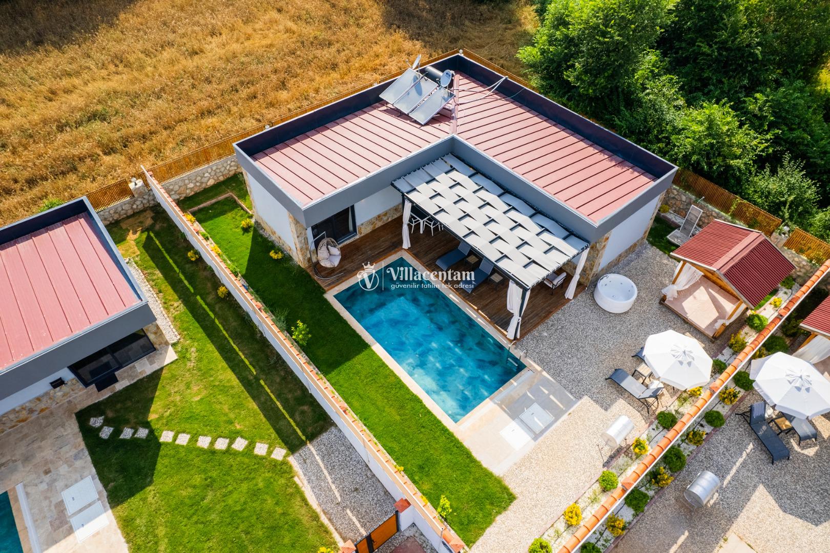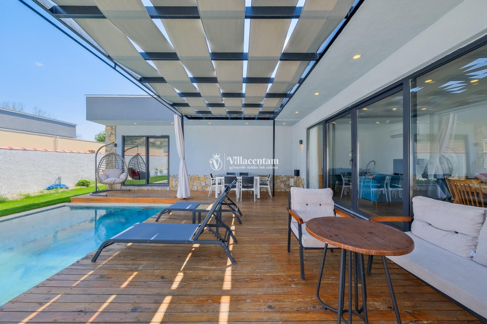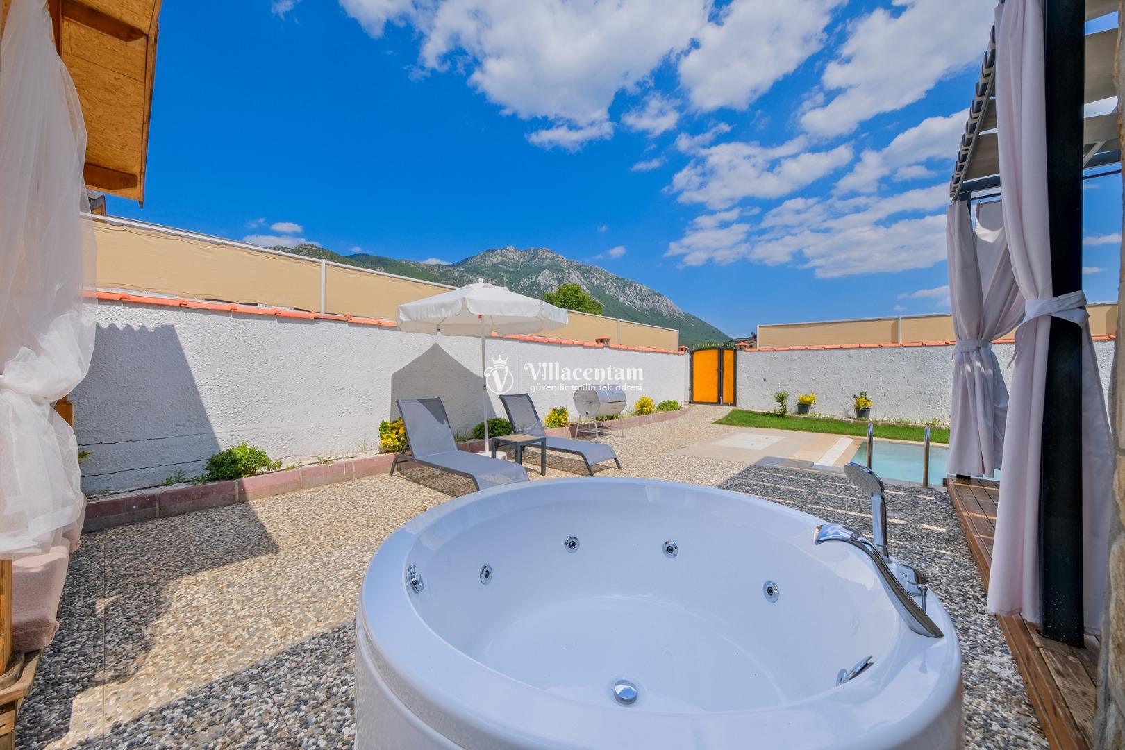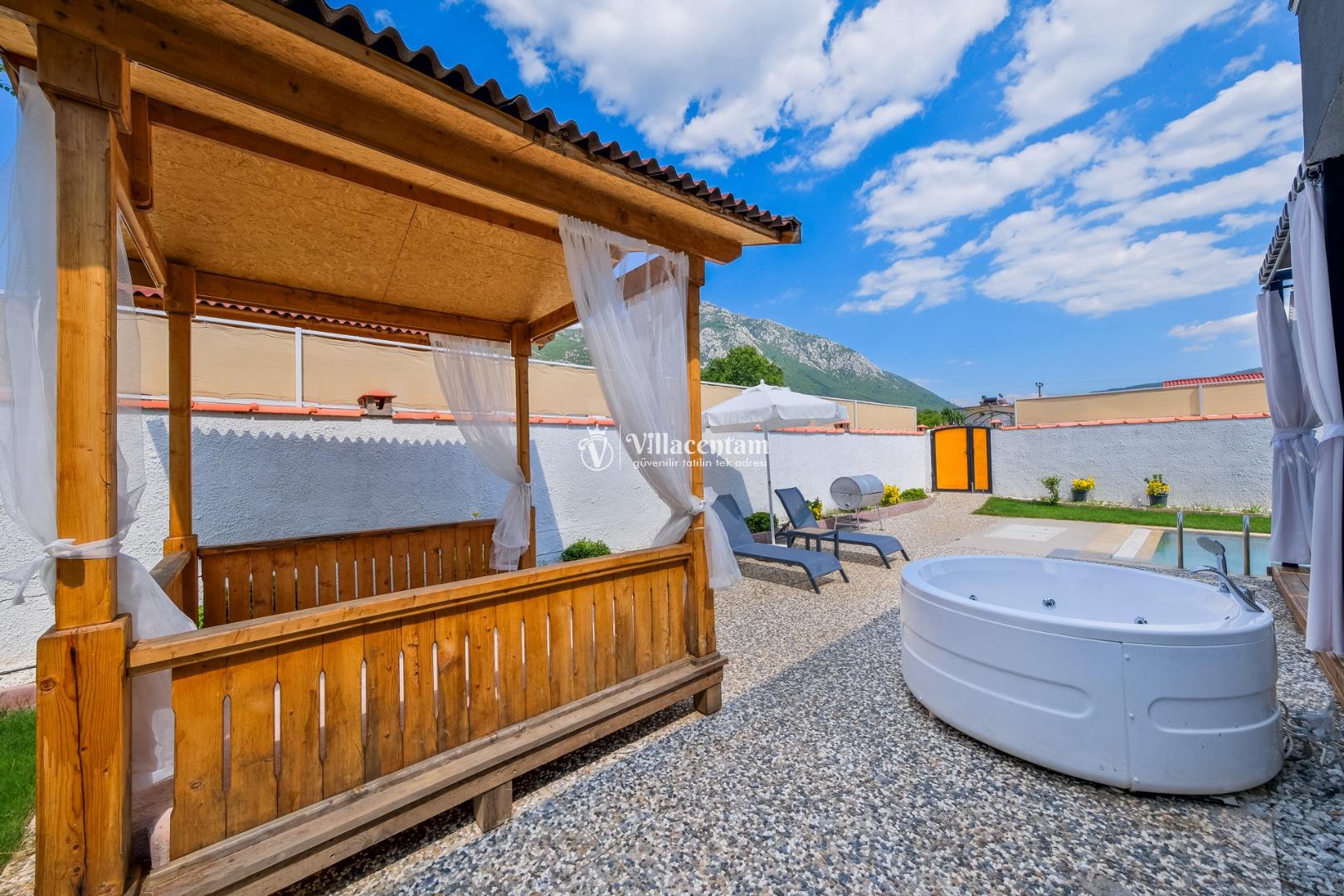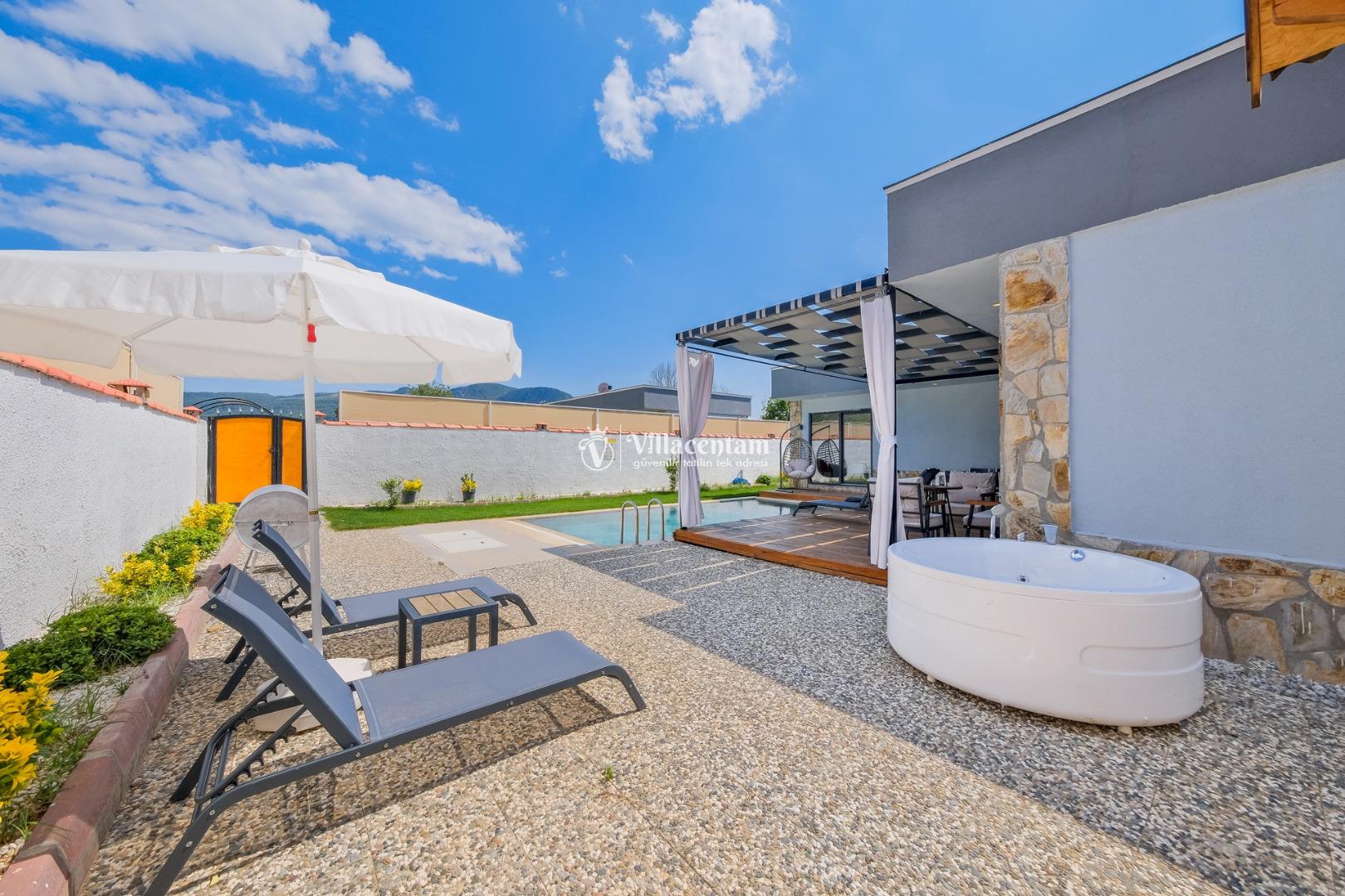 Villanın havuzu çevresiyle oldukça korunaklıdır, bu sayede gözlerden uzak, mahremiyet odaklı bir tatil deneyimi yaşarsınız. Bahçede yer alan jakuzi ve verandadaki kamelya; relax edeceğiniz, gün boyu doğanın tadını çıkaracağınız keyifli alanlar oluşturur.