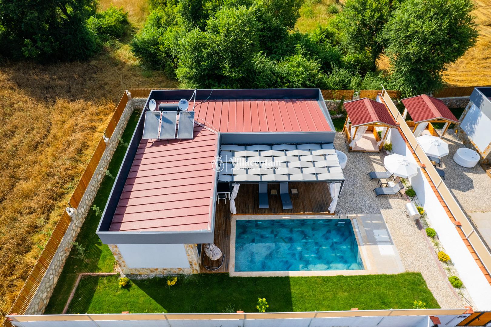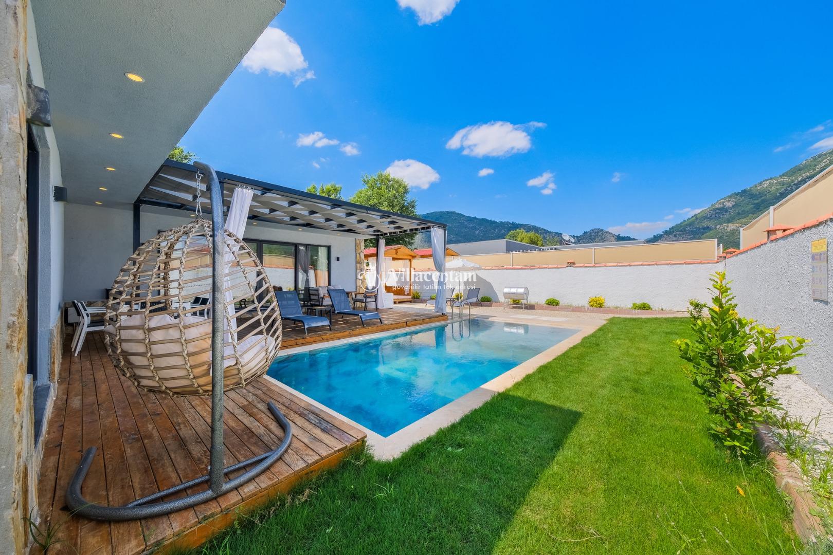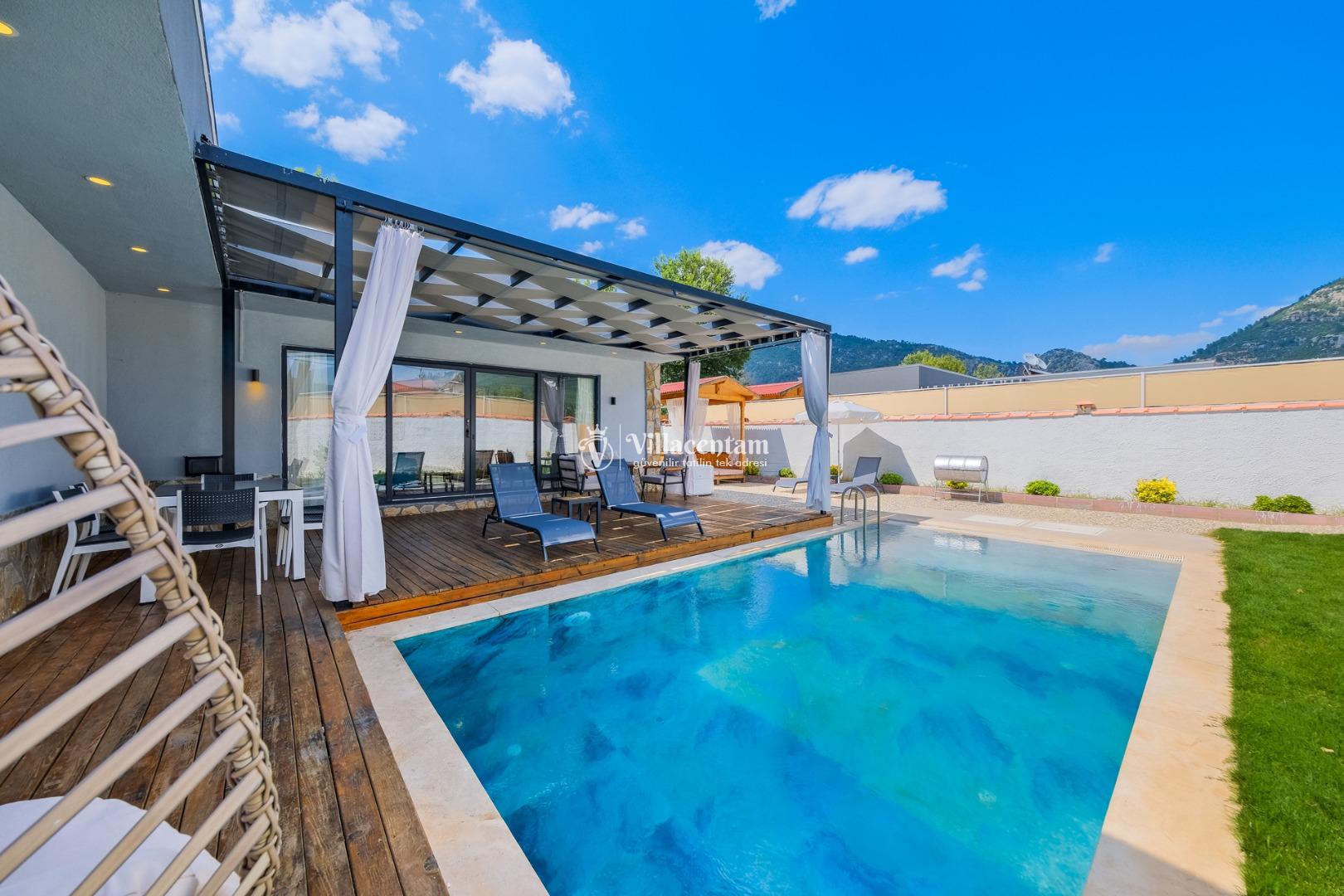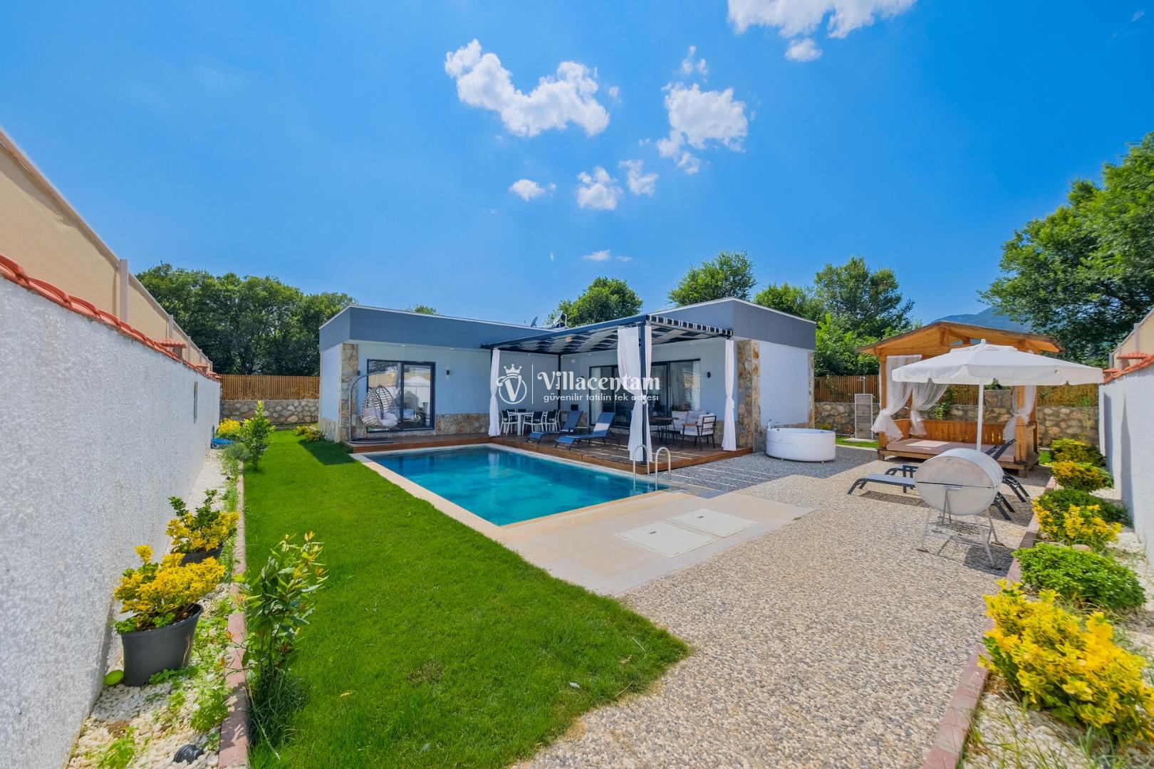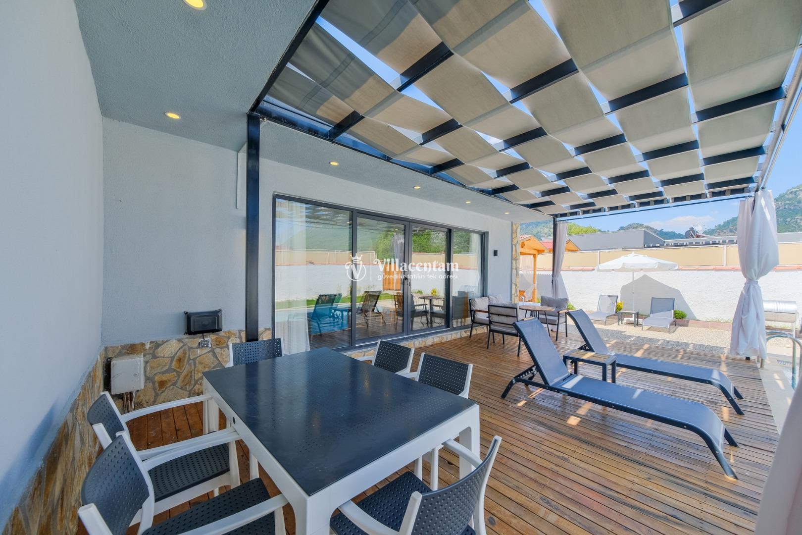Villanın havuzu çevresiyle oldukça korunaklıdır, bu sayede gözlerden uzak, mahremiyet odaklı bir tatil deneyimi yaşarsınız. Bahçede yer alan jakuzi ve verandadaki kamelya; relax edeceğiniz, gün boyu doğanın tadını çıkaracağınız keyifli alanlar oluşturur.