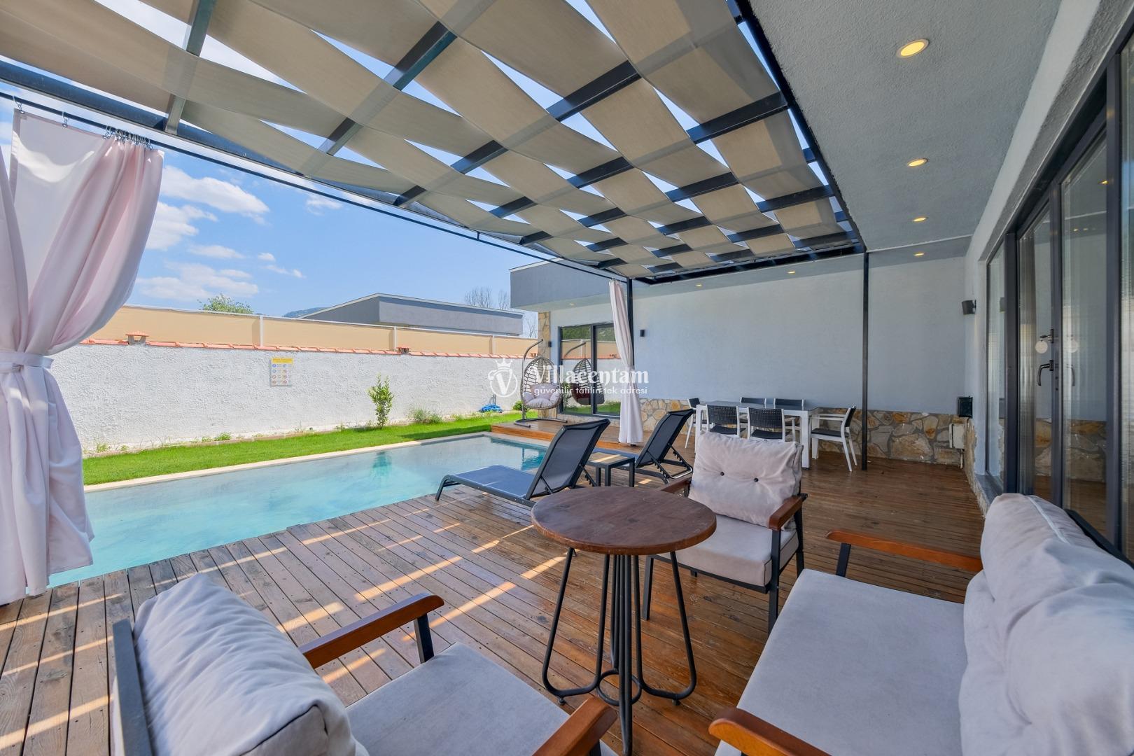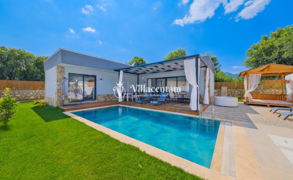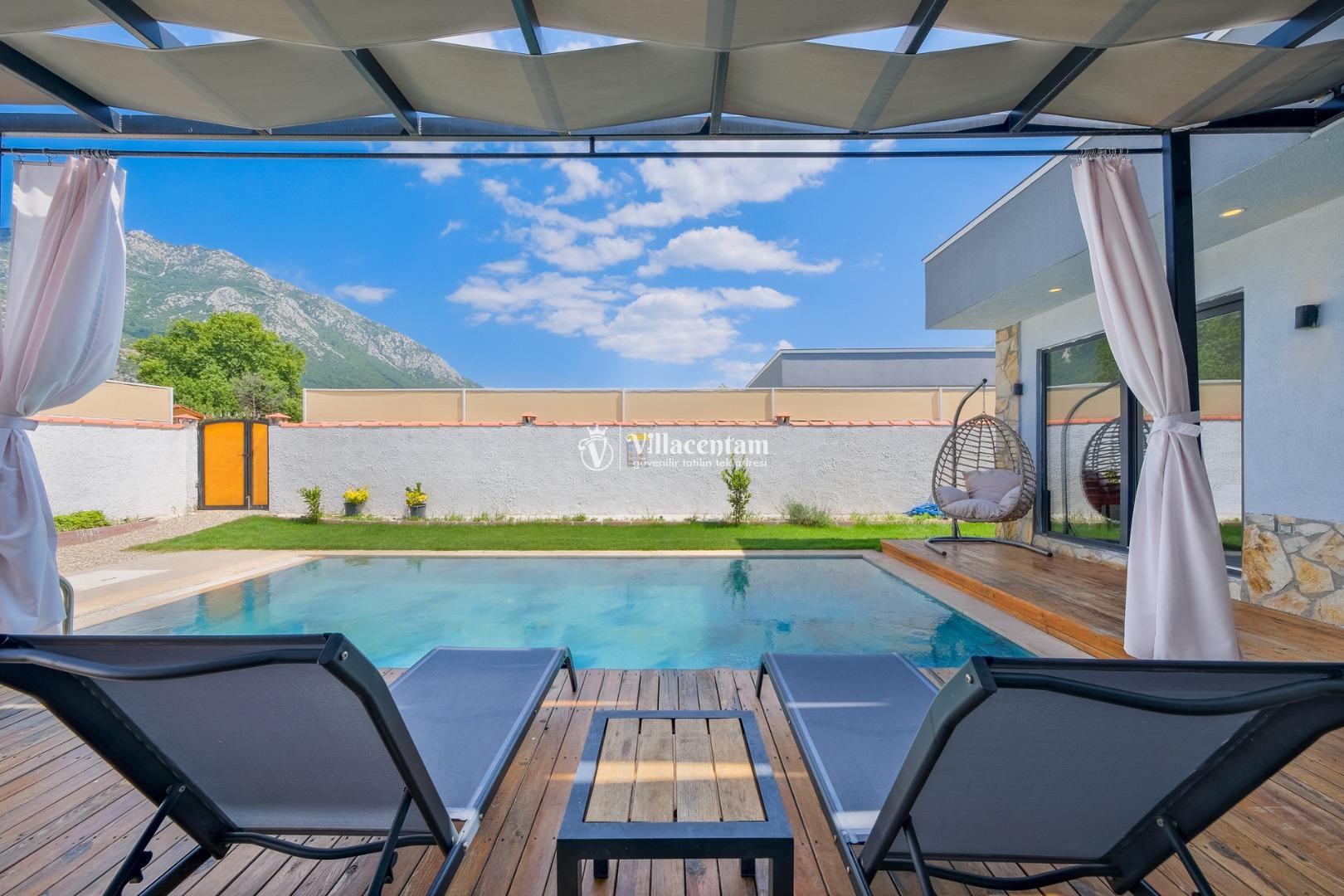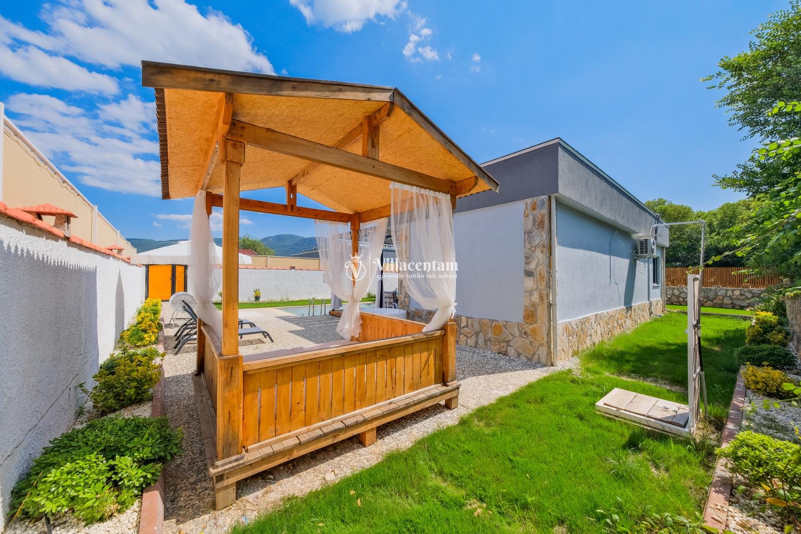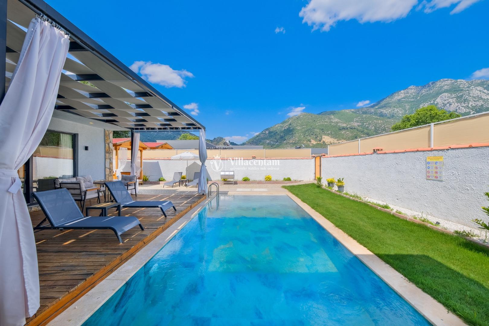Villanın havuzu çevresiyle oldukça korunaklıdır, bu sayede gözlerden uzak, mahremiyet odaklı bir tatil deneyimi yaşarsınız. Bahçede yer alan jakuzi ve verandadaki kamelya; relax edeceğiniz, gün boyu doğanın tadını çıkaracağınız keyifli alanlar oluşturur.
