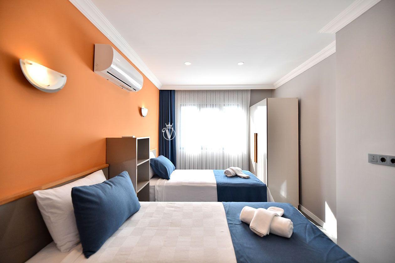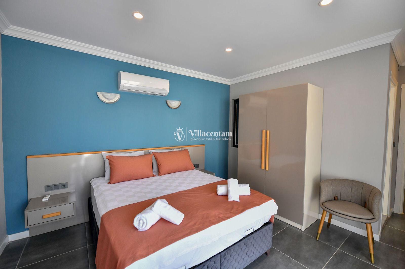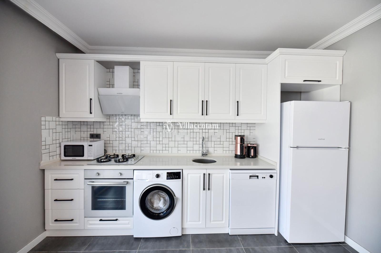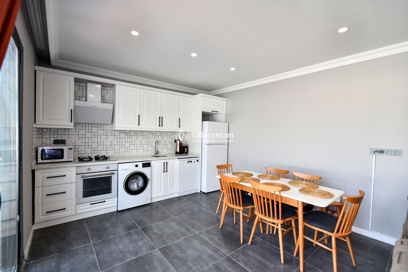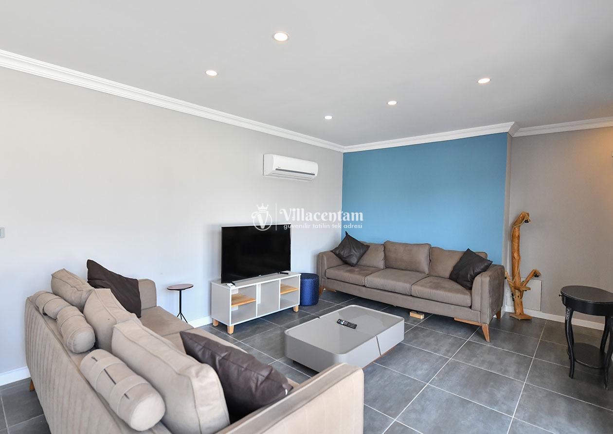 İç mekânda klima ile donatılmış salon, tam donanımlı mutfak, TV ve modern yaşam unsurları konforlu bir konaklama sunar. Yatak odalarından biri ebeveyn banyolu olup, rahat uyku ve pratik kullanım sağlar.