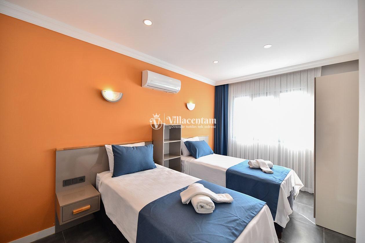 *Villalarda sıcak su için güneş enerjili su ısıtma sistemleri kullanılmaktadır. Çok yoğun sıcak su kullanımında, yoğunluğa ve su tankının büyüklüğüne bağlı olarak su tankında sıcak su tükenebilmekte ve tekrar suyun ısınması için belirli bir süre geçmesi gerekmektedir. Bu not sadece bu villa ile ilgili değil, tüm villalarımız için geçerli bir durumdur.