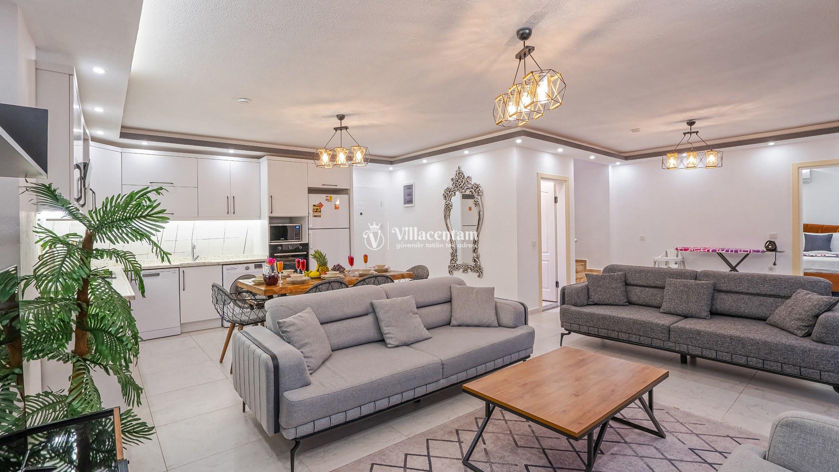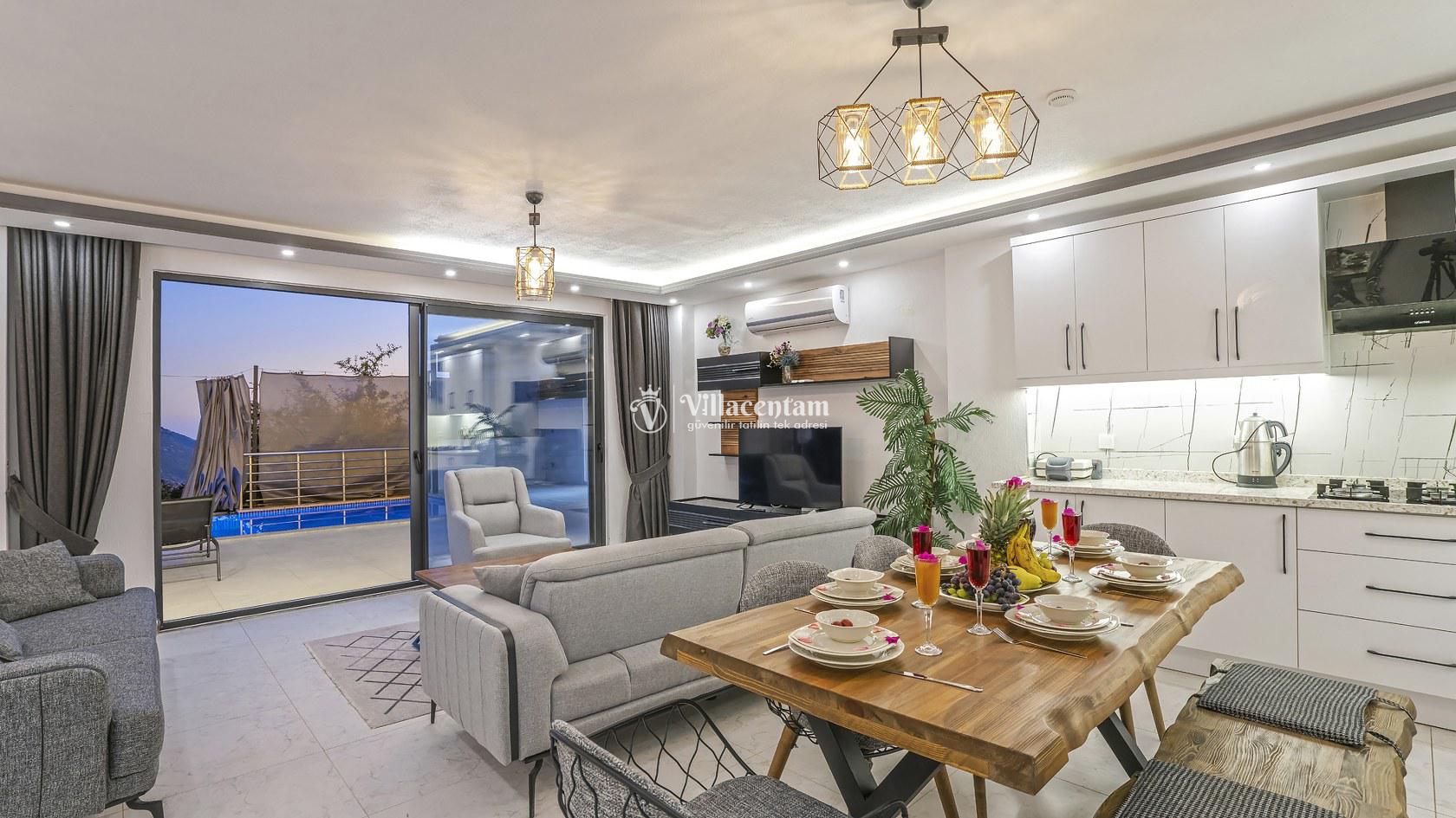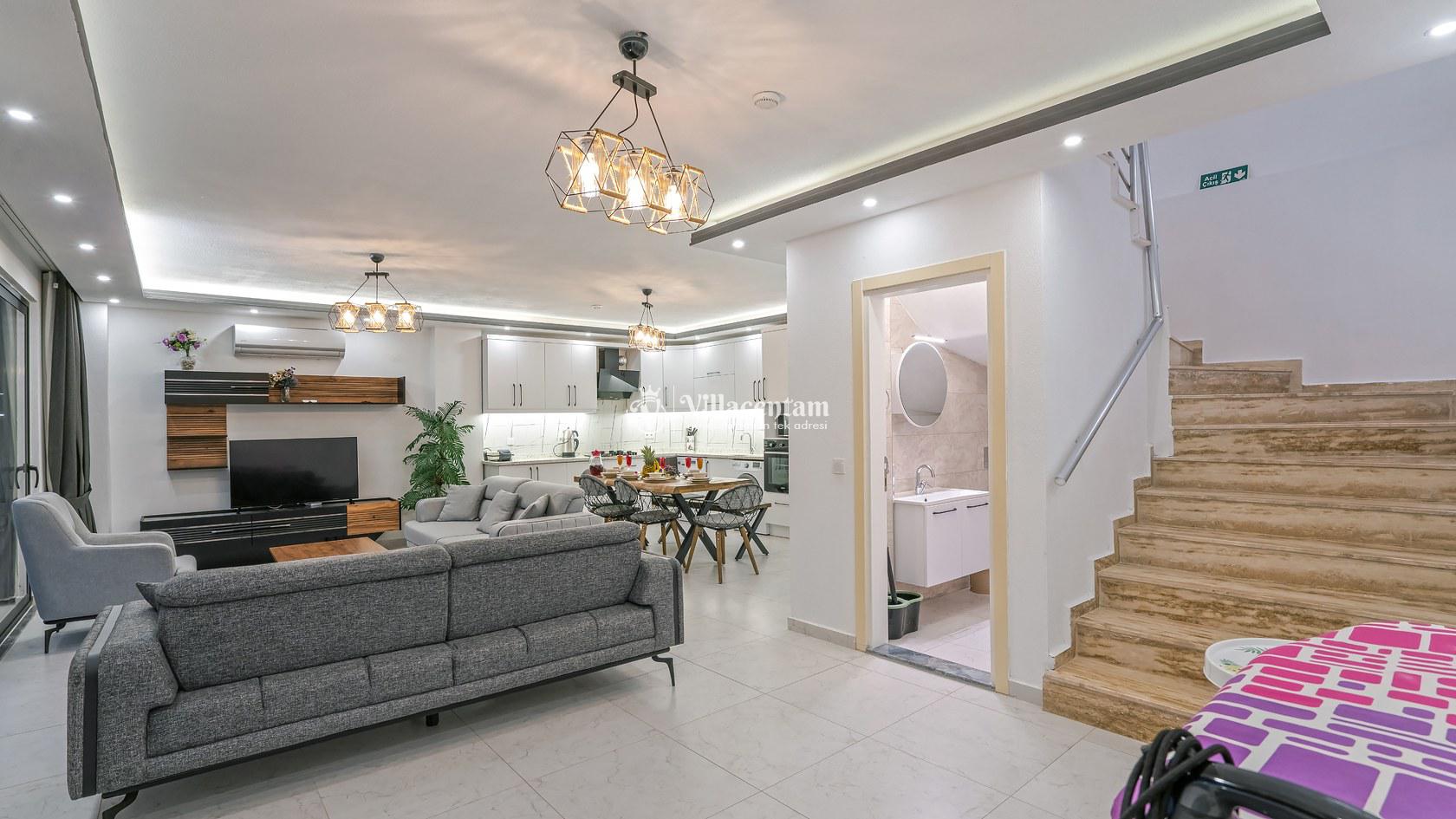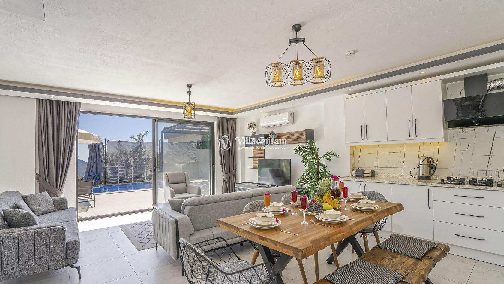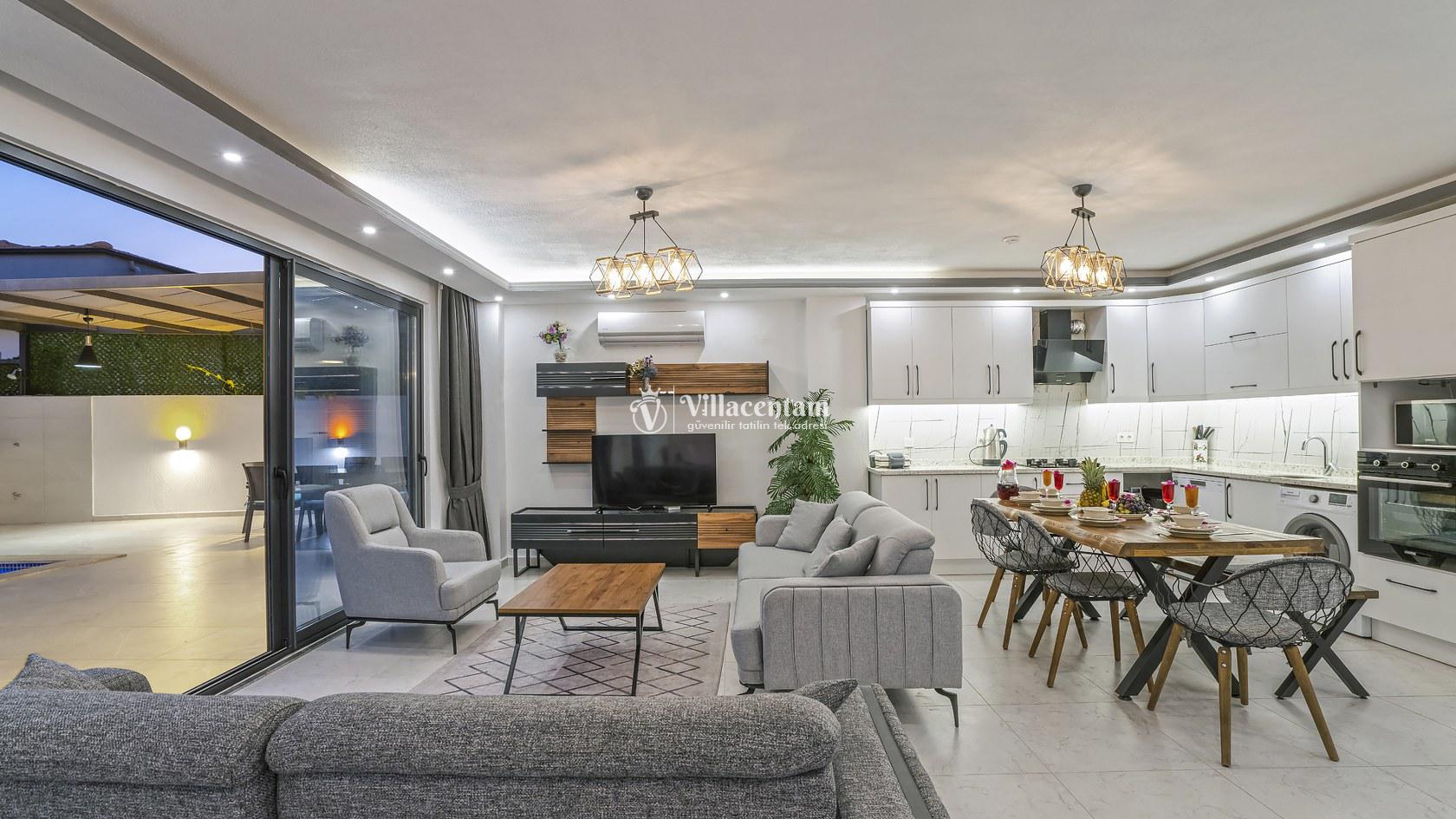 Modern mimari anlayışıyla tasarlanan villamız, geniş ve ferah yaşam alanlarına sahiptir. Gri tonların hâkim olduğu şık salon bölümünün hemen arkasında, aynı renk konseptiyle dizayn edilmiş tam donanımlı açık mutfak yer almaktadır. Ailenizle veya sevdiklerinizle keyifli vakit geçirebileceğiniz konforlu bir iç mekân sunulmuştur.