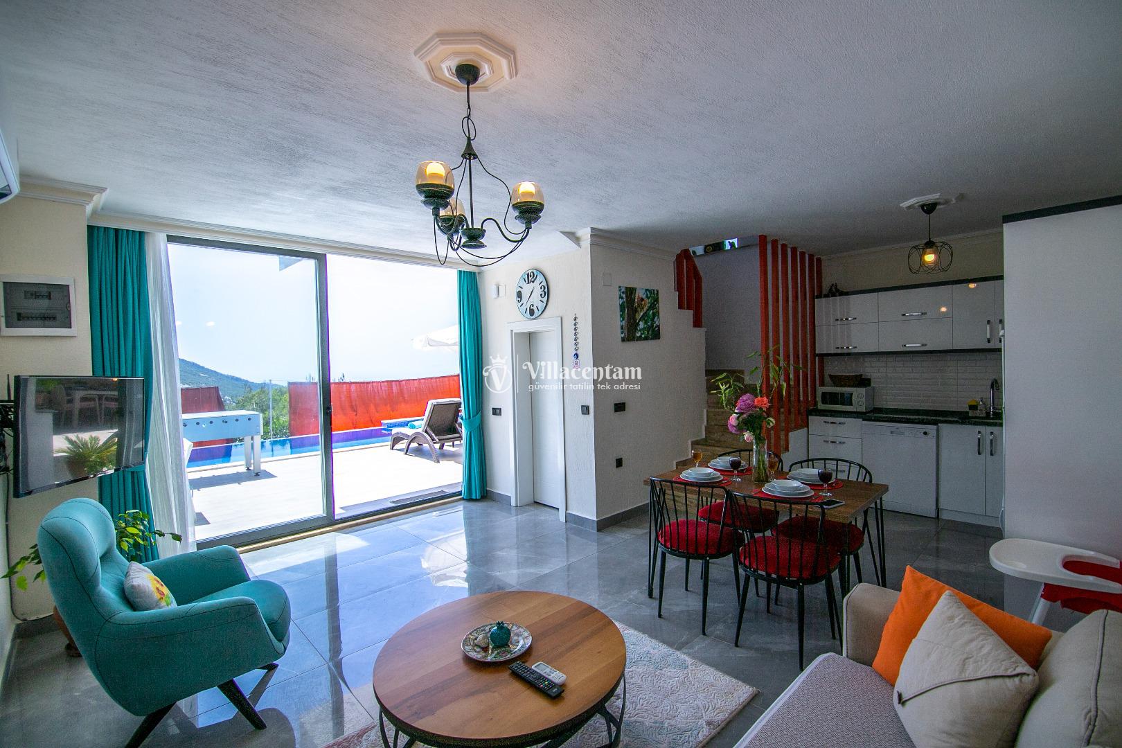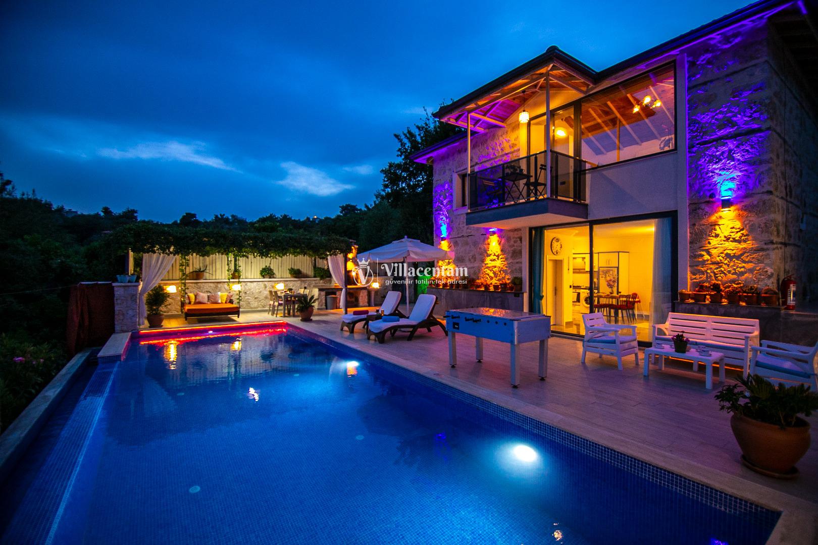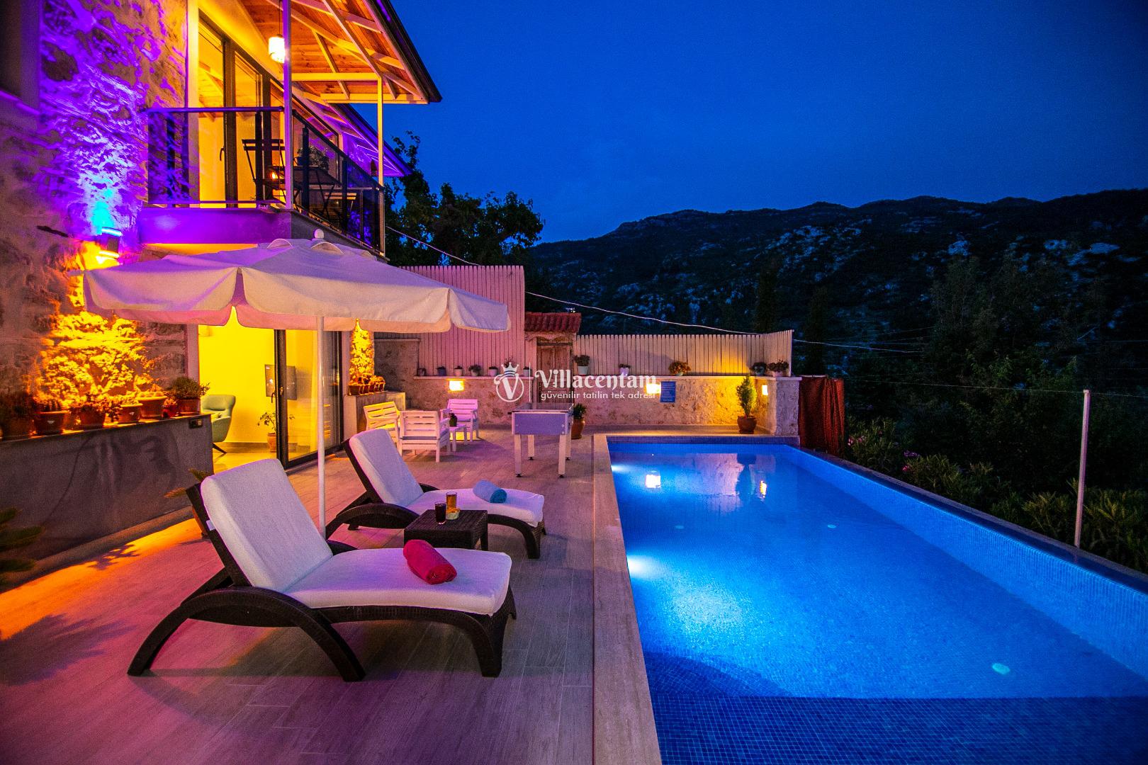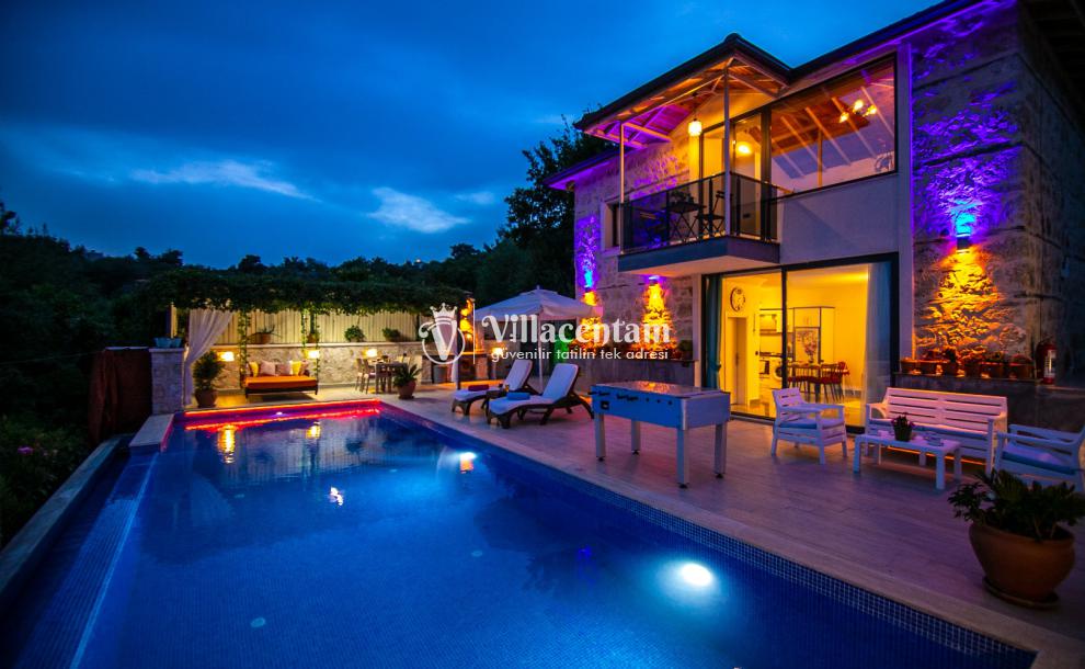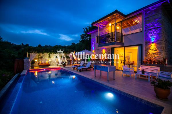 Villa Dia, Antalya’nın huzur dolu tatil bölgesi Kalkan’ın doğal güzellikleriyle öne çıkan İslamlar Köyü’nde yer alan özel bir balayı ve romantik tatil villasıdir. Eski bir taş evden modern konforla restore edilerek ortaya çıkan bu eşsiz villa, yalnızca 1 yatak odası ve 2 kişilik konaklama kapasitesi ile özellikle balayı çiftleri ve romantizm arayan misafirler için tasarlanmıştır. Villanın konumu Kalkan adalarına ve deniz manzarasına hâkim olup gün batımının tadını çıkarabileceğiniz bir atmosfer sunar. Ferah ve özenle dizayn edilmiş iç mekânda rahat salon alanı ve tam donanımlı mutfak günlük ihtiyaçlarınıza cevap verirken, yatak odasında bulunan jakuzi romantik anlarınıza keyif katar. Dış mekânda yer alan korunaklı özel yüzme havuzu ve geniş havuz terası çevresindeki şezlonglar, oturma alanı ve barbekü köşesi ile gün boyu dinlenme ve keyifli vakit geçirme fırsatı sunar; havuz alanı dışarıdan görünmeyen şekilde tasarlanmıştır ve mahremiyete önem verir. Market ve restoranlara yürüme mesafesinde bulunan konumuyla hem doğanın içinde hem de sosyal imkânlara yakın bir tatil imkânı sağlayan Villa Dia, romantik, huzurlu ve unutulmaz bir Kalkan tatili arayan çiftler için muhteşem bir tercihtir.