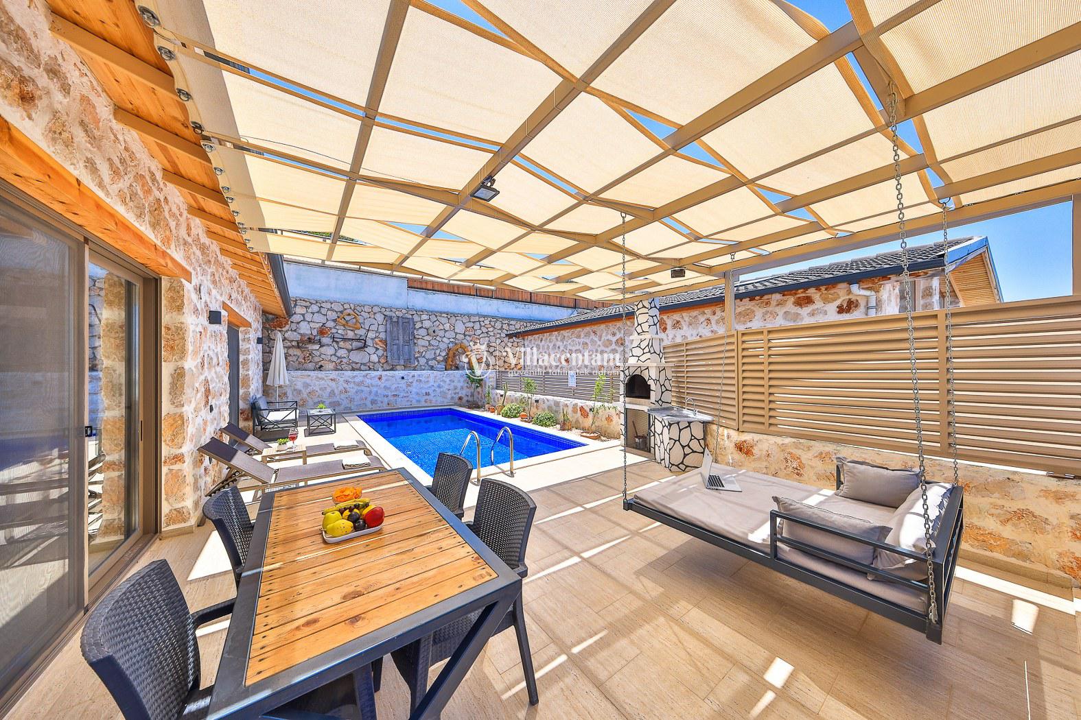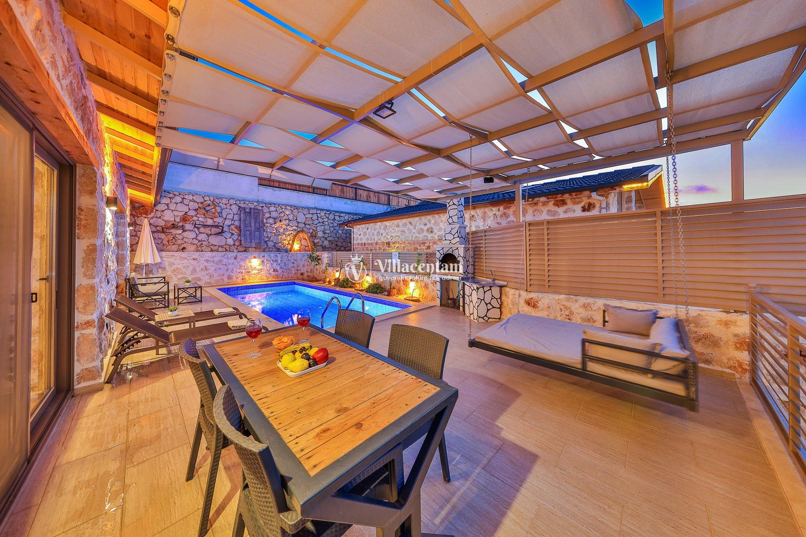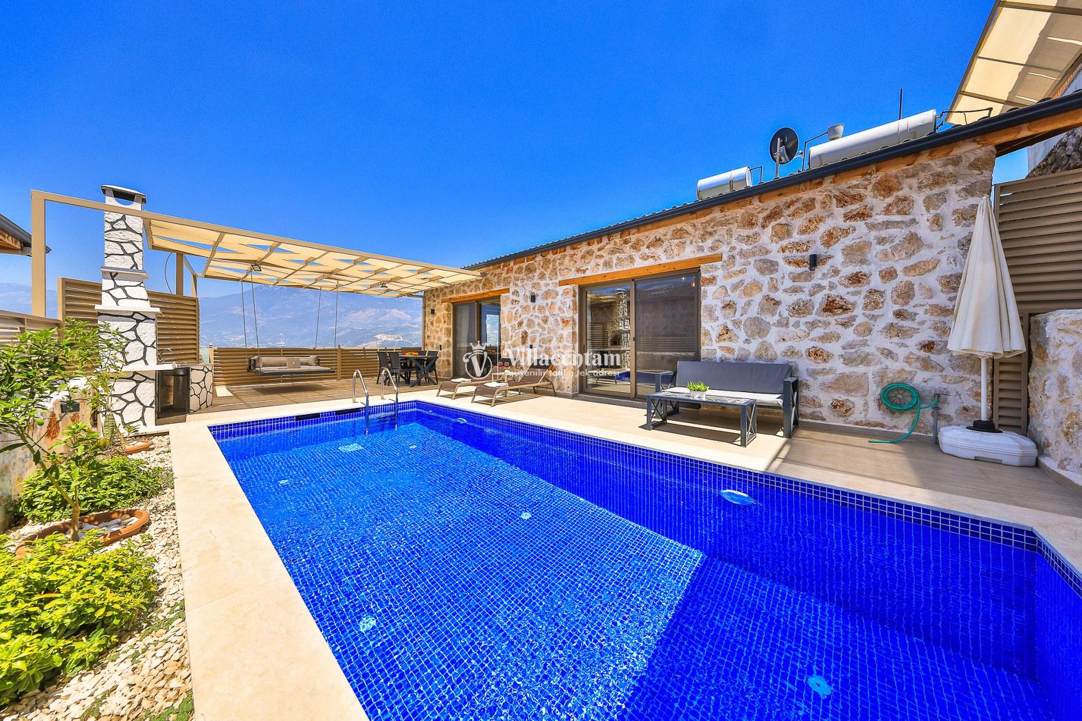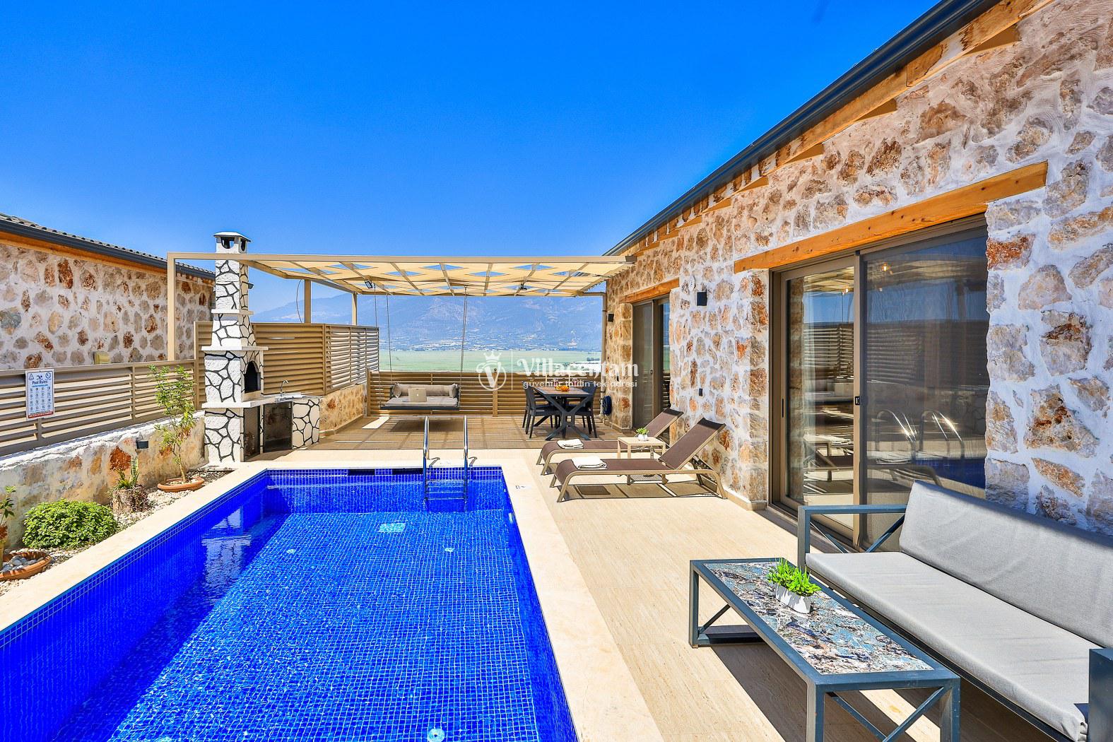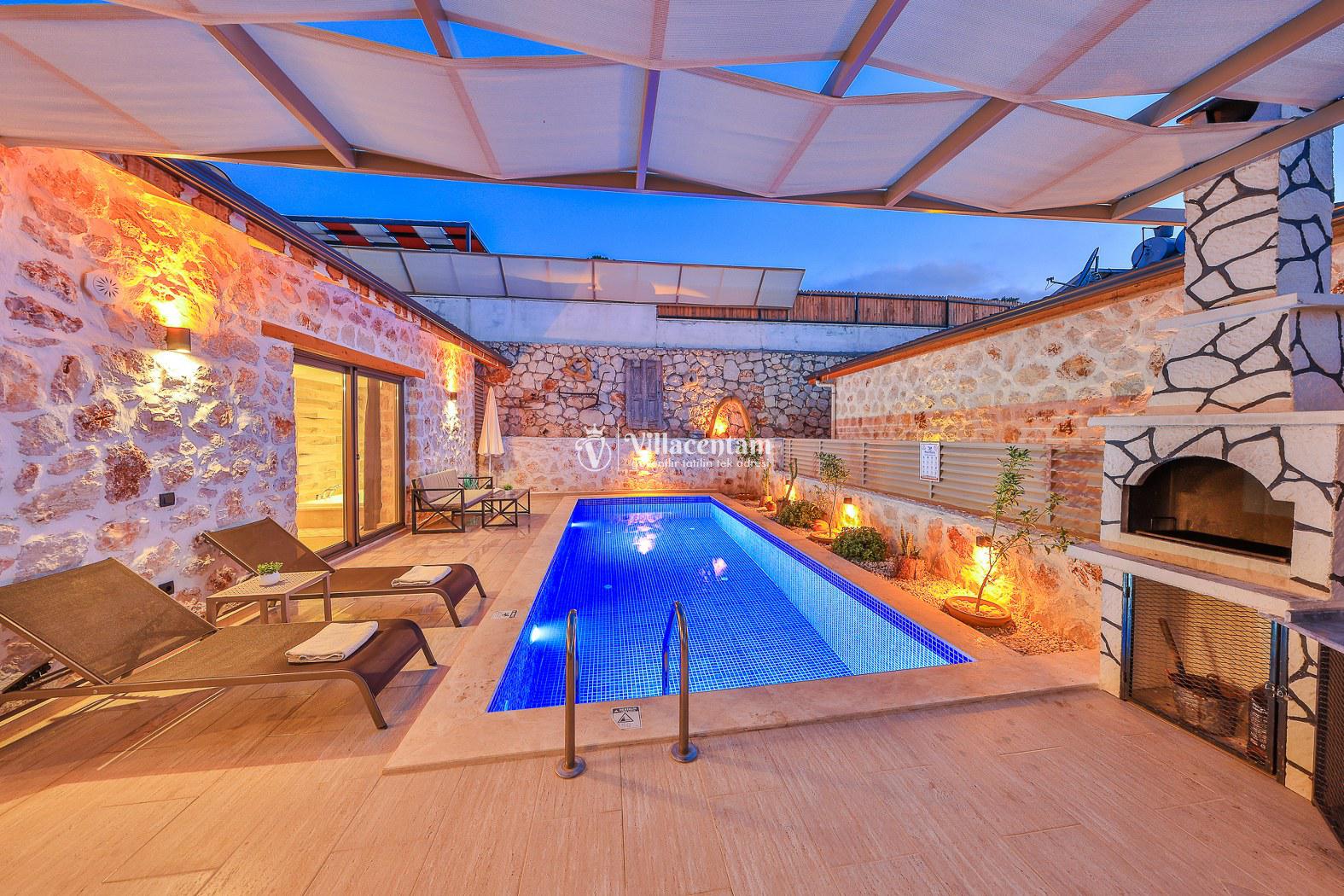 Villa Dionor, Kalkan Yeşilköy mevkiinde konumlanmakta olan yeşilliklerle kaplı doğa manzarasına hakim kiralık villalarımız arasında yer almaktadır. Modern ve konforlu bir şekilde dizayn edilen yazlık villamızda 1 adet yatak odası bulunmakta olup, 2 kişiye konaklama imkanı sağlamaktadır. Yatak odasının içerisinde tüm yılın vermiş olduğu yorgunluğu giderip, keyif yapabileceğiniz jakuzi yer almaktadır. Havuz ve havuz terası korunaklı hale getirilen kiralık villamız dışarıdan bir kimse tarafından görünmemektedir. Bu nedenle muhafazakar balayı çiftleri rahatlıkla konaklayabilirler. Sevdiklerinizle tüm gözlerden uzakta yeme içme keyfinizi en güzel hale getirebilir, havuzunuzun tadını çıkarabilirsiniz. Hayallerinizin de ötesinde unutamayacağınız bir yazlık villada tatil için Villa Dionor' u tercih edebilirsiniz.