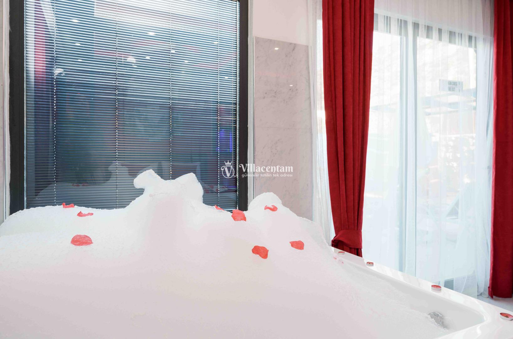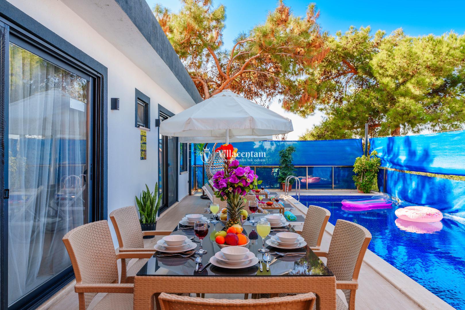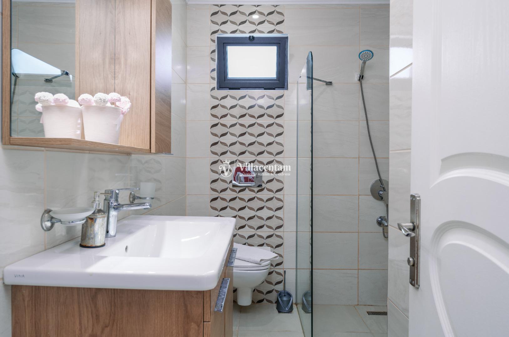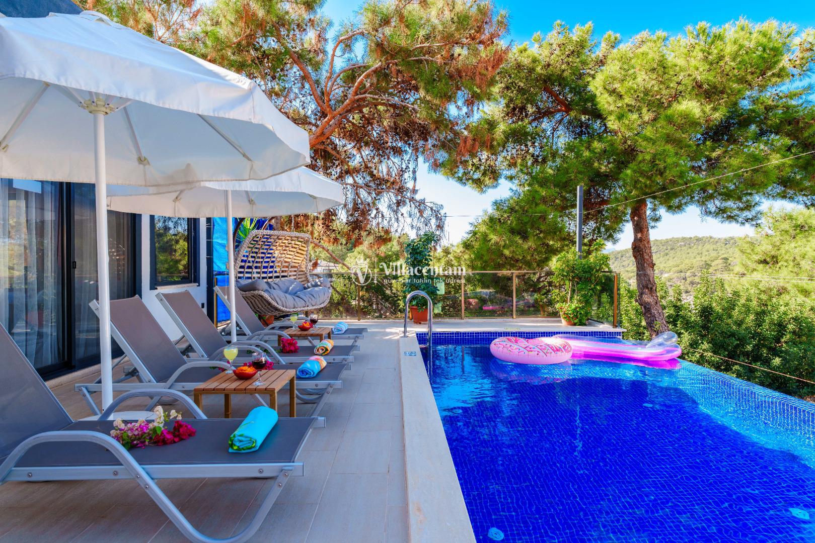Villa Ecba, Doğayla iç içe, modern konforla tasarlanmış bu özel villa; jakuzisi, şık mimarisi ve 4 kişilik kapasitesi ile hem çiftler hem de küçük aileler için mükemmel bir tatil deneyimi sunar. Sakin ortamı, özenle tasarlanmış iç mekânları ve gizlilik odaklı yapısıyla, yılın tüm stresinden uzaklaşıp kendinizi yenileyebileceğiniz eşsiz bir konaklama fırsatı sağlar. Villaya adım attığınız anda sizi karşılayan modern salon; geniş oturma grubu, zarif dekorasyon detayları ve huzur veren renk paletiyle sıcak bir atmosfer oluşturur. Açık plan mutfak; bulaşık makinesi, fırın, ocak, buzdolabı ve yemek takımları gibi günlük ihtiyaçlarınız için tam donanımlıdır. Salon ve mutfak bölümünden direkt olarak terasa çıkabilir, güne ferah bir manzarada kahvaltıyla başlayabilirsiniz. Villamızda toplam 4 kişilik konaklama kapasitesi sunan iki ayrı yatak odası bulunur. Odaların her biri modern mobilyalarla tasarlanmış olup; konforlu yataklar, klima, depolama alanları ve özenle seçilmiş aydınlatmalarla donatılmıştır. Ana yatak odasında yer alan özel jakuzi, tatilinize lüks bir dokunuş katarken, günün yorgunluğunu atmanız için mükemmel bir ortam sağlar. Hem romantik anlar yaşamak isteyen çiftler hem de konfor arayan aileler için ideal bir seçenektir.