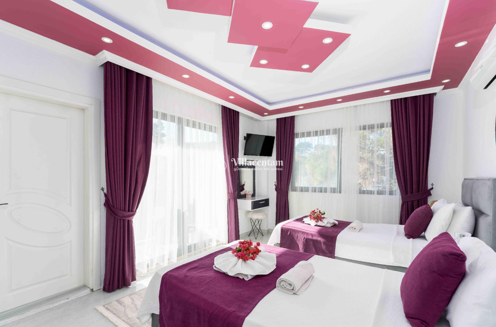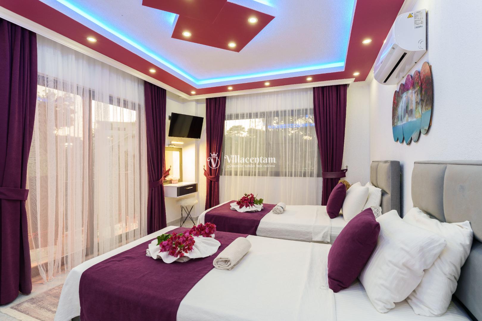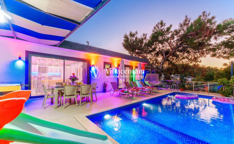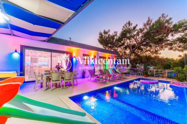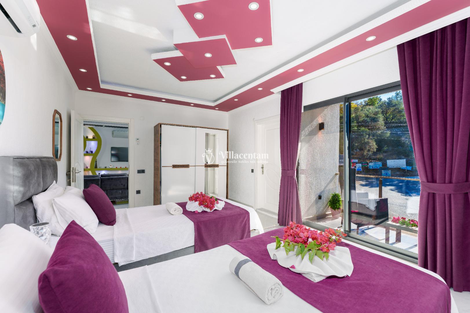 Villa Ecba, Doğayla iç içe, modern konforla tasarlanmış bu özel villa; jakuzisi, şık mimarisi ve 4 kişilik kapasitesi ile hem çiftler hem de küçük aileler için mükemmel bir tatil deneyimi sunar. Sakin ortamı, özenle tasarlanmış iç mekânları ve gizlilik odaklı yapısıyla, yılın tüm stresinden uzaklaşıp kendinizi yenileyebileceğiniz eşsiz bir konaklama fırsatı sağlar. Villaya adım attığınız anda sizi karşılayan modern salon; geniş oturma grubu, zarif dekorasyon detayları ve huzur veren renk paletiyle sıcak bir atmosfer oluşturur. Açık plan mutfak; bulaşık makinesi, fırın, ocak, buzdolabı ve yemek takımları gibi günlük ihtiyaçlarınız için tam donanımlıdır. Salon ve mutfak bölümünden direkt olarak terasa çıkabilir, güne ferah bir manzarada kahvaltıyla başlayabilirsiniz. Villamızda toplam 4 kişilik konaklama kapasitesi sunan iki ayrı yatak odası bulunur. Odaların her biri modern mobilyalarla tasarlanmış olup; konforlu yataklar, klima, depolama alanları ve özenle seçilmiş aydınlatmalarla donatılmıştır. Ana yatak odasında yer alan özel jakuzi, tatilinize lüks bir dokunuş katarken, günün yorgunluğunu atmanız için mükemmel bir ortam sağlar. Hem romantik anlar yaşamak isteyen çiftler hem de konfor arayan aileler için ideal bir seçenektir.
