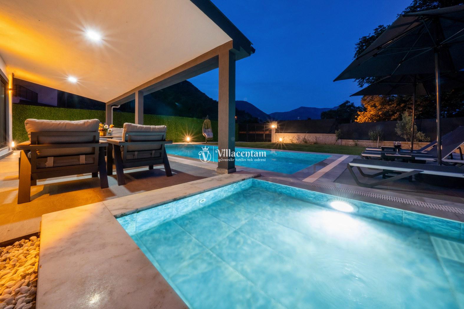 Villanın dış alanında yer alan özel yüzme havuzu, şezlonglar ve güneşlenme alanı sayesinde gün boyu keyifli vakit geçirebilirsiniz. Geniş havuz terası ve barbekü alanı, akşam saatlerinde sevdiklerinizle birlikte keyifli anlar yaşamanız için idealdir.