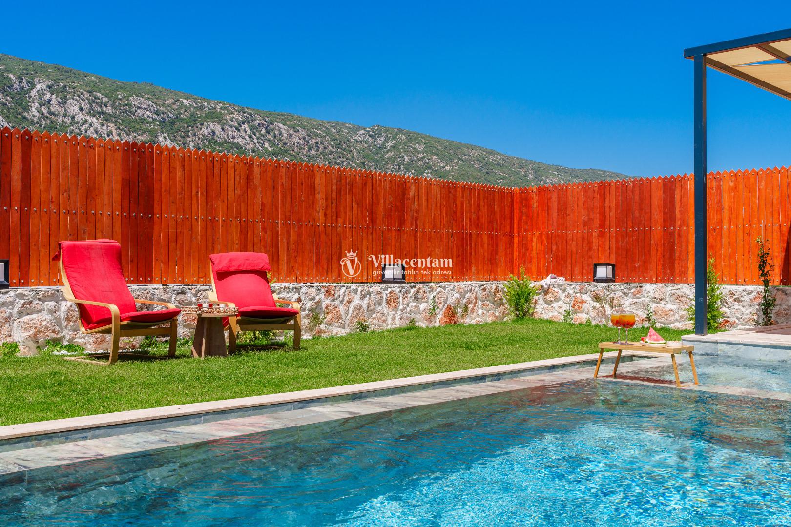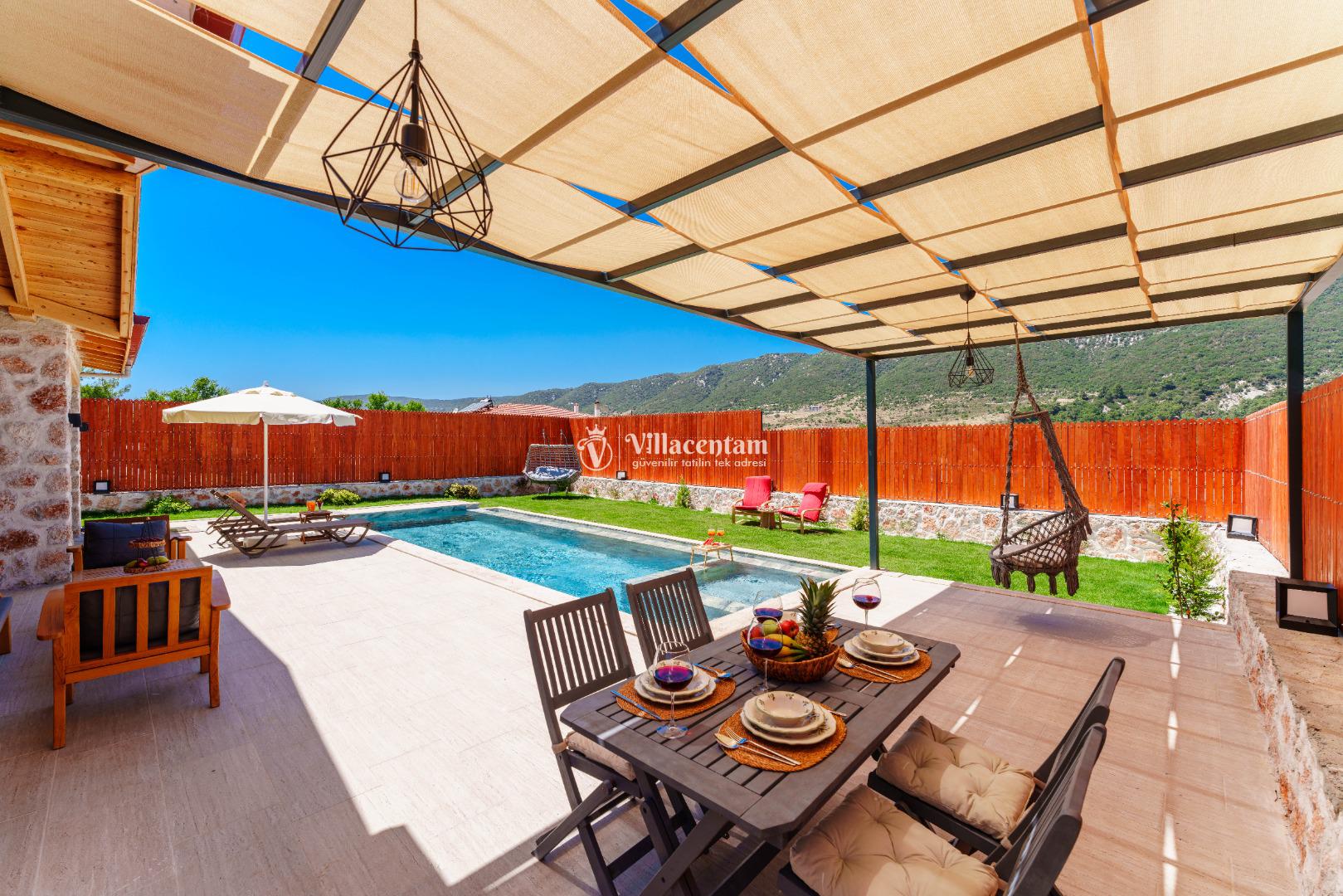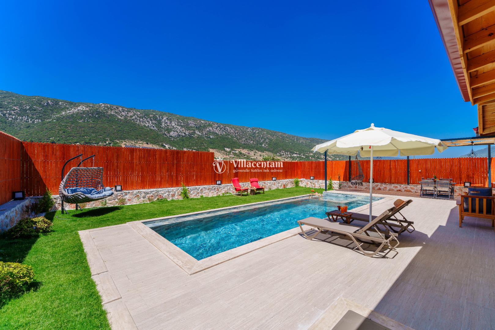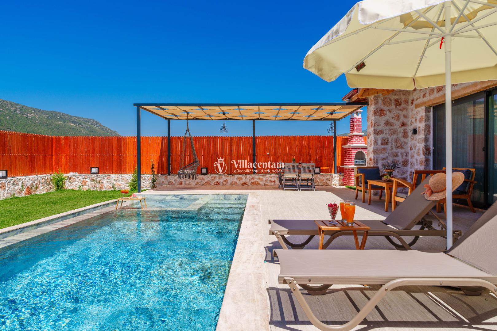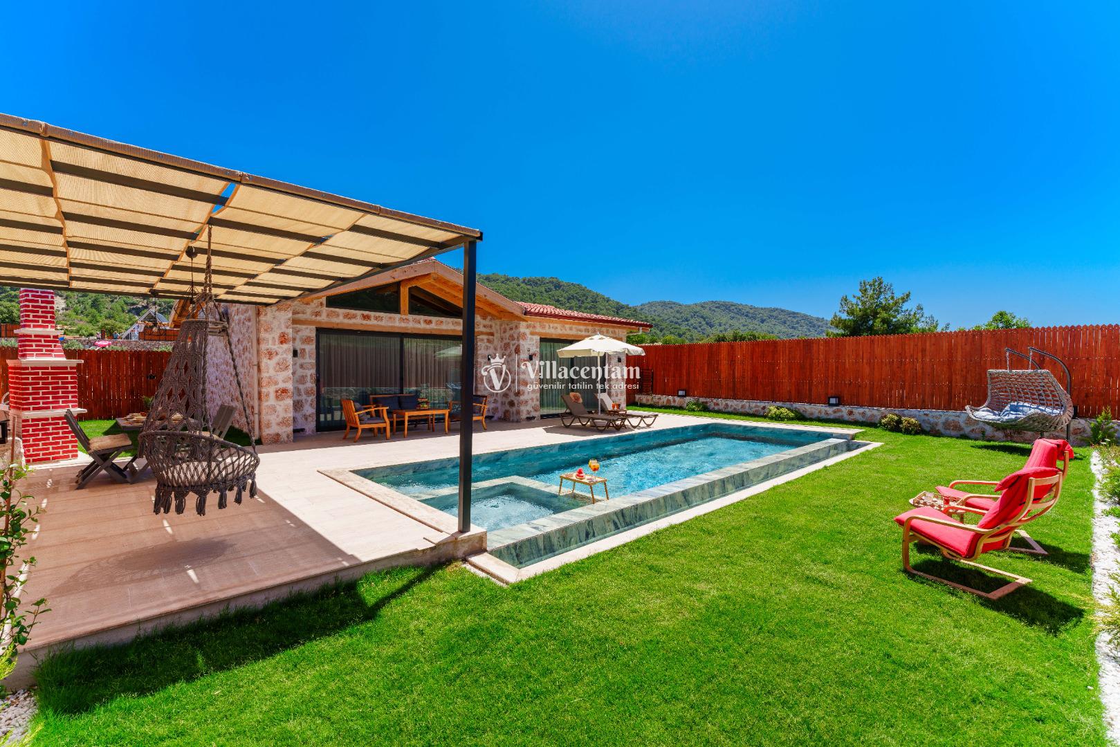 Villa Fidelya’nın tamamen size özel olarak tasarlanmış korunaklı yüzme havuzu ve bahçesi, mahremiyete önem veren misafirler için büyük bir avantaj sunar. Bahçede şezlonglar, oturma alanı, salıncak ve barbekü bulunmaktadır. Gün boyu güneşin tadını çıkarabilir, akşamları ise doğanın sessizliği eşliğinde keyifli vakit geçirebilirsiniz.