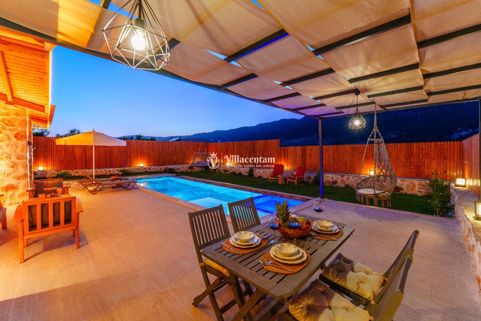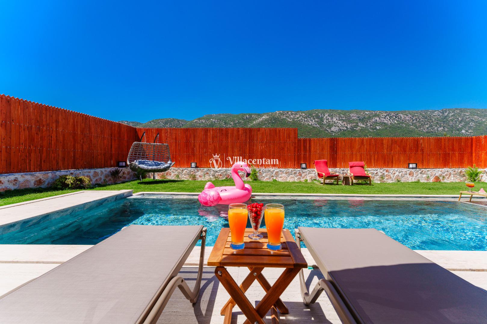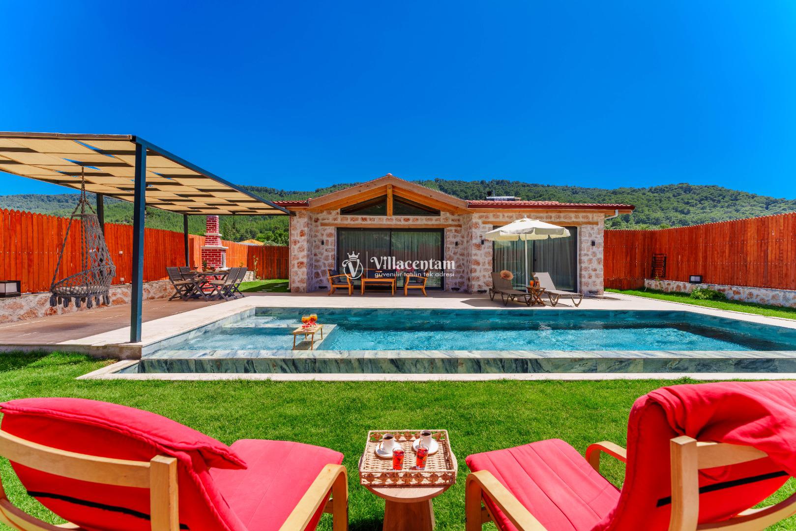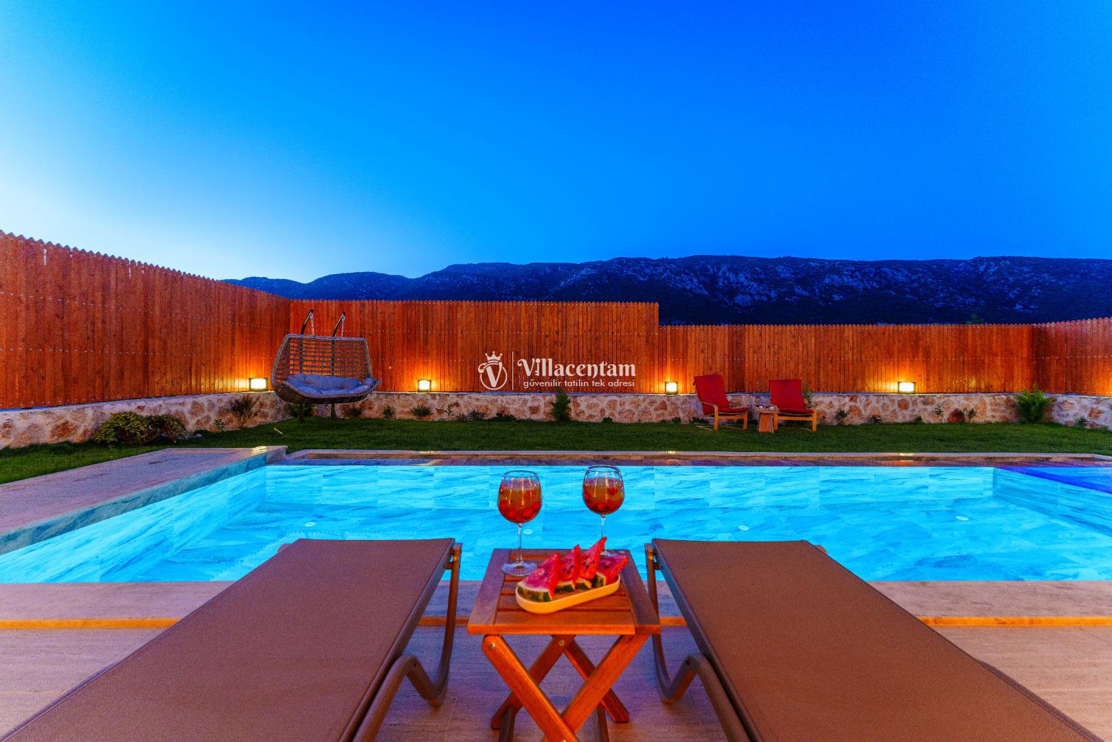 Villa Fidelya’nın tamamen size özel olarak tasarlanmış korunaklı yüzme havuzu ve bahçesi, mahremiyete önem veren misafirler için büyük bir avantaj sunar. Bahçede şezlonglar, oturma alanı, salıncak ve barbekü bulunmaktadır. Gün boyu güneşin tadını çıkarabilir, akşamları ise doğanın sessizliği eşliğinde keyifli vakit geçirebilirsiniz.