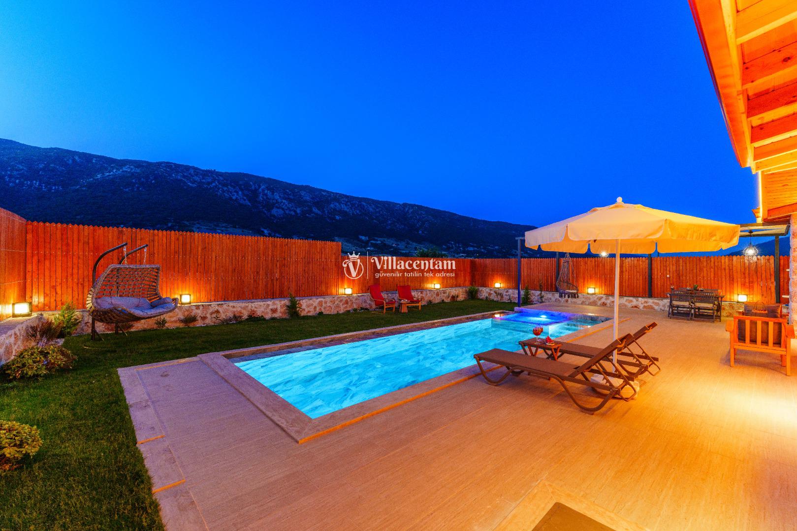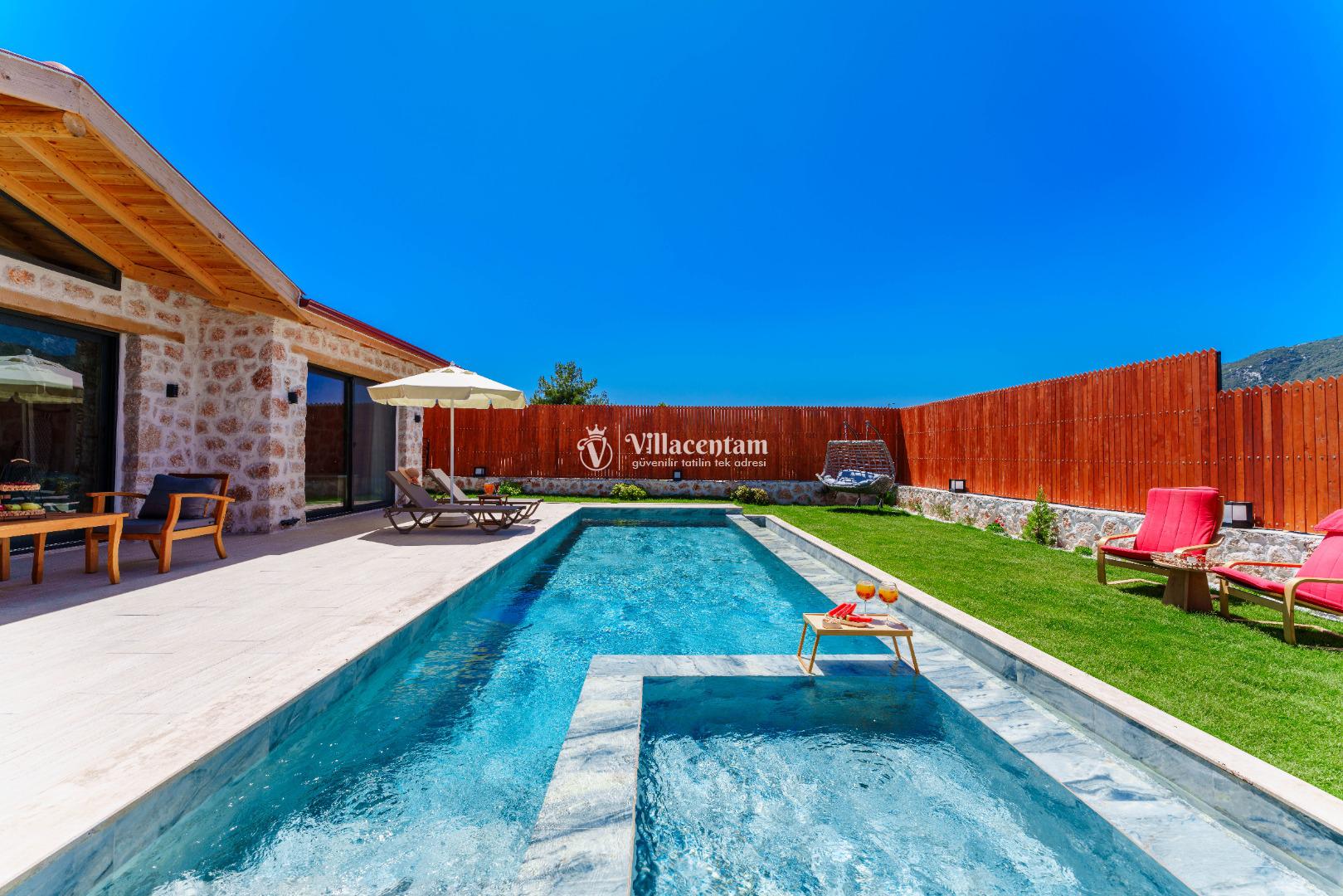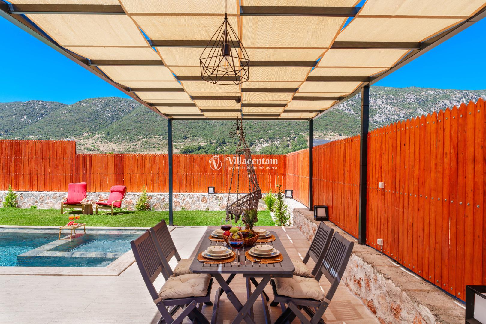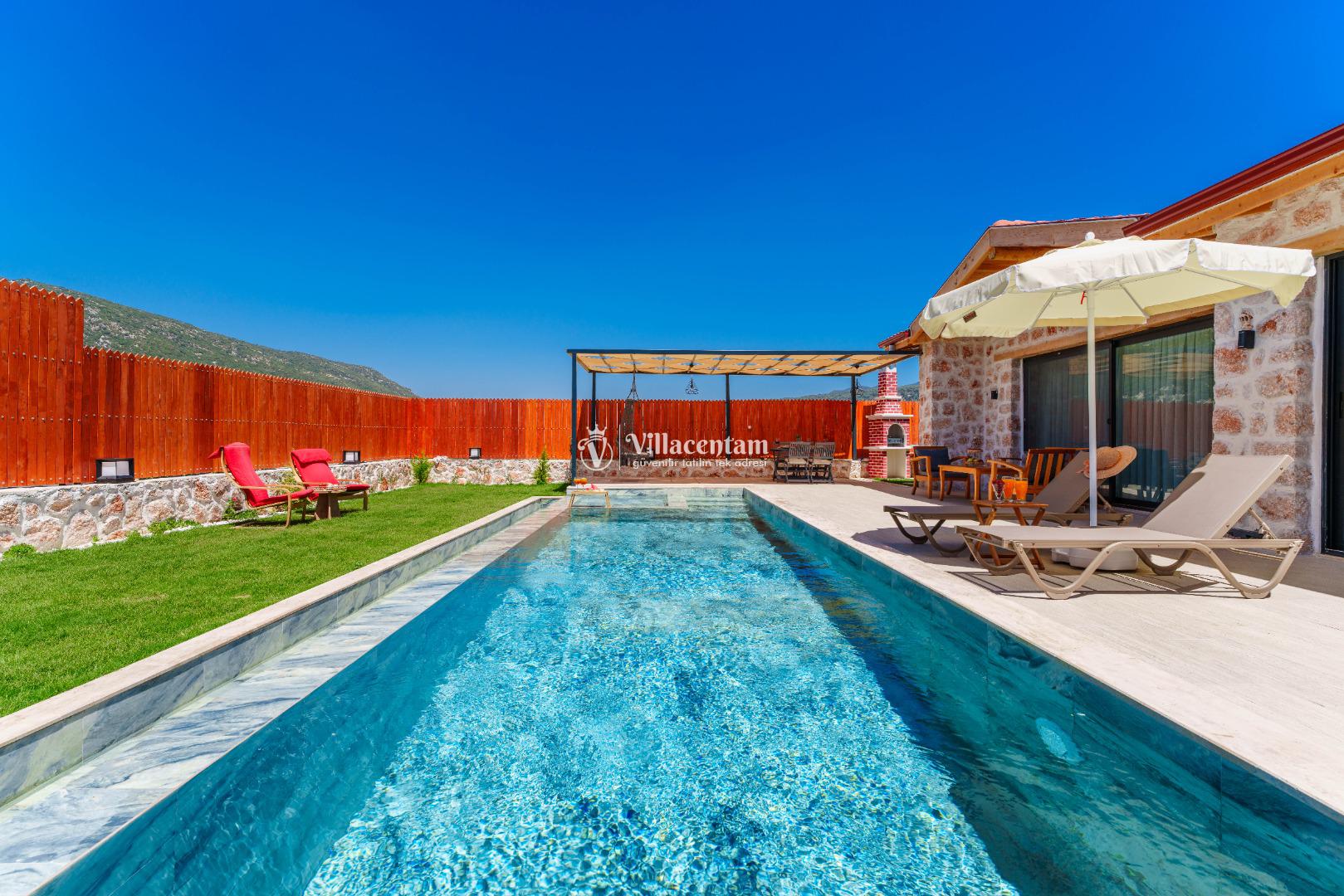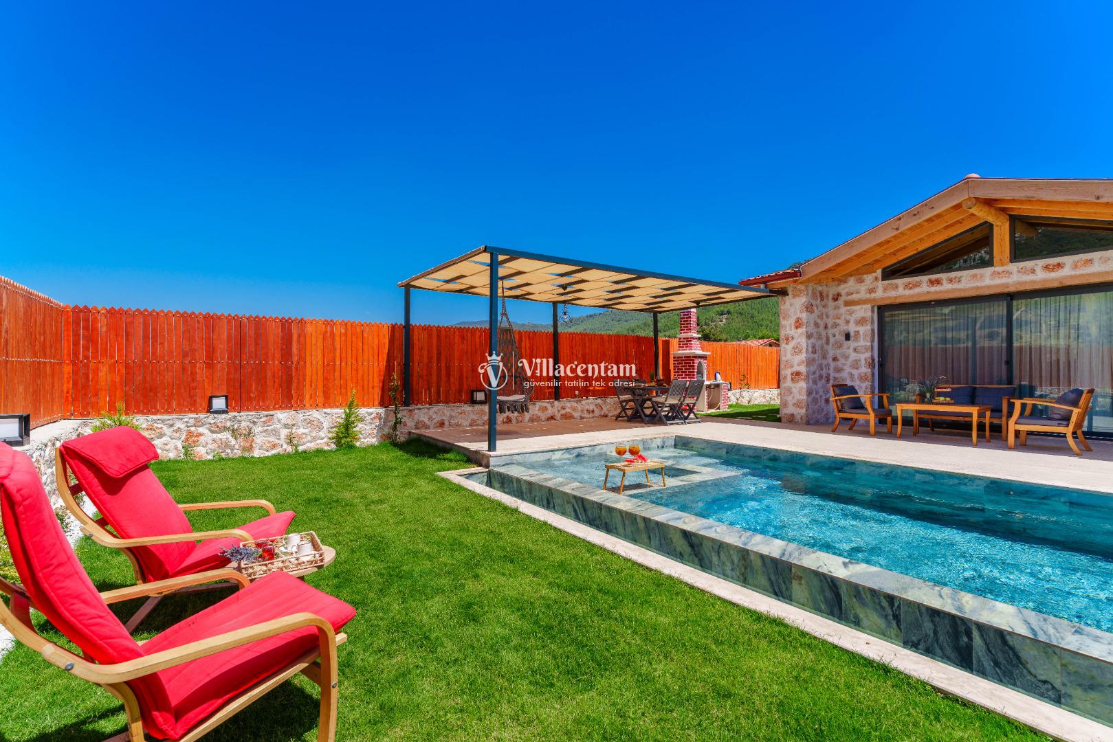 Villa Fidelya’nın tamamen size özel olarak tasarlanmış korunaklı yüzme havuzu ve bahçesi, mahremiyete önem veren misafirler için büyük bir avantaj sunar. Bahçede şezlonglar, oturma alanı, salıncak ve barbekü bulunmaktadır. Gün boyu güneşin tadını çıkarabilir, akşamları ise doğanın sessizliği eşliğinde keyifli vakit geçirebilirsiniz.