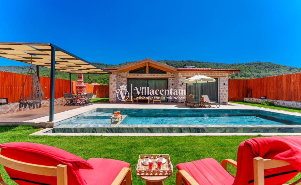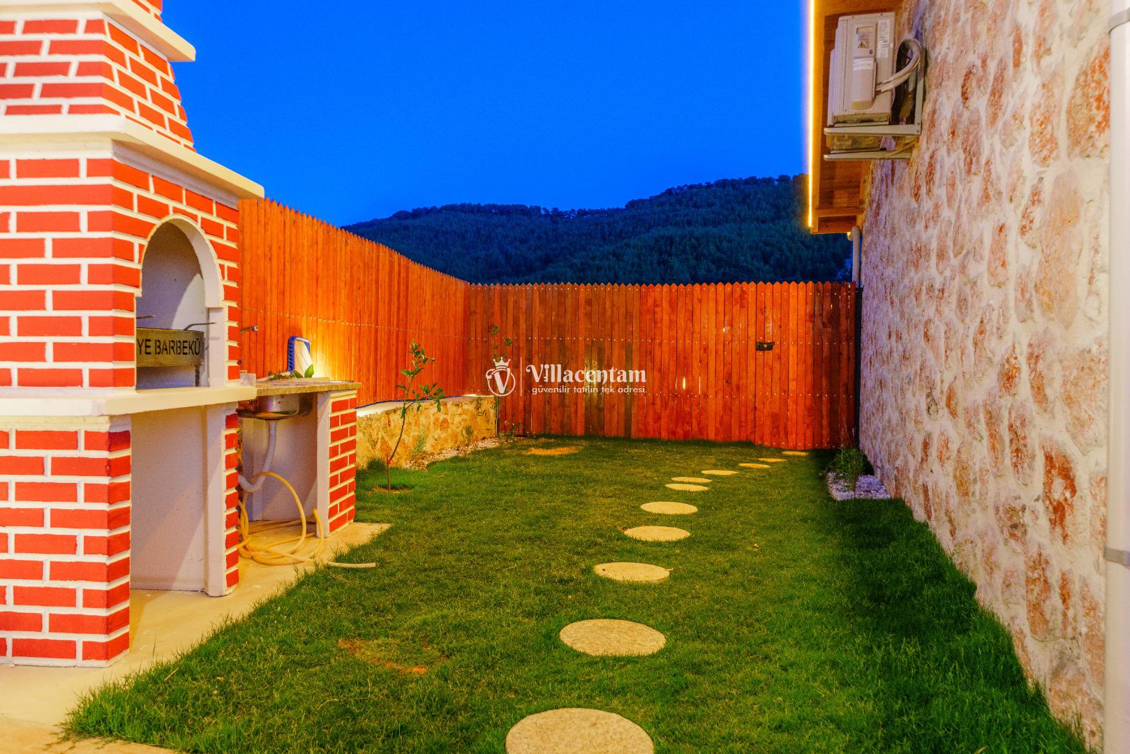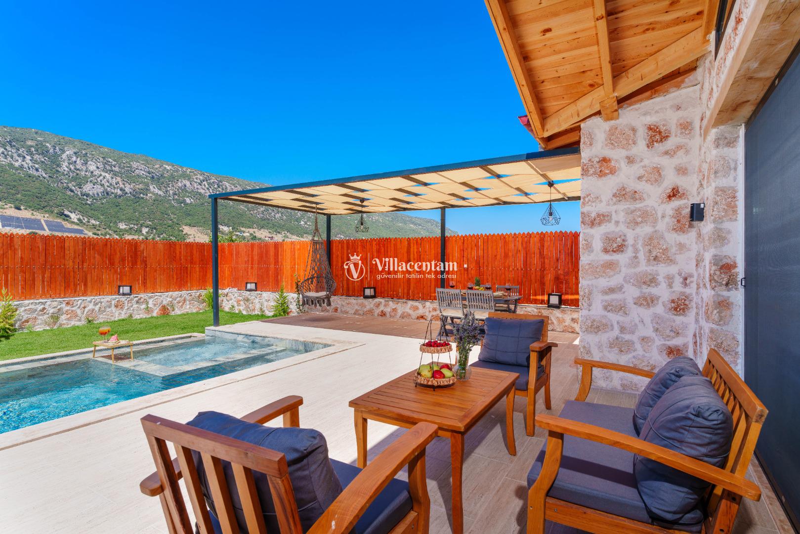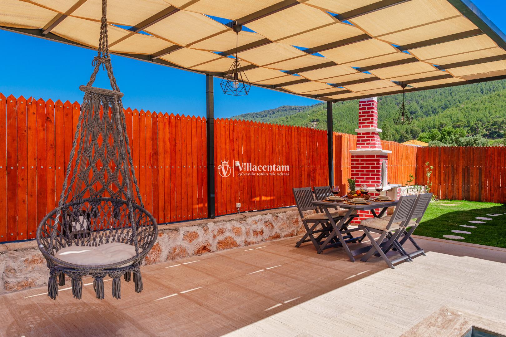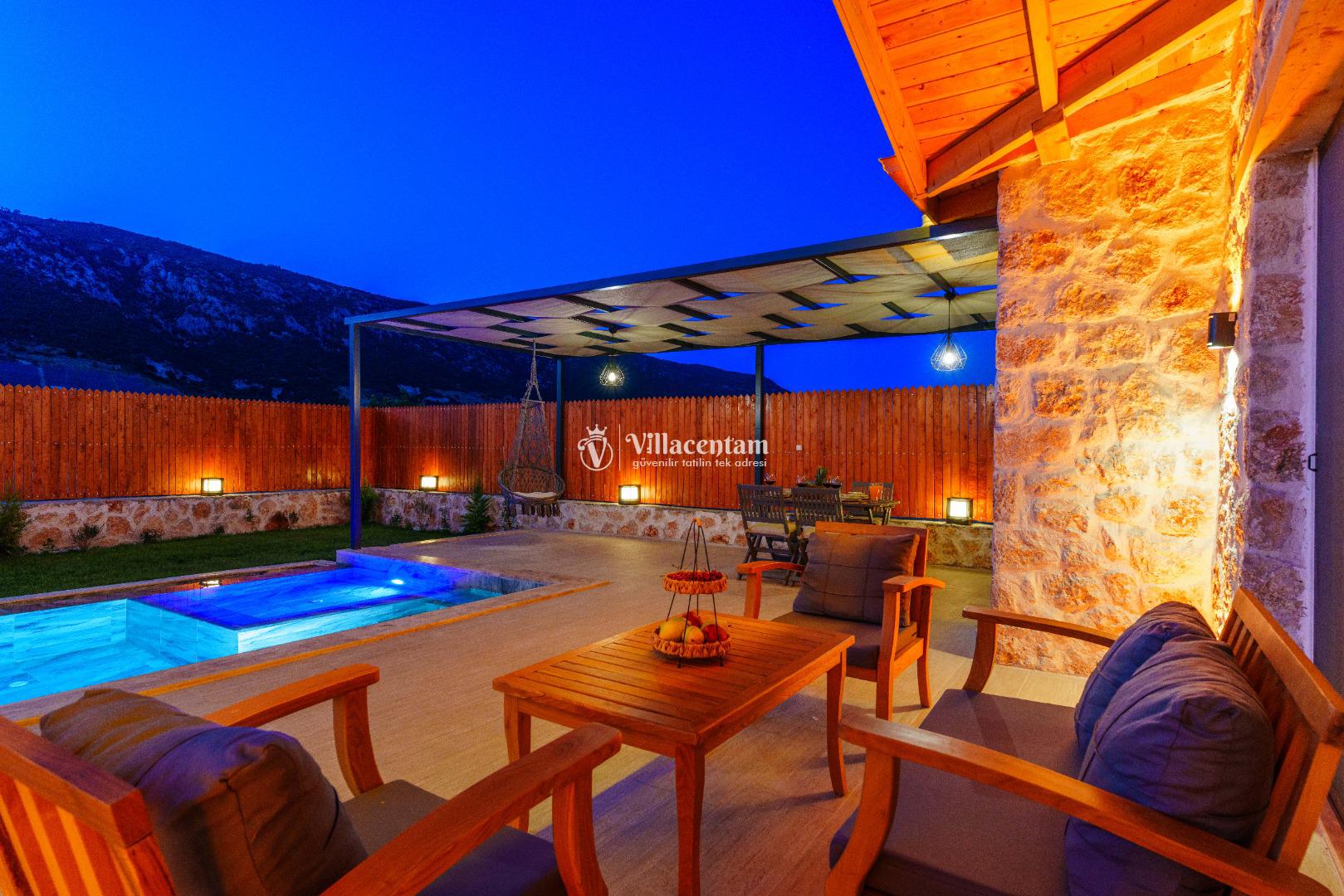 Villa Fidelya’nın tamamen size özel olarak tasarlanmış korunaklı yüzme havuzu ve bahçesi, mahremiyete önem veren misafirler için büyük bir avantaj sunar. Bahçede şezlonglar, oturma alanı, salıncak ve barbekü bulunmaktadır. Gün boyu güneşin tadını çıkarabilir, akşamları ise doğanın sessizliği eşliğinde keyifli vakit geçirebilirsiniz.