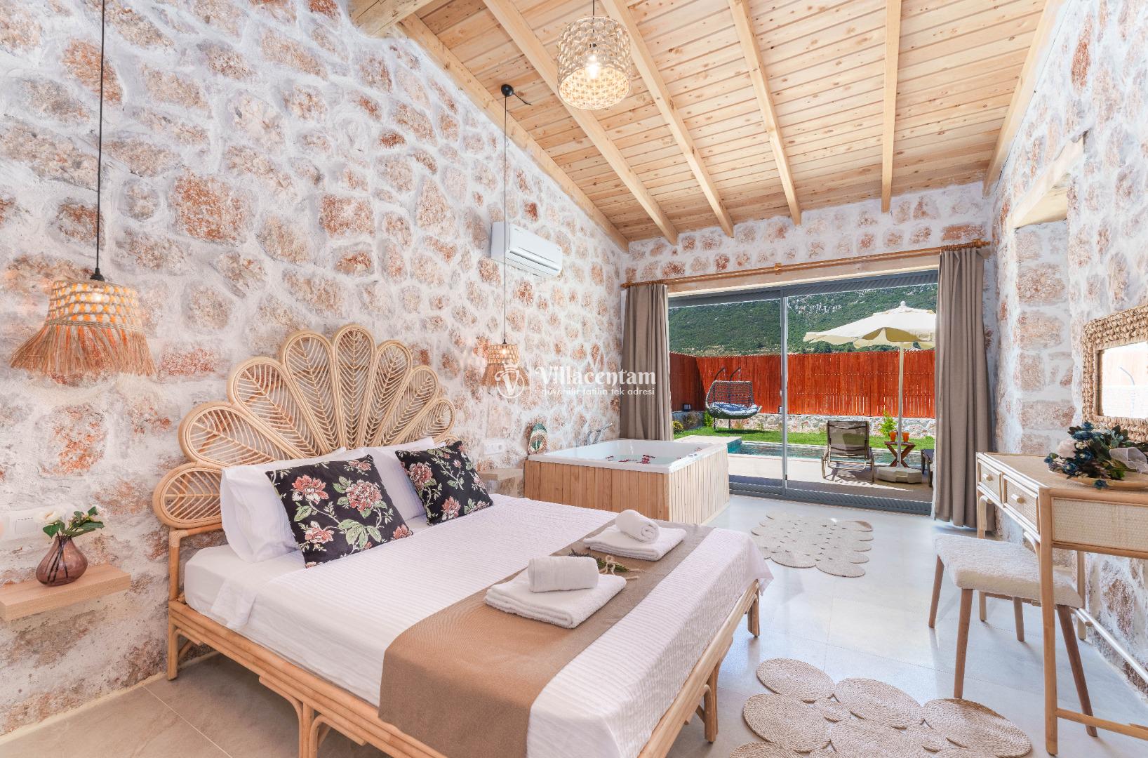 Modern ve şık detaylarla tasarlanmış villada 1 adet yatak odası bulunmakta olup, odada çift kişilik yatak ve konforu artıran jakuzi yer almaktadır. Ferah salon alanı, Amerikan mutfak ile birleşik olup uzun süreli konaklamalar için ihtiyaç duyulabilecek tüm mutfak ekipmanlarıyla donatılmıştır. Salon bölümünden havuz terasına direkt çıkış sağlanmaktadır.