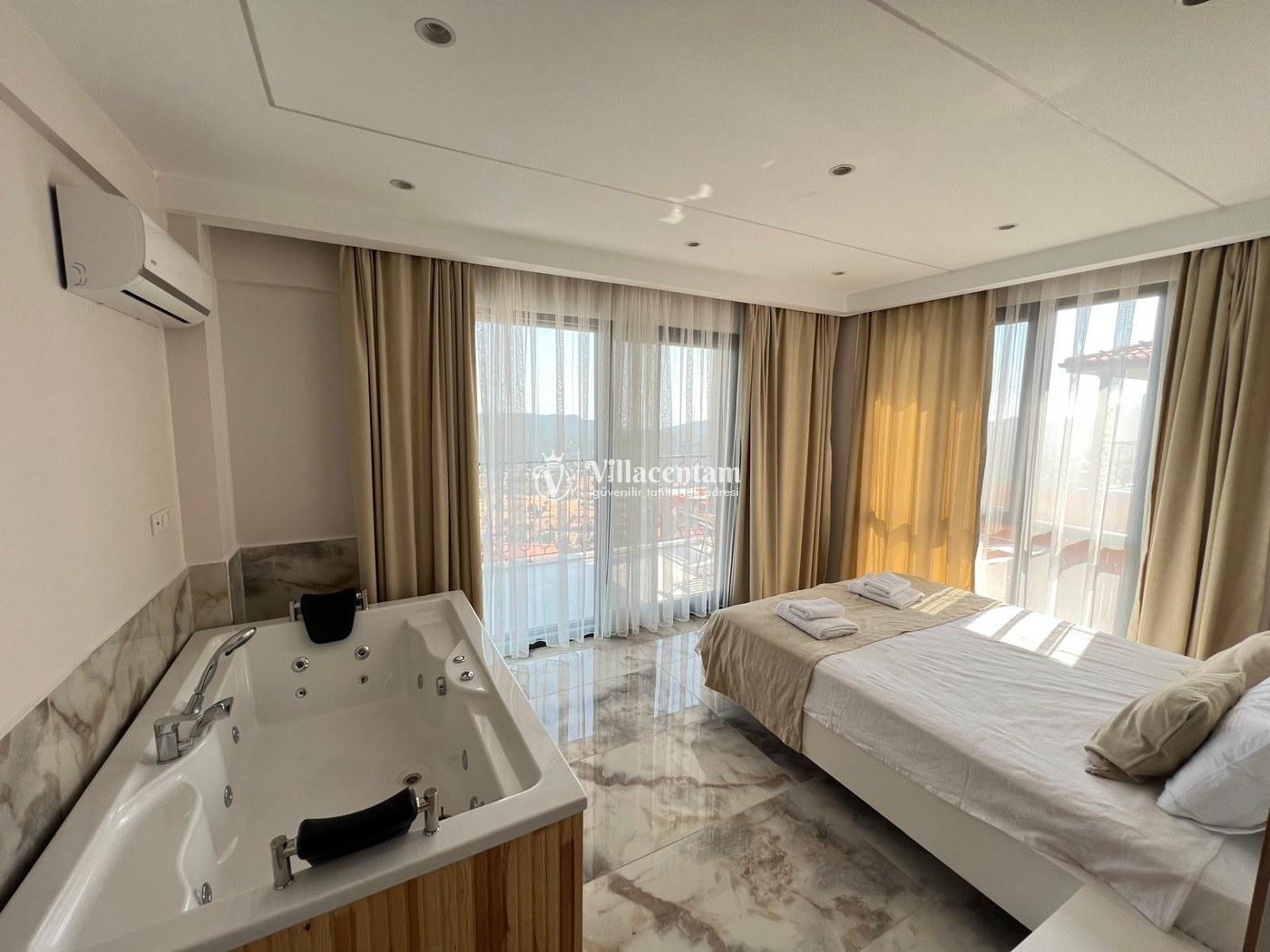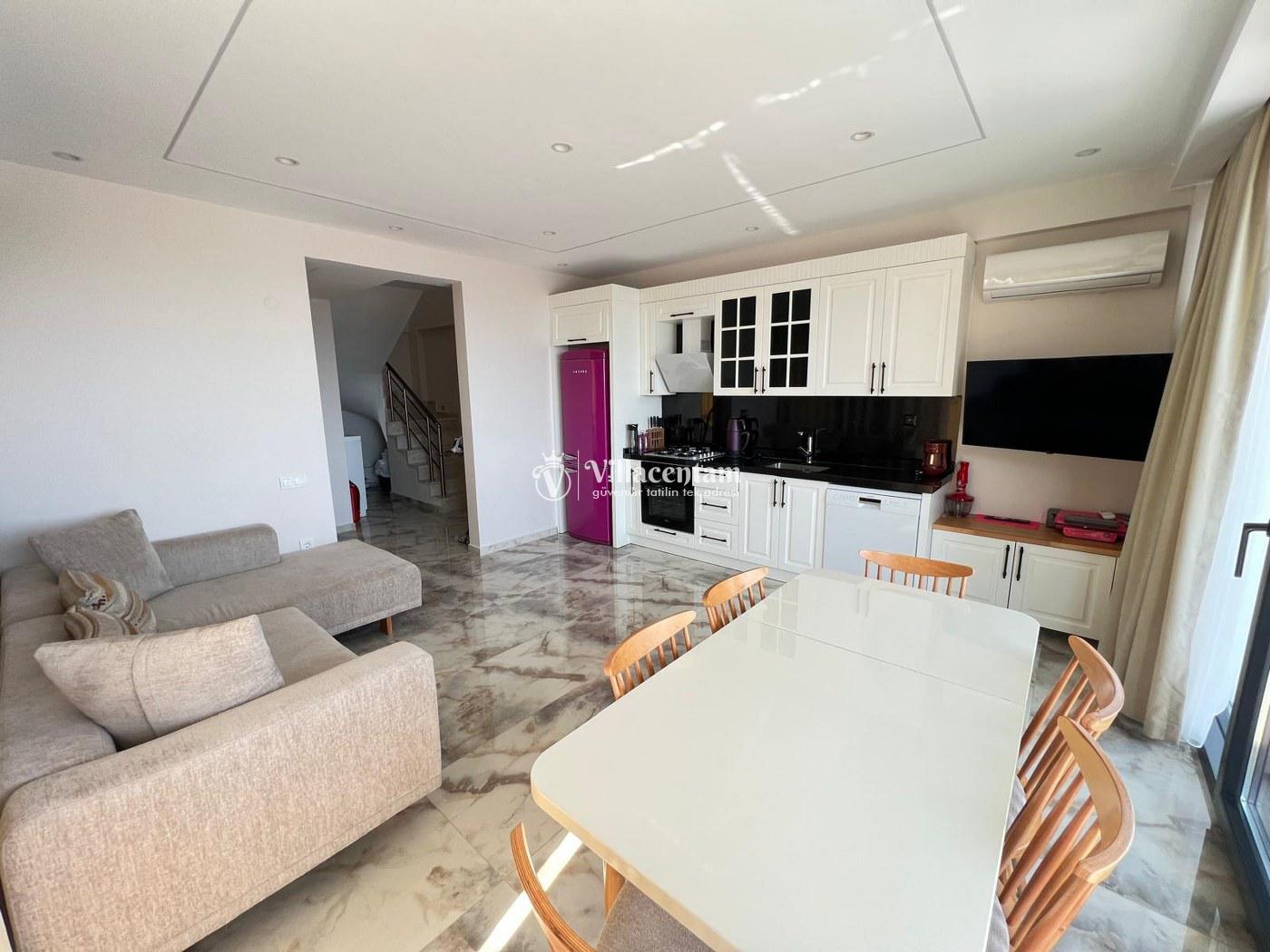 *Villalarda sıcak su için güneş enerjili su ısıtma sistemleri kullanılmaktadır. Çok yoğun sıcak su kullanımında, yoğunluğa ve su tankının büyüklüğüne bağlı olarak su tankında sıcak su tükenebilmekte ve tekrar suyun ısınması için belirli bir süre geçmesi gerekmektedir. Bu not sadece bu villa ile ilgili değil, tüm villalarımız için geçerli bir durumdur.