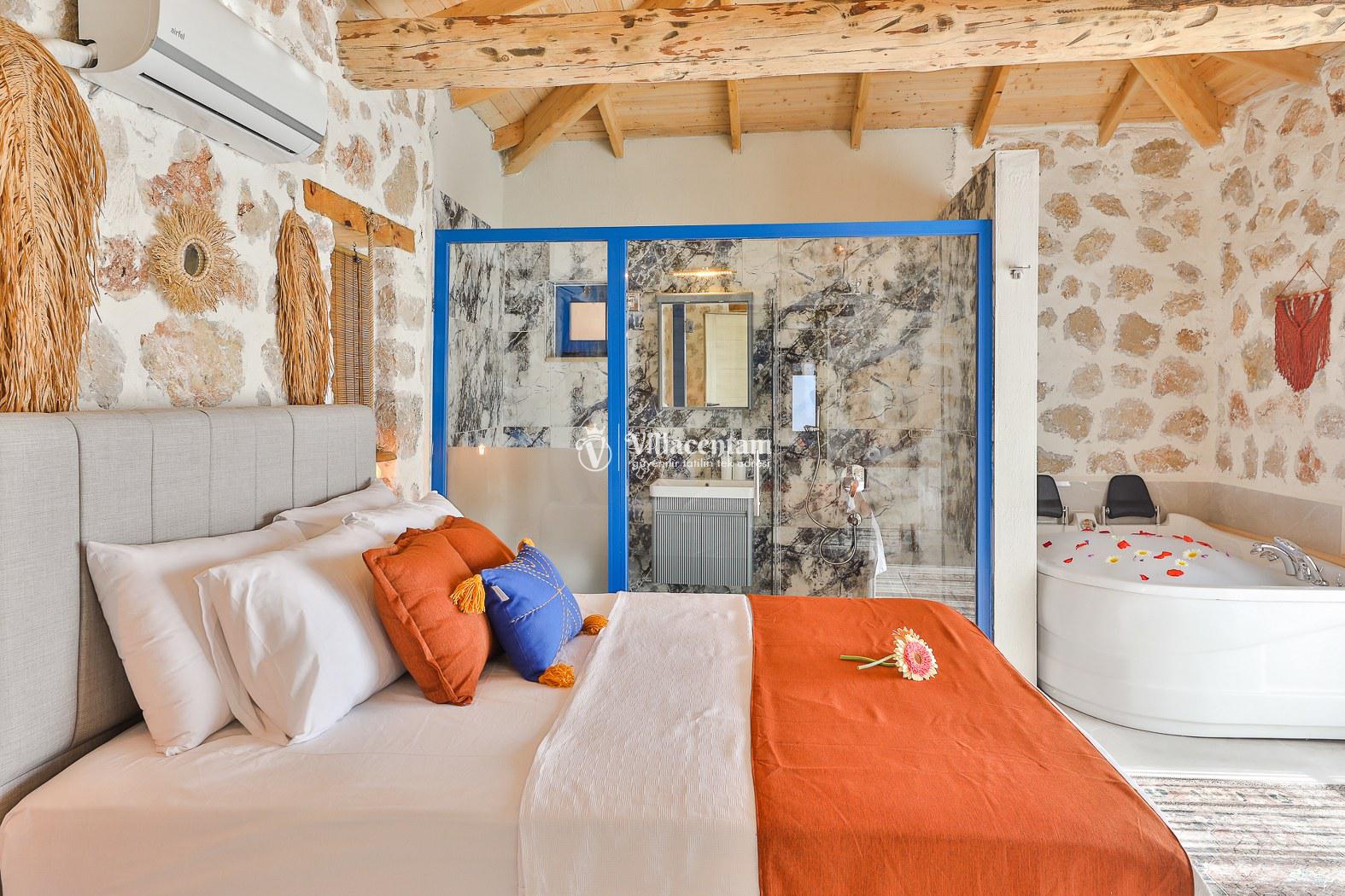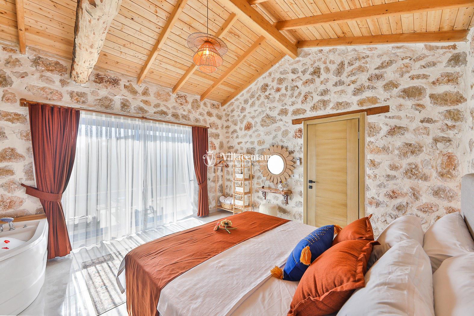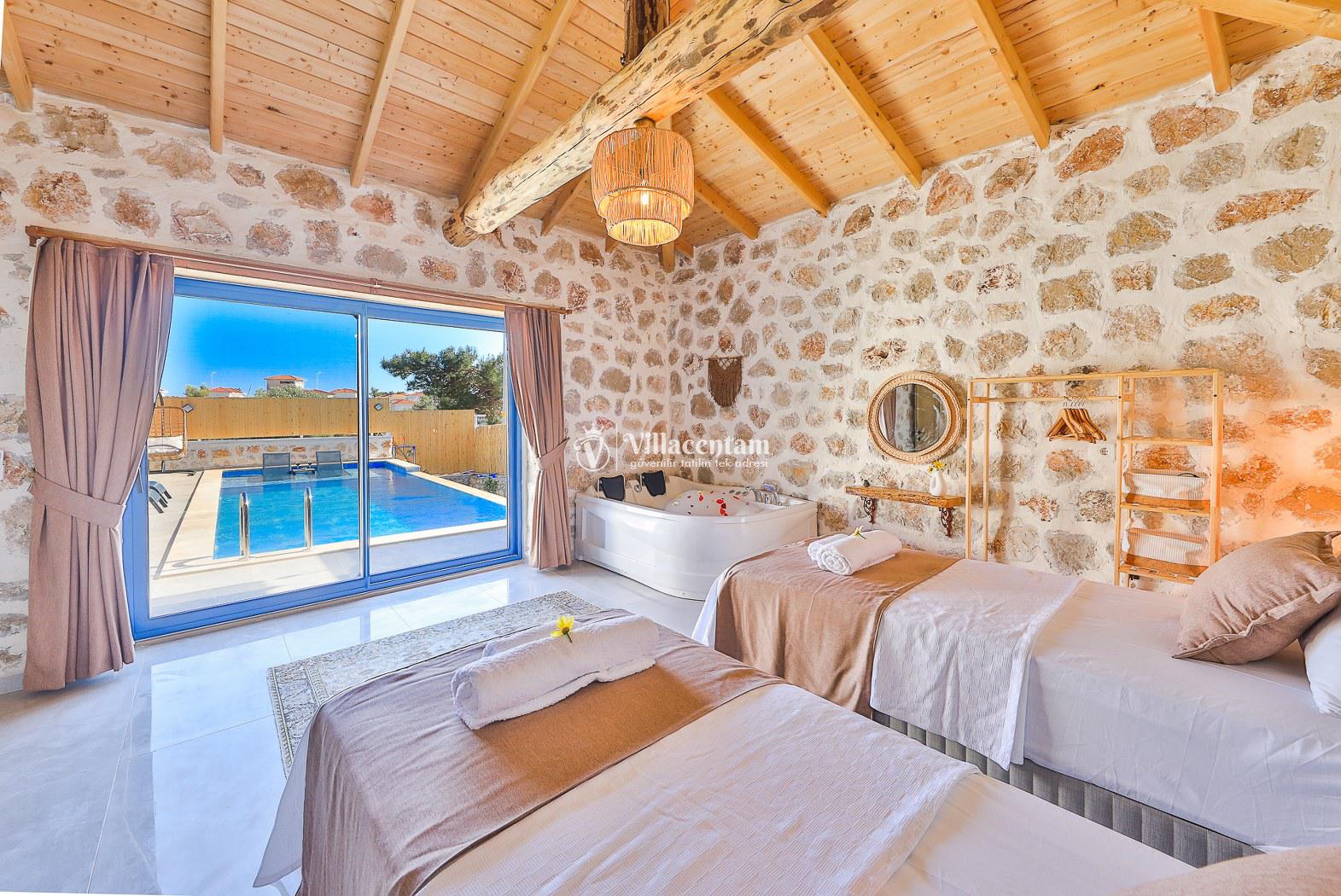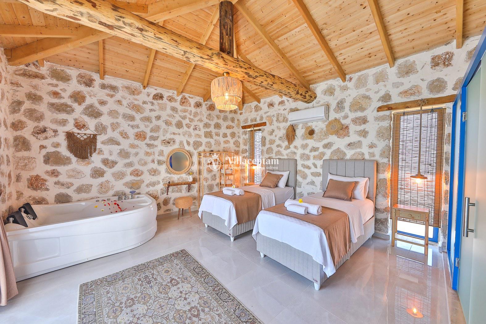 Villamız taş mimarisiyle zarif bir tasarıma sahiptir ve konforunuz düşünülerek özenle dizayn edilmiştir. Her iki yatak odasında da özel jakuzi bulunur; bu özellik, tatilinizi hem rahat hem de keyifli kılar.