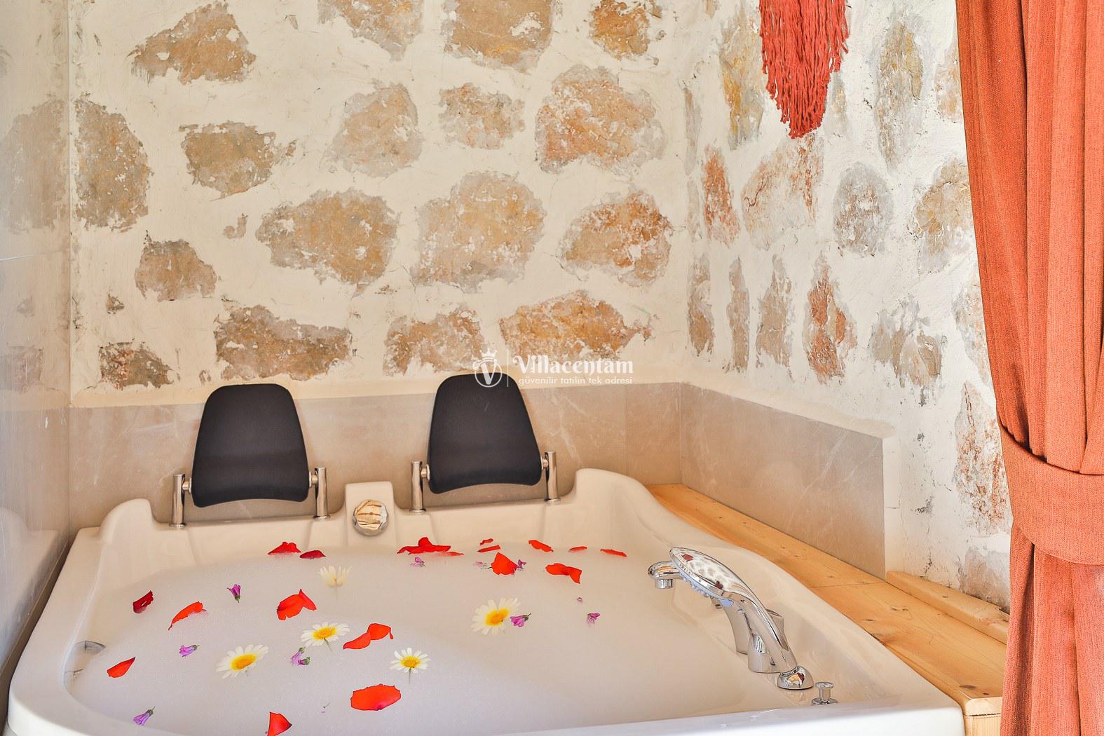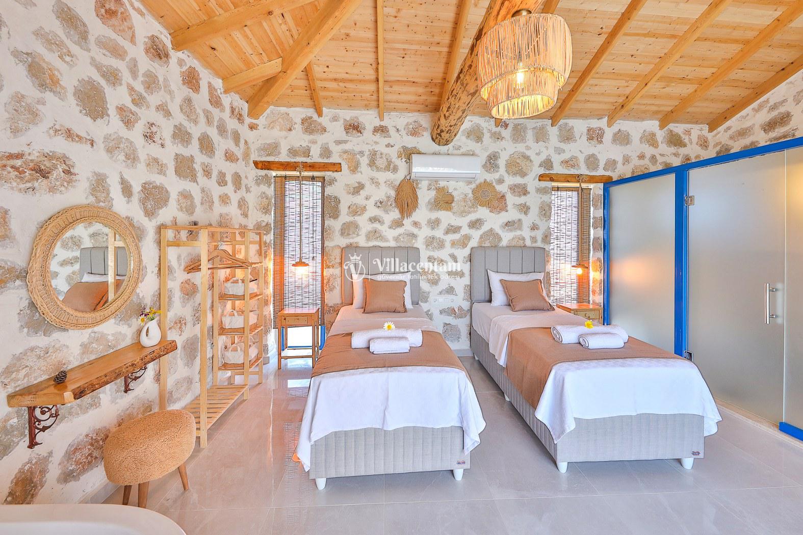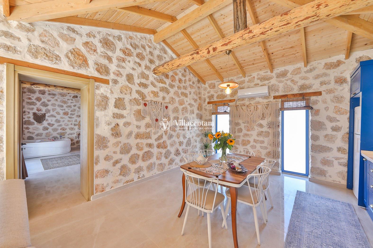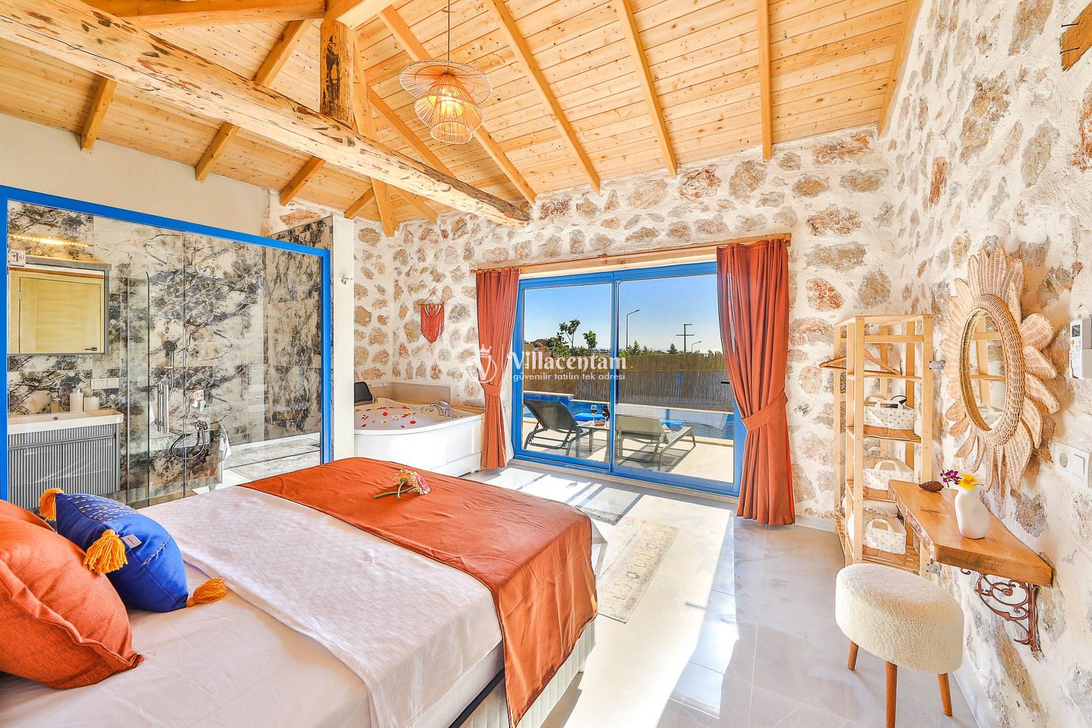 Villamız taş mimarisiyle zarif bir tasarıma sahiptir ve konforunuz düşünülerek özenle dizayn edilmiştir. Her iki yatak odasında da özel jakuzi bulunur; bu özellik, tatilinizi hem rahat hem de keyifli kılar.