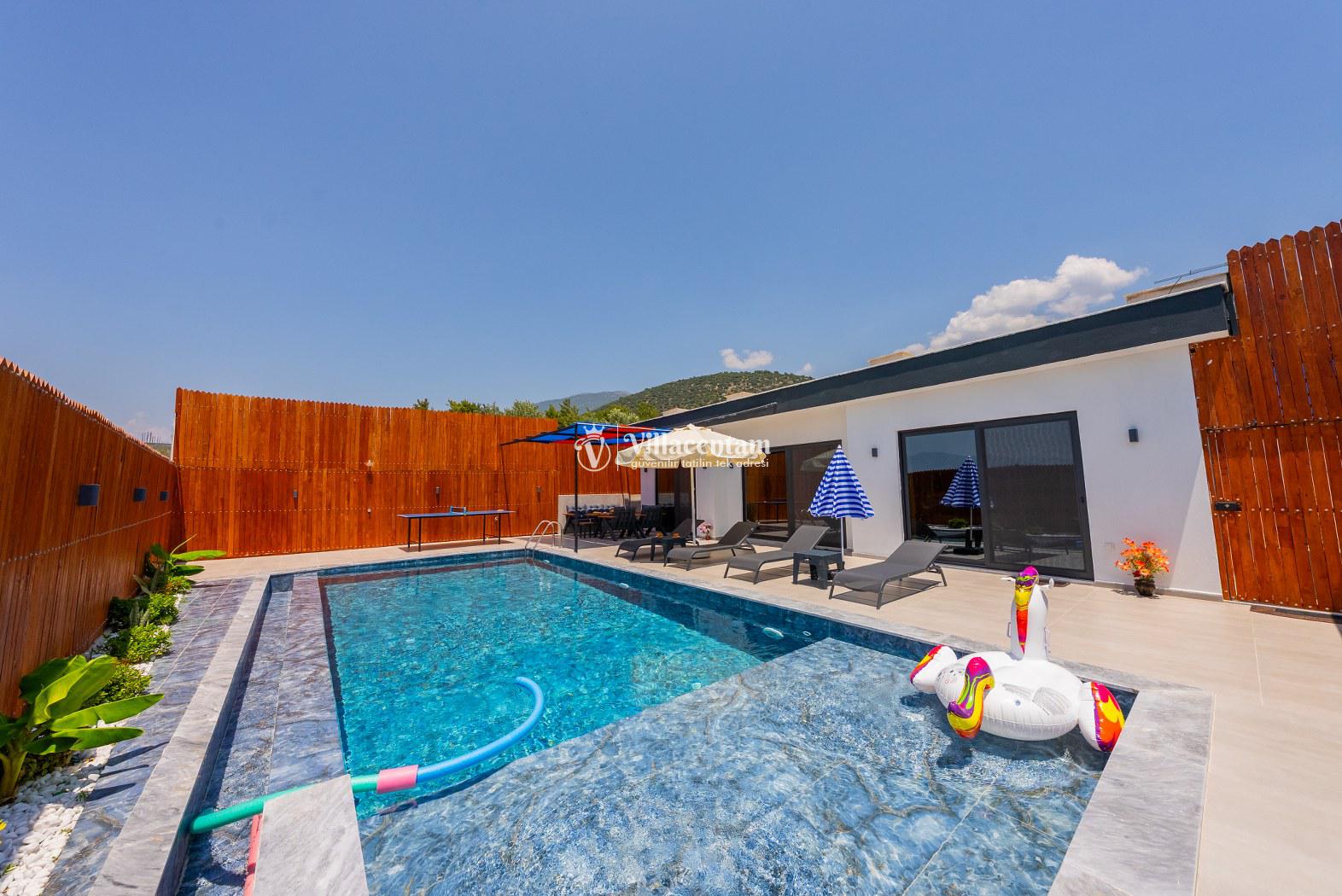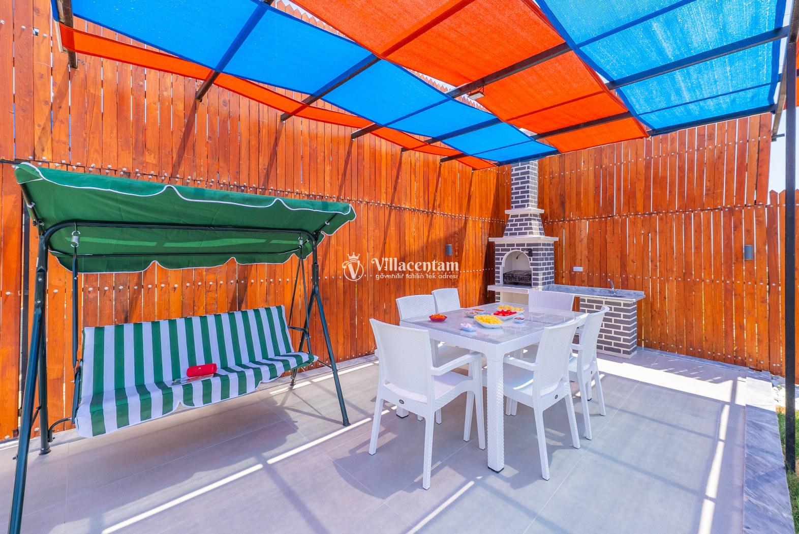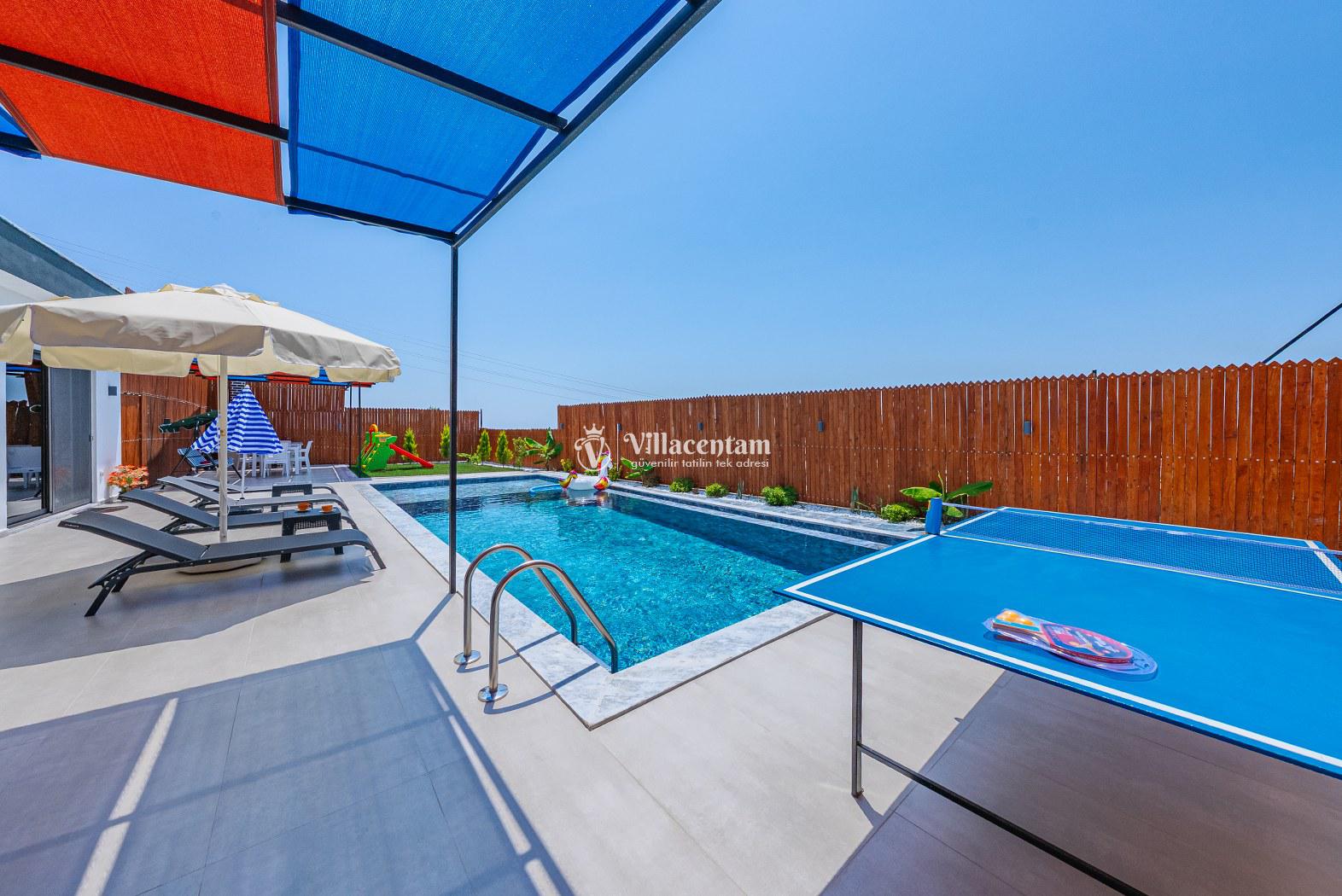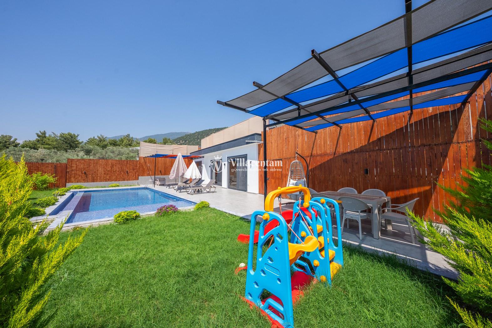 Modern ve kullanışlı şekilde dizayn edilen villamızda geniş bahçe ve havuz terası, şezlong alanı, oturma grubu, salıncak ve barbekü bölümü yer almakta olup sevdiklerinizle birlikte keyifli vakit geçirmeniz için tüm detaylar düşünülmüştür. Doğa içerisinde sakin tatil arayan misafirler için oldukça uygun bir alternatiftir.