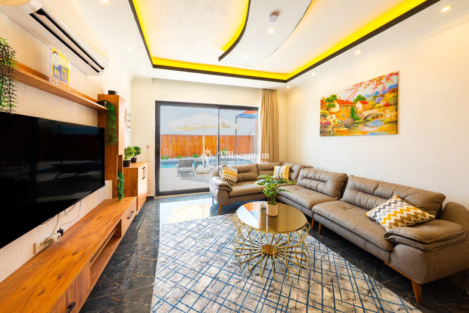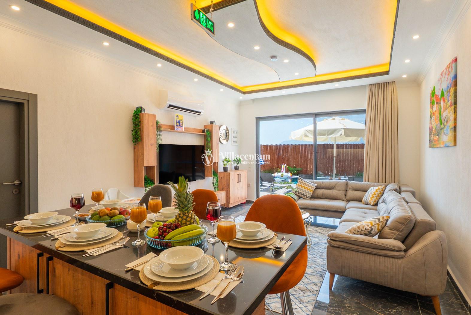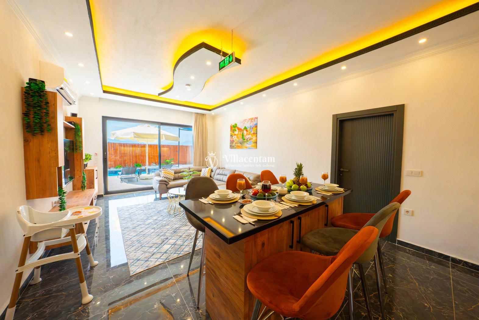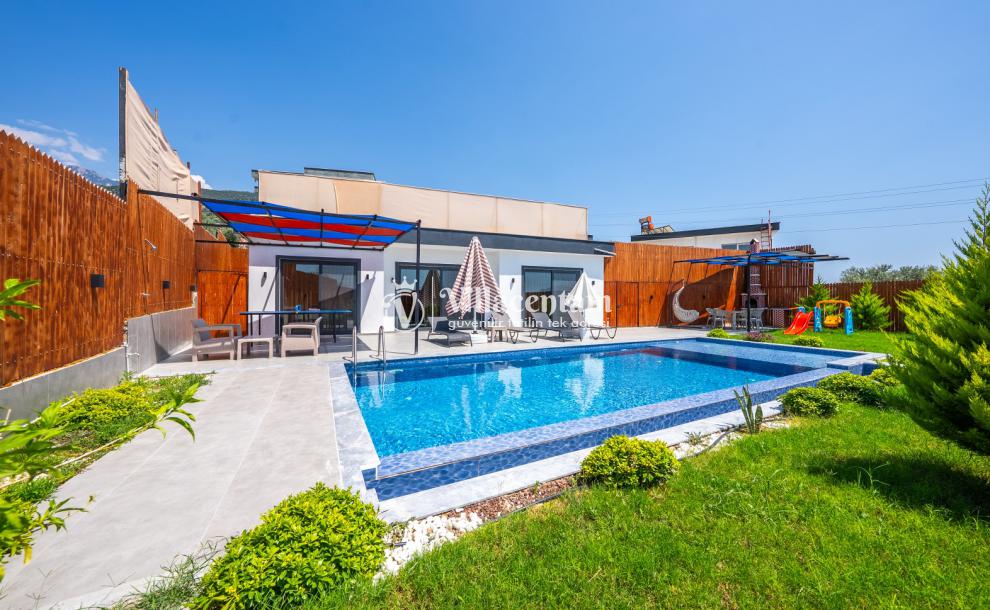 Modern ve kullanışlı şekilde dizayn edilen villamızda geniş bahçe ve havuz terası, şezlong alanı, oturma grubu, salıncak ve barbekü bölümü yer almakta olup sevdiklerinizle birlikte keyifli vakit geçirmeniz için tüm detaylar düşünülmüştür. Doğa içerisinde sakin tatil arayan misafirler için oldukça uygun bir alternatiftir.