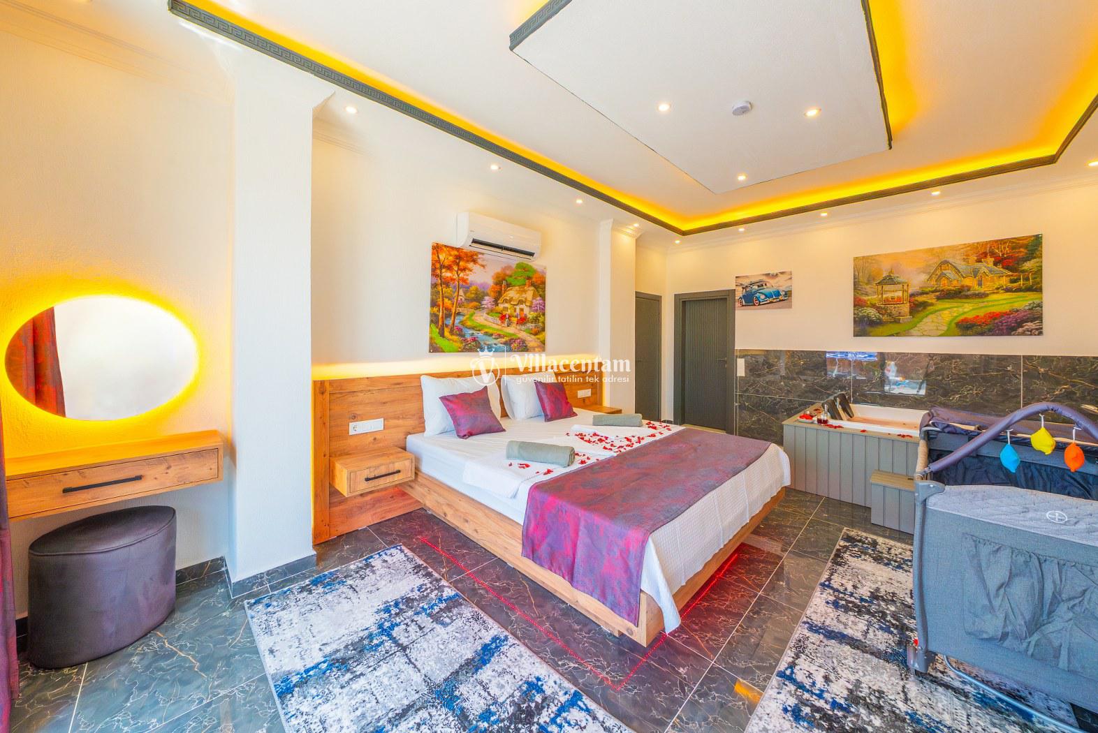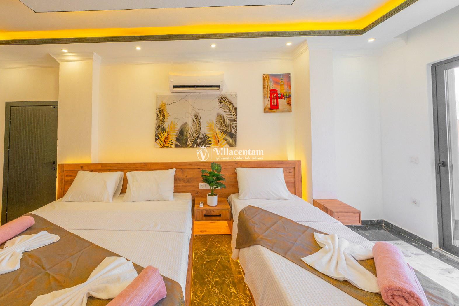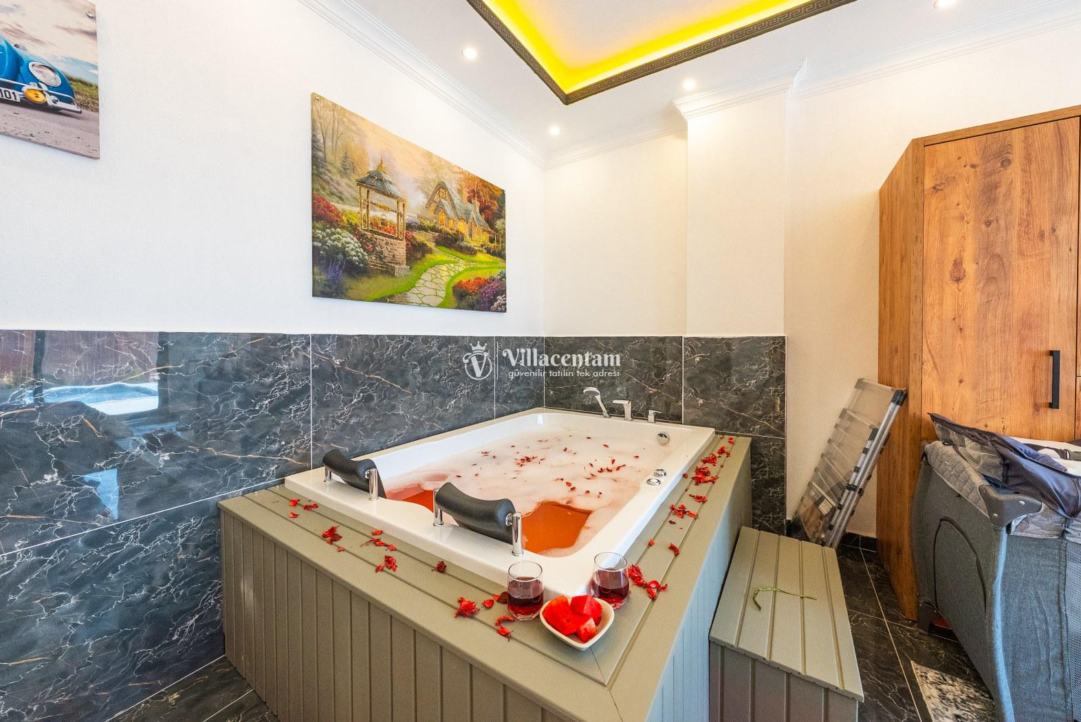 *Villalarda sıcak su için güneş enerjili su ısıtma sistemleri kullanılmaktadır. Çok yoğun sıcak su kullanımında, yoğunluğa ve su tankının büyüklüğüne bağlı olarak su tankında sıcak su tükenebilmekte ve tekrar suyun ısınması için belirli bir süre geçmesi gerekmektedir. Bu not sadece bu villa ile ilgili değil, tüm villalarımız için geçerli bir durumdur.