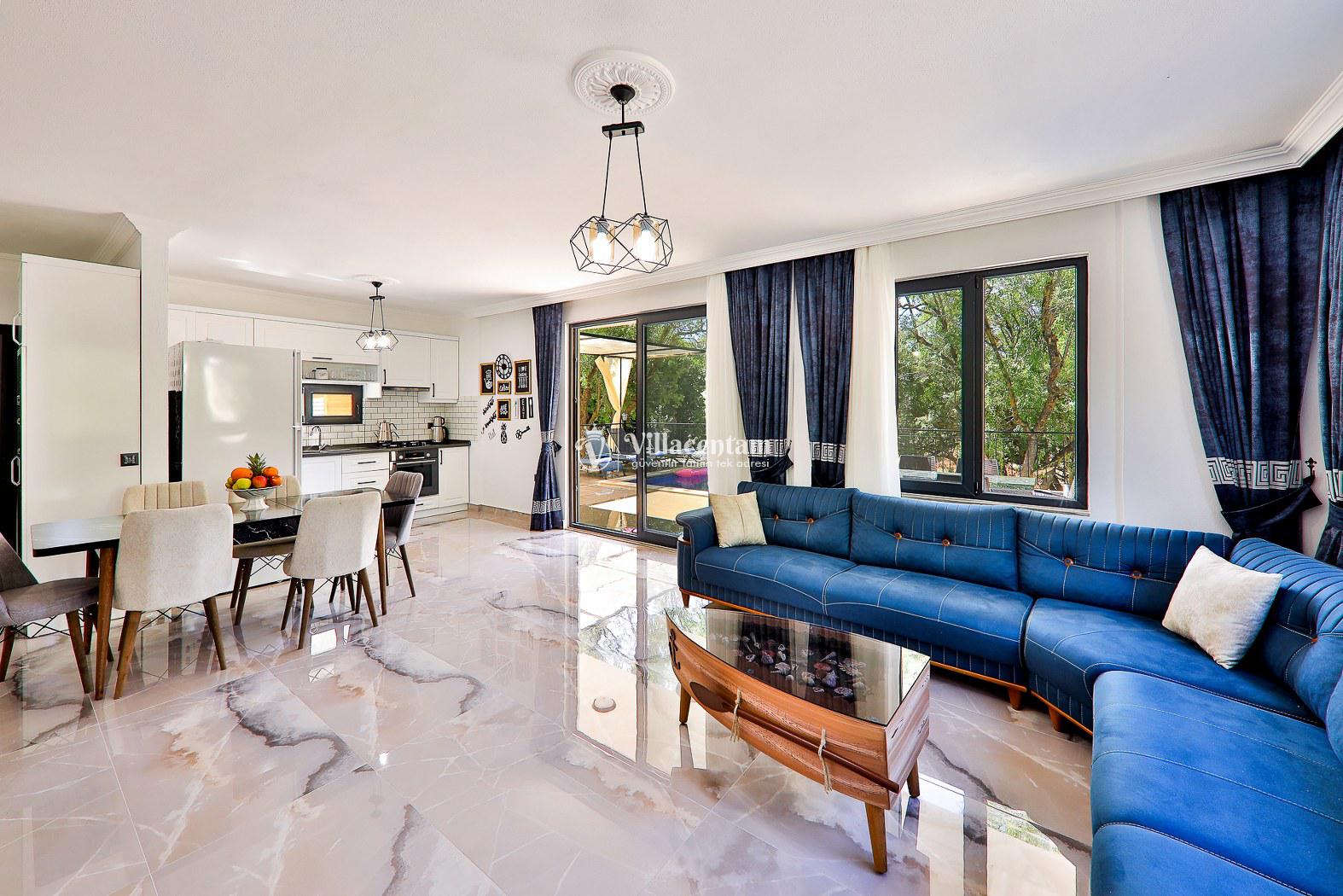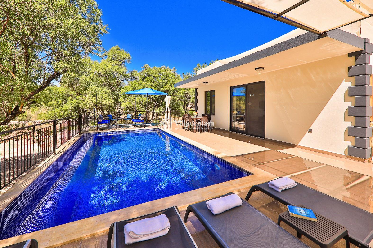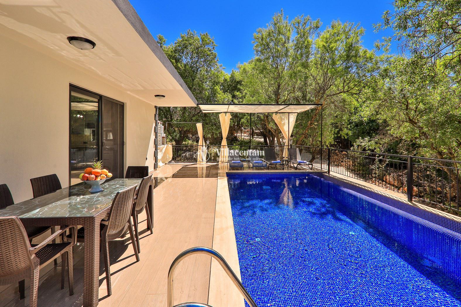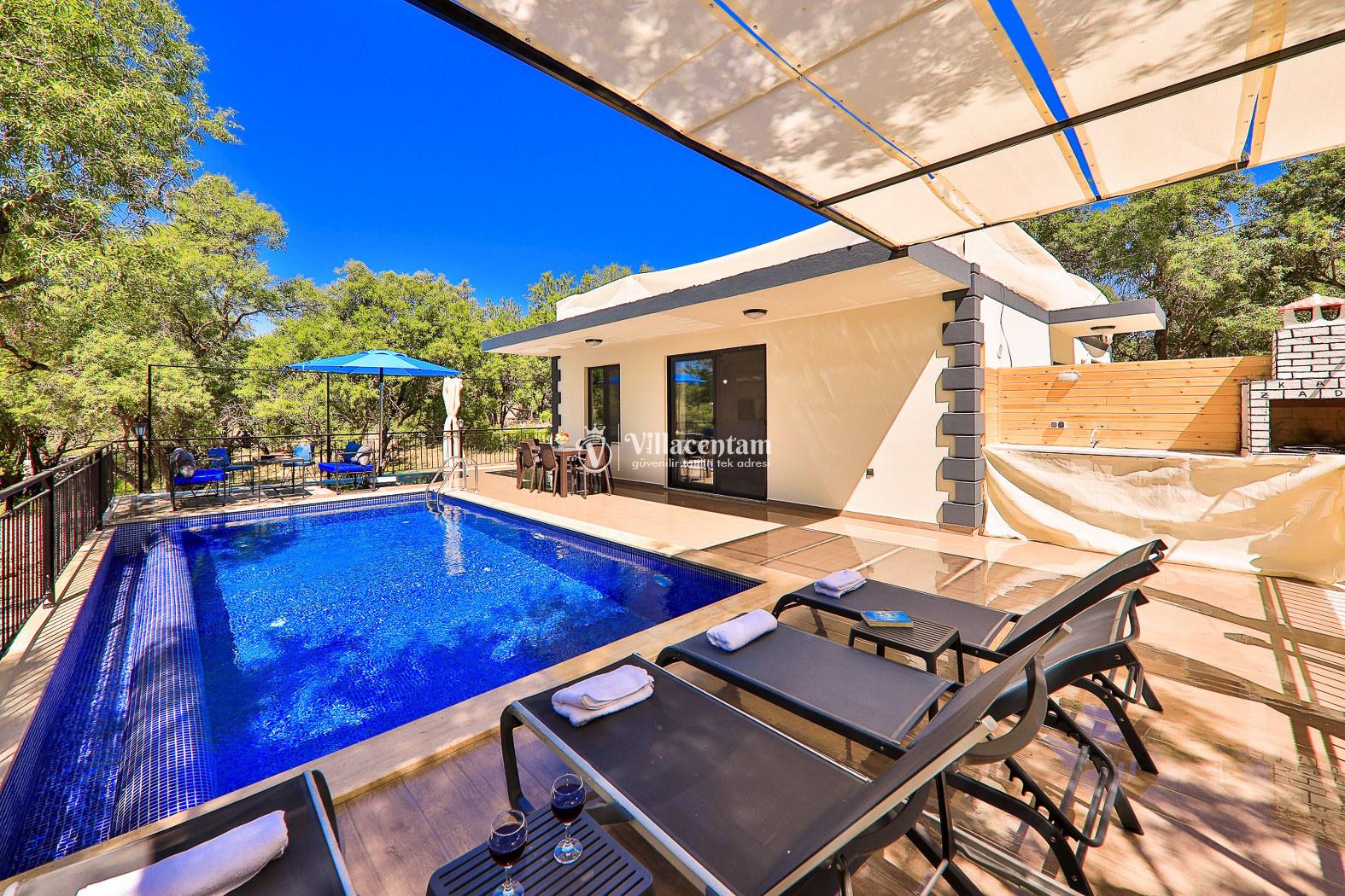 Villanın dış alanı, gün ışığıyla bütünleşen geniş bahçesi ve korunaklı özel yüzme havuzu ile tatilinizi bir adım öteye taşır. Havuz kenarında şezlonglarda dinlenebilir, akşamları barbekü keyfi yapabilir veya açık havadaki konforlu oturma köşelerinde gün batımını izleyebilirsiniz.