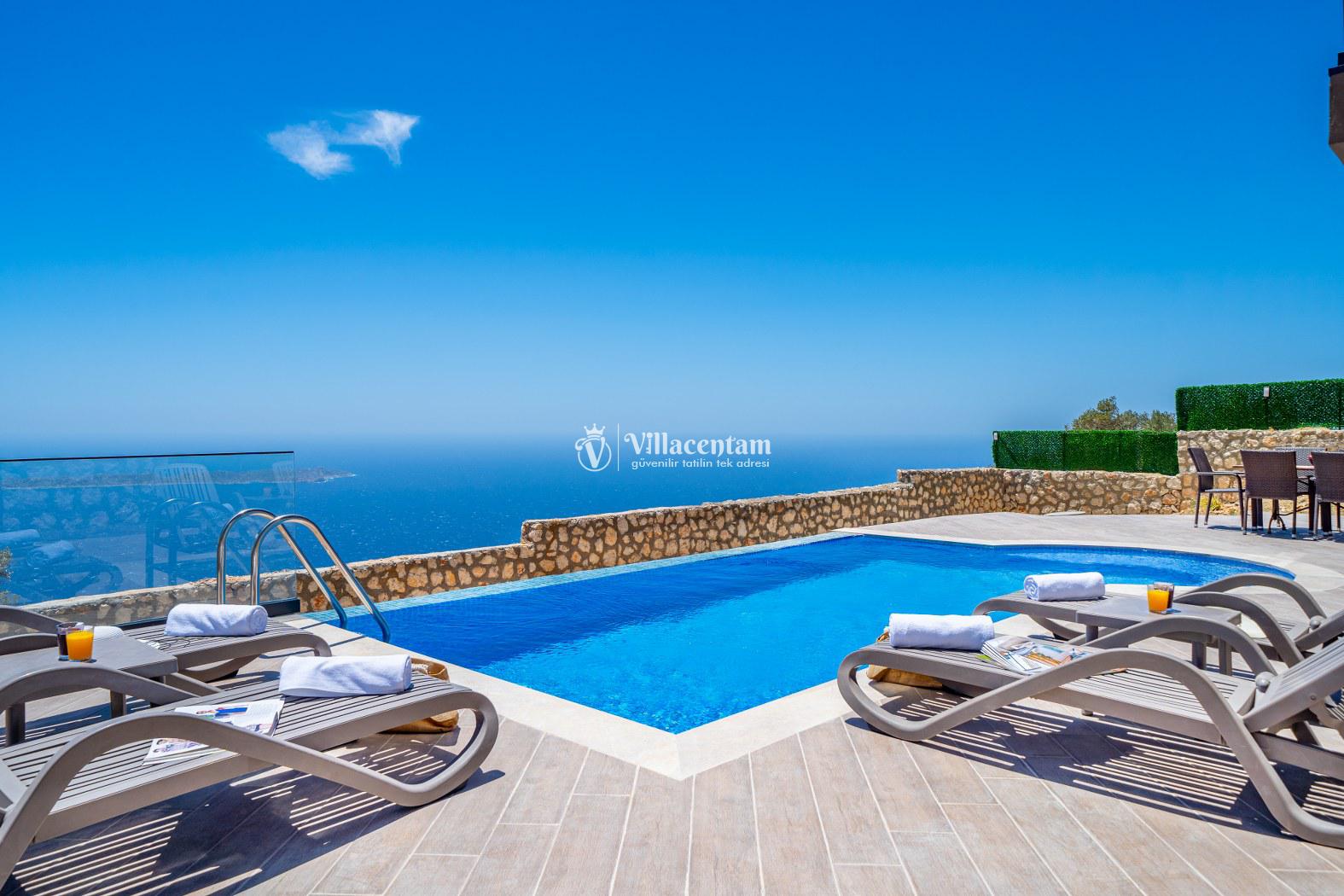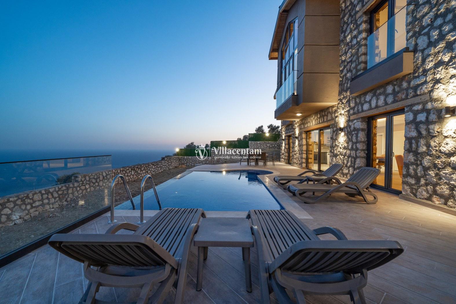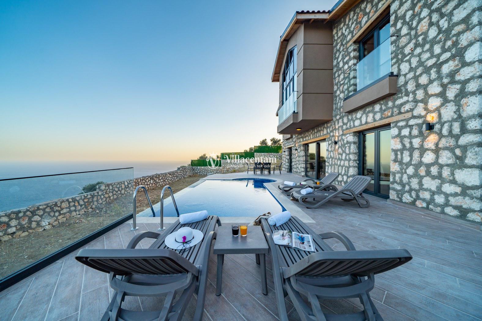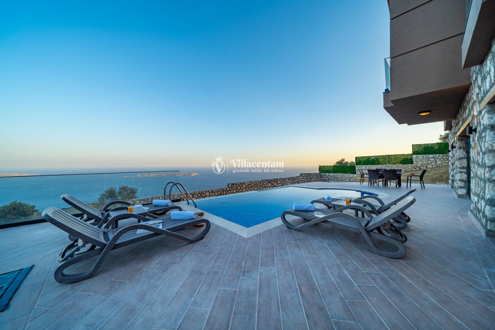 Villanın dış alanında yer alan özel yüzme havuzu ve geniş teras bölümü, deniz manzarasına karşı keyifli anlar yaşamanız için tasarlanmıştır. Havuz alanı korunaklı değildir; bu nedenle villa muhafazakâr hassasiyeti olmayan misafirler için uygundur. Güneşlenme alanları ve açık hava oturma bölümleri ile sevdiklerinizle birlikte unutulmaz tatil anları yaşayabilirsiniz.