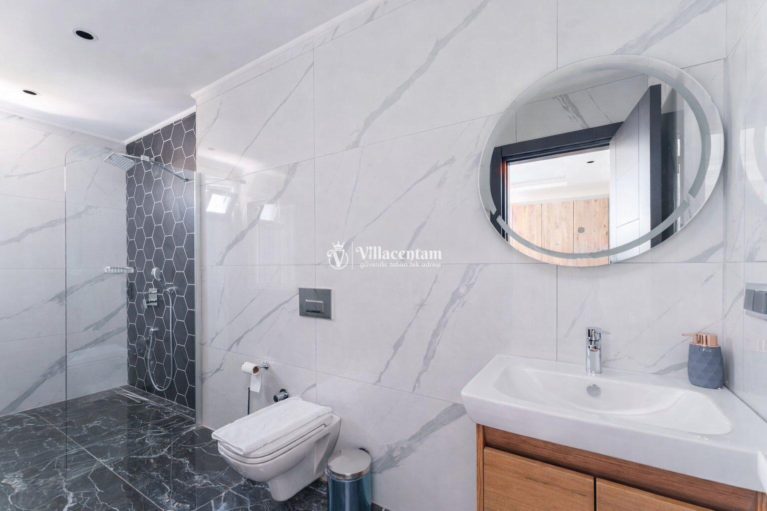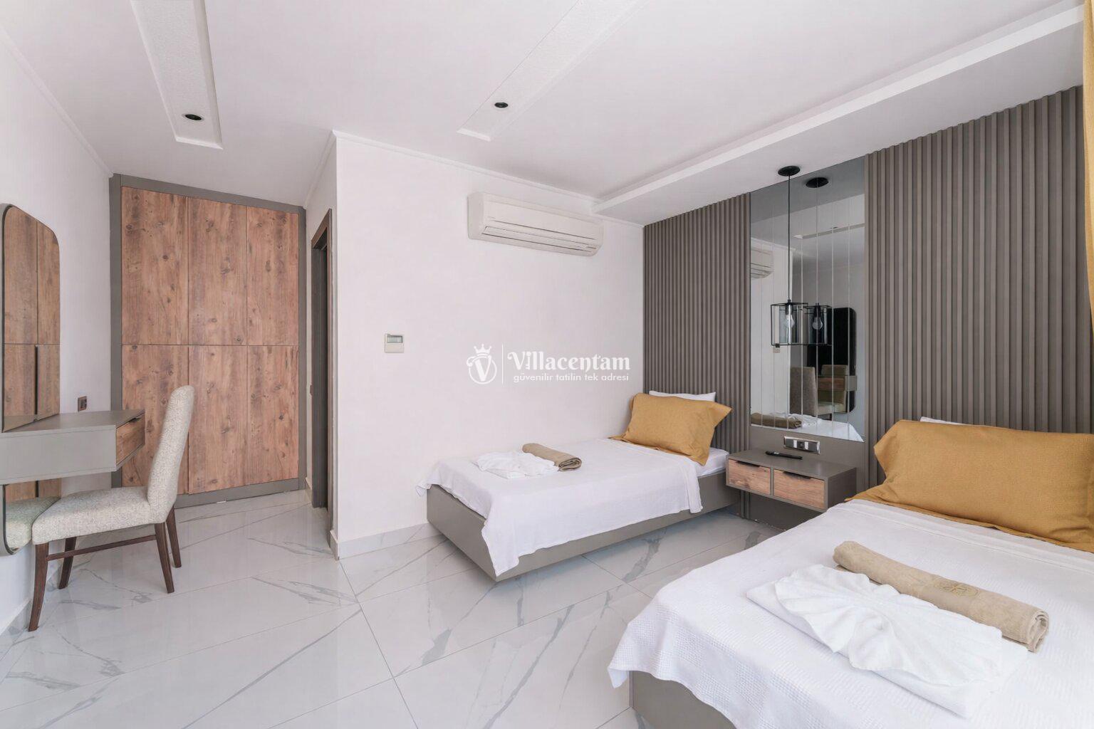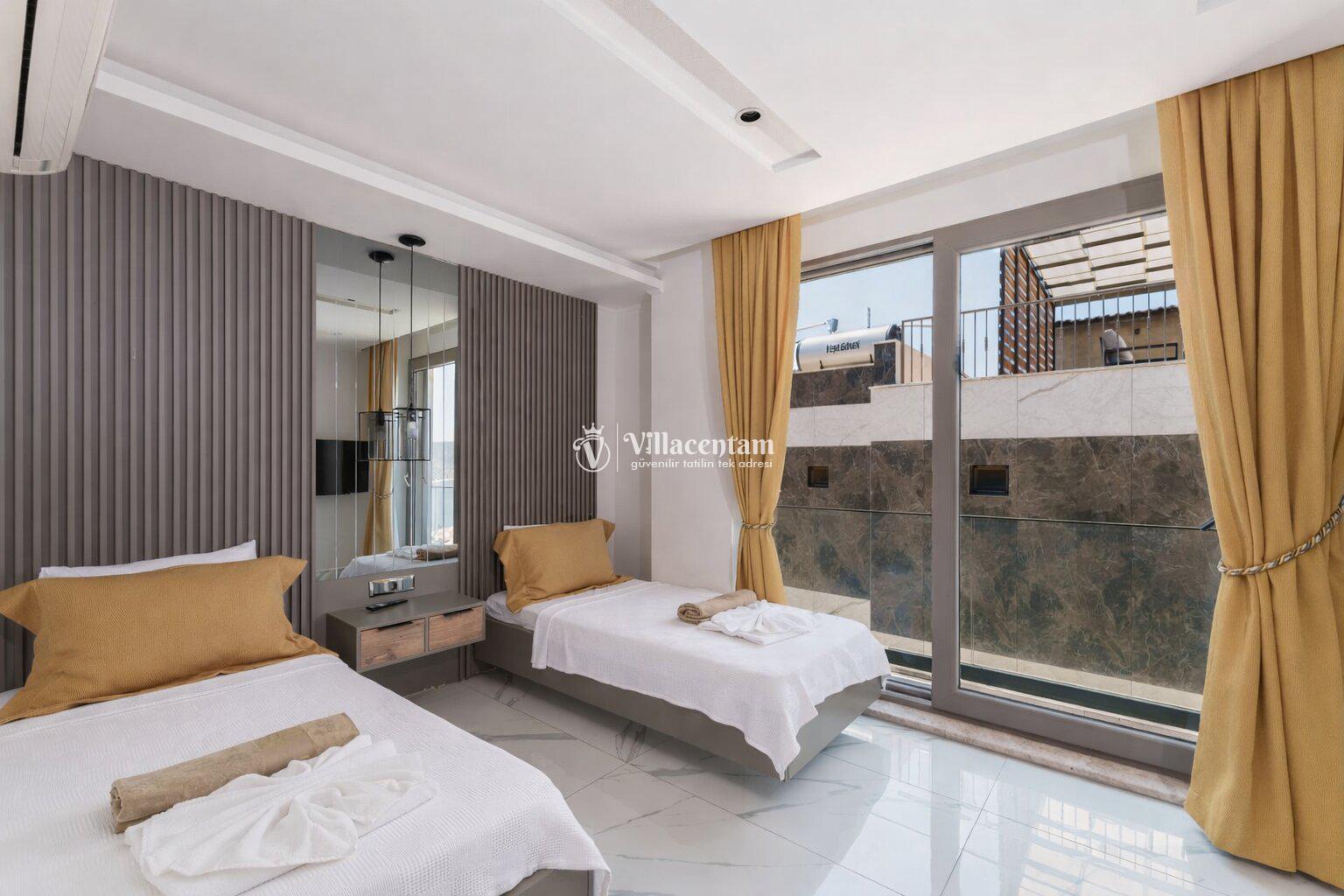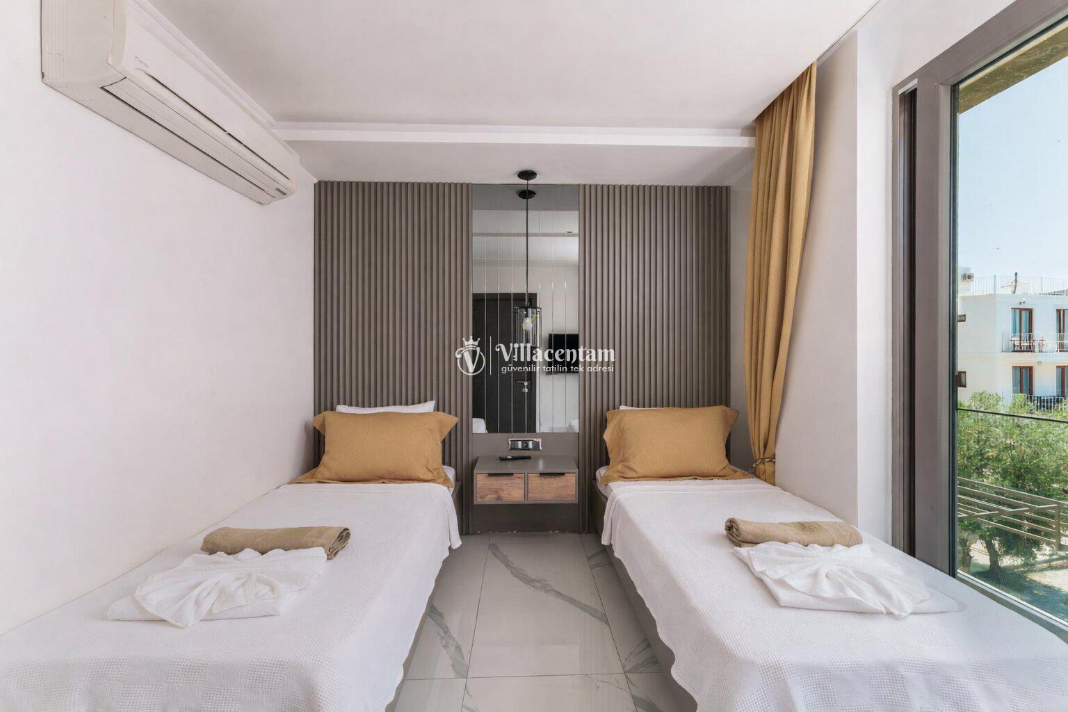 *Villalarda sıcak su için güneş enerjili su ısıtma sistemleri kullanılmaktadır. Çok yoğun sıcak su kullanımında, yoğunluğa ve su tankının büyüklüğüne bağlı olarak su tankında sıcak su tükenebilmekte ve tekrar suyun ısınması için belirli bir süre geçmesi gerekmektedir. Bu not sadece bu villa ile ilgili değil, tüm villalarımız için geçerli bir durumdur.