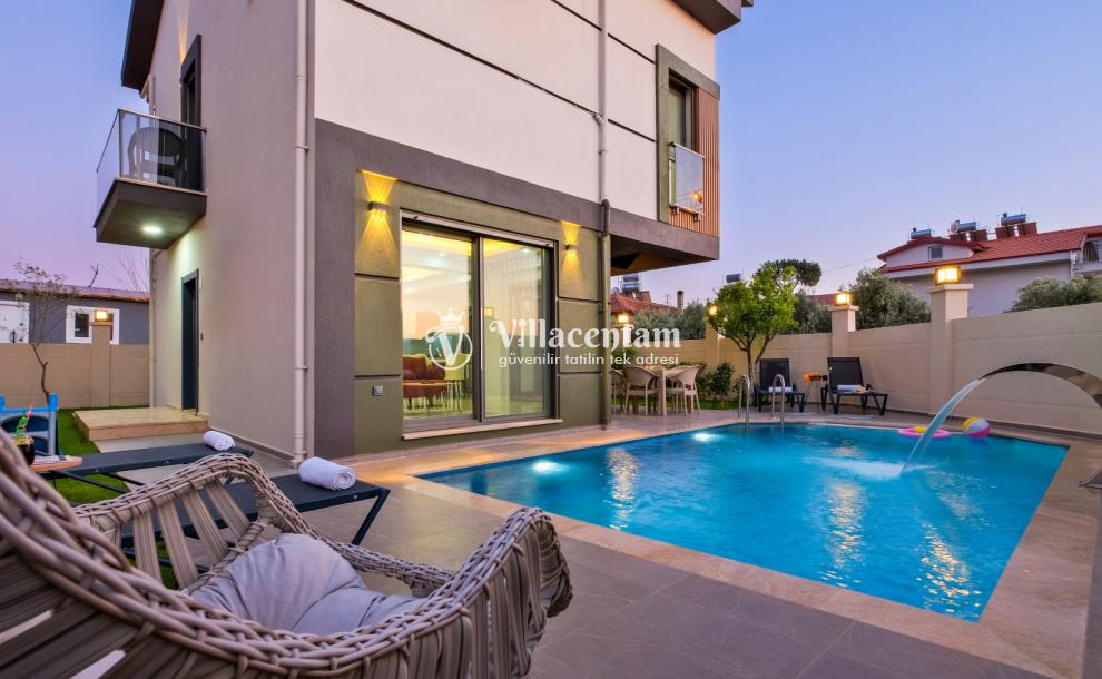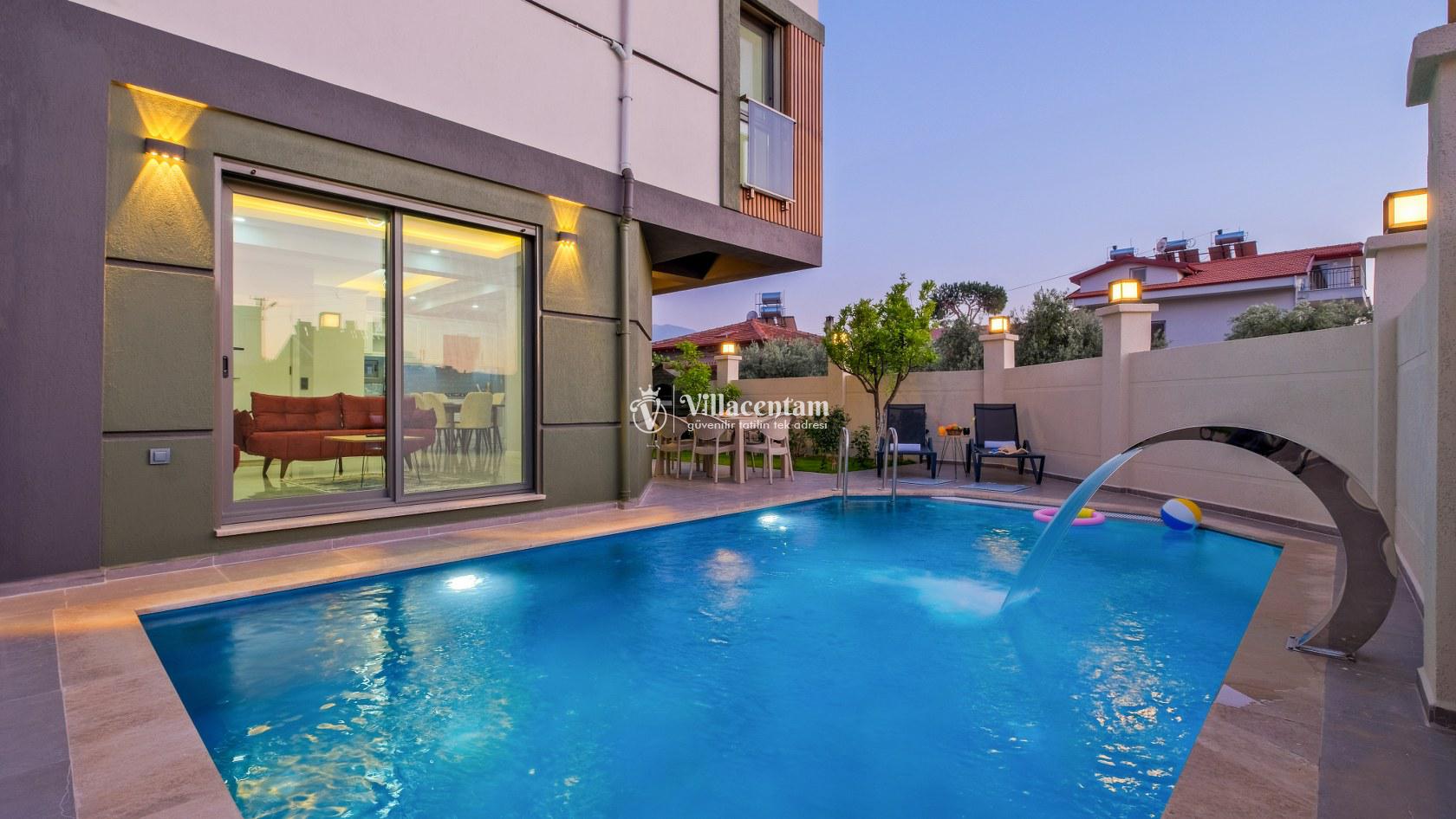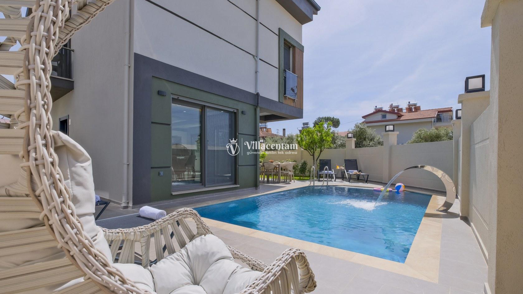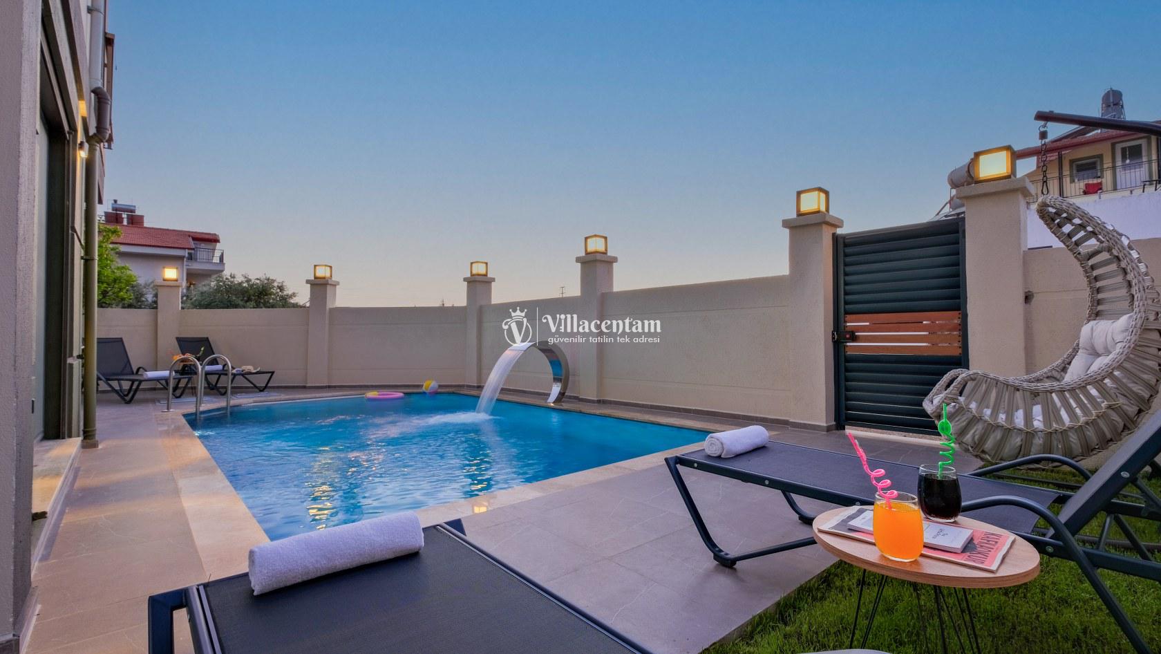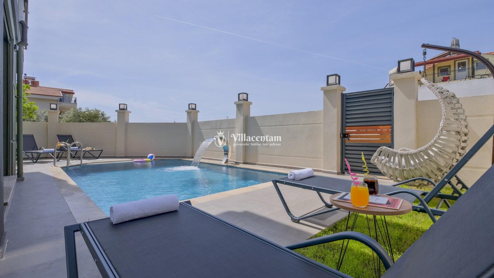 Villanın dış alanında yer alan özel yüzme havuzu, geniş bahçe ve güneşlenme alanları tatilinizi keyifli hale getirir. Şezlonglar, oturma alanı ve barbekü imkânı sayesinde gün boyu açık havanın tadını çıkarabilir, akşam saatlerinde sevdiklerinizle birlikte keyifli vakit geçirebilirsiniz. Havuz terasına açılan salon alanı, yaz aylarında ferah bir kullanım sunar.