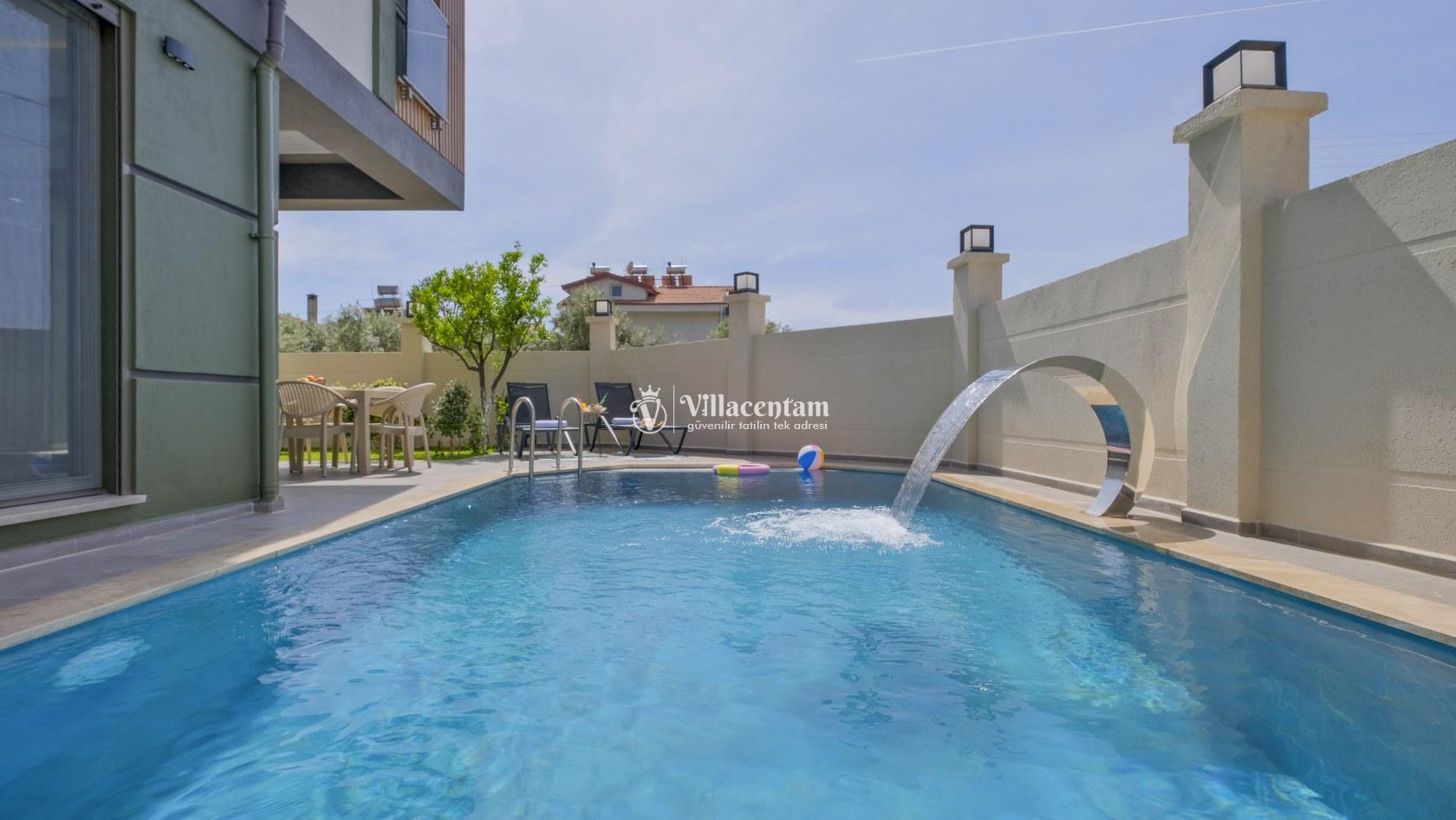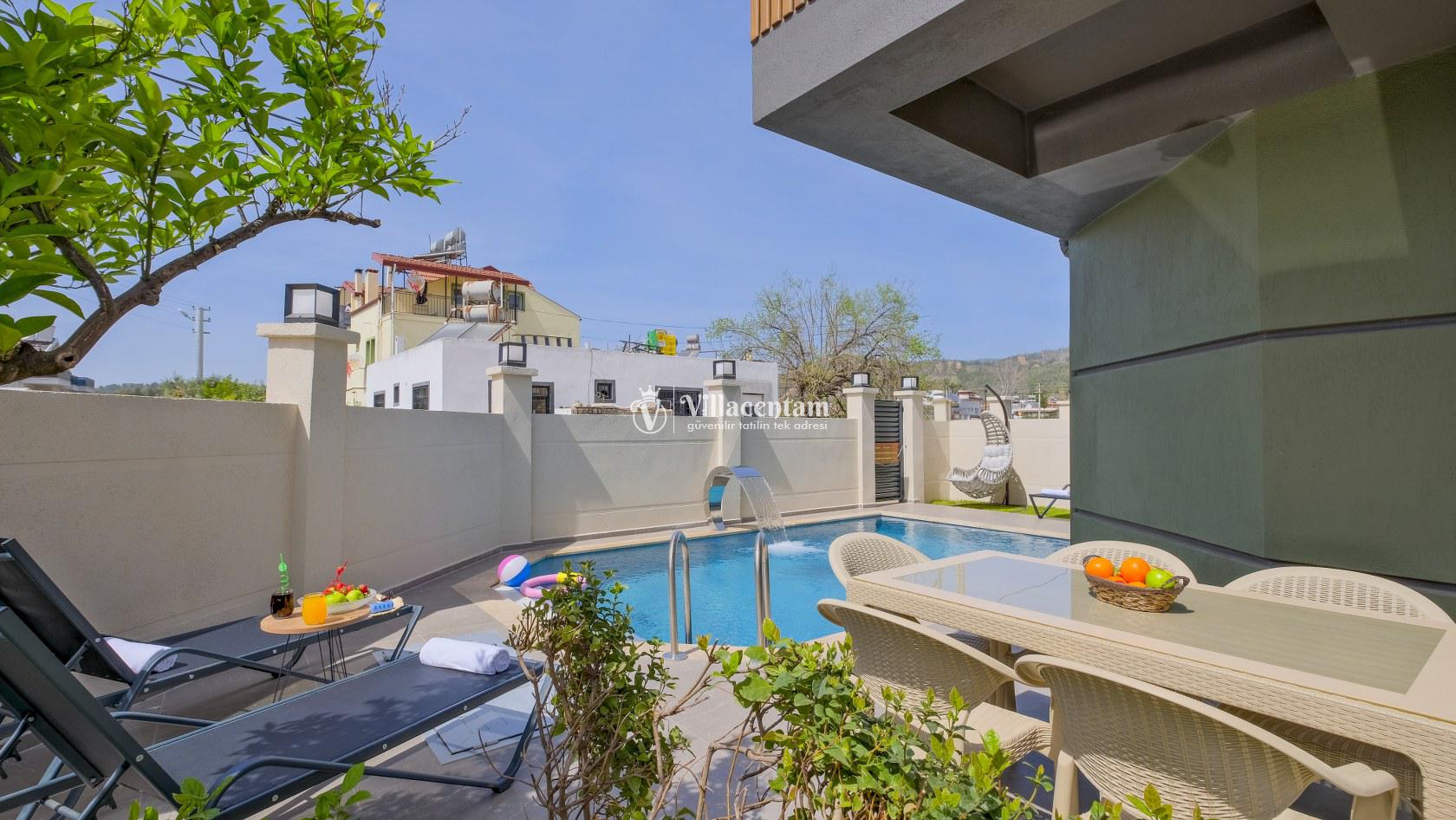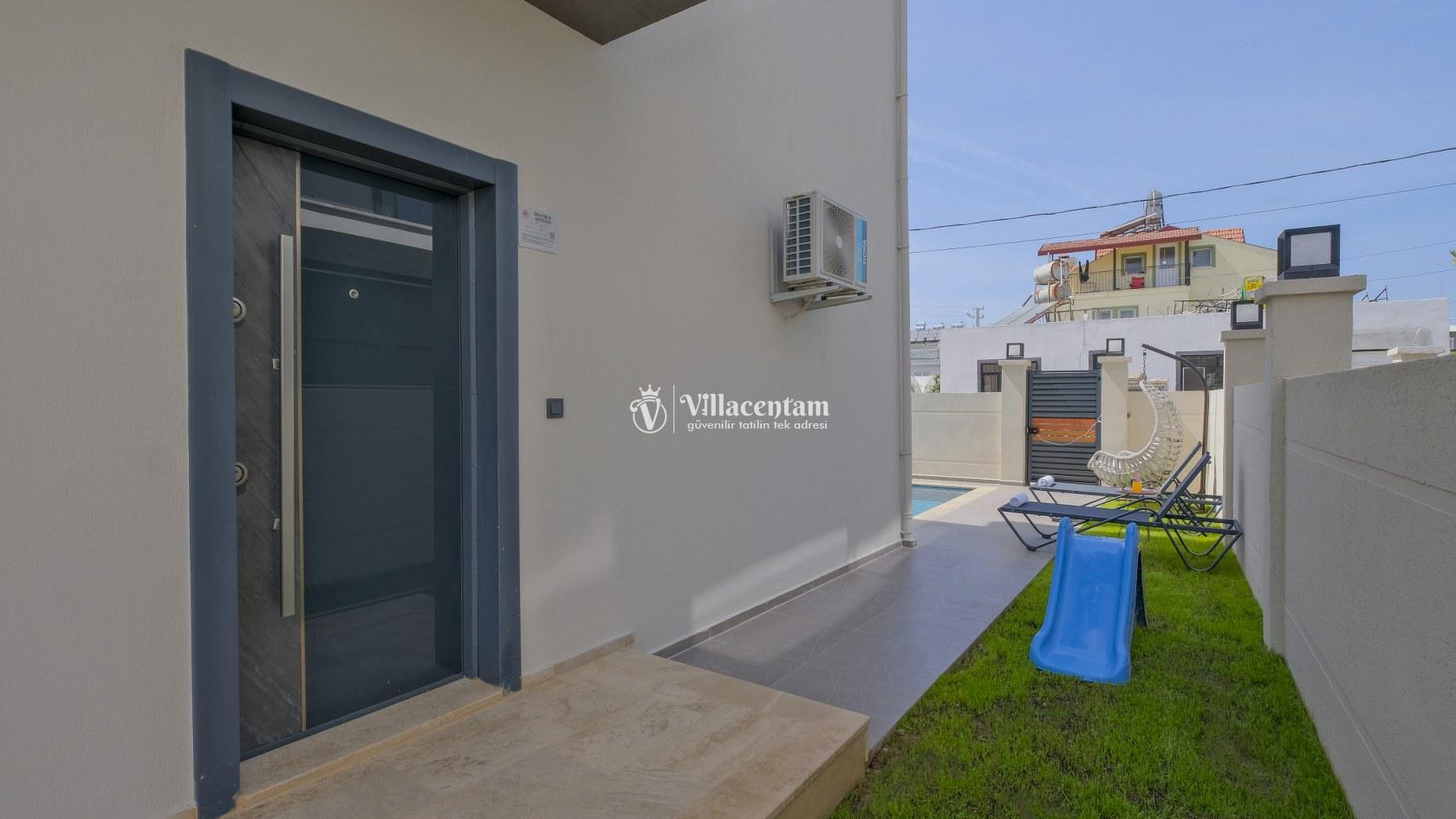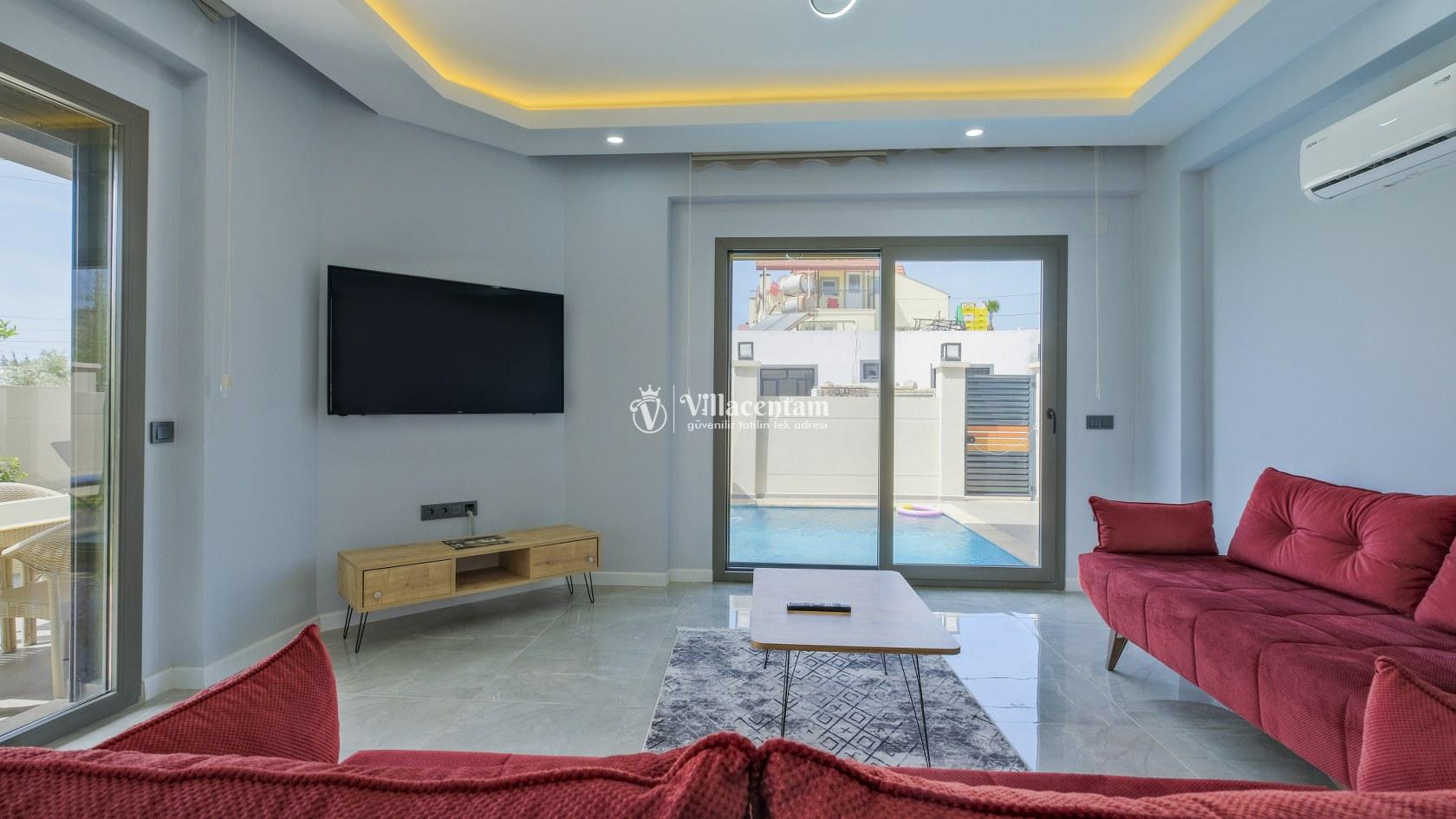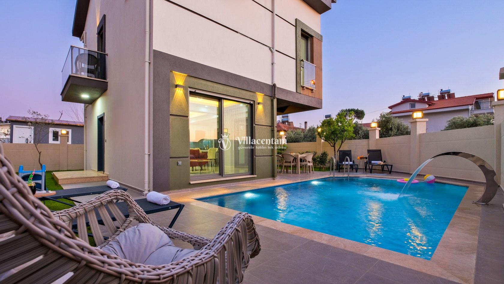 Villanın dış alanında yer alan özel yüzme havuzu, geniş bahçe ve güneşlenme alanları tatilinizi keyifli hale getirir. Şezlonglar, oturma alanı ve barbekü imkânı sayesinde gün boyu açık havanın tadını çıkarabilir, akşam saatlerinde sevdiklerinizle birlikte keyifli vakit geçirebilirsiniz. Havuz terasına açılan salon alanı, yaz aylarında ferah bir kullanım sunar.