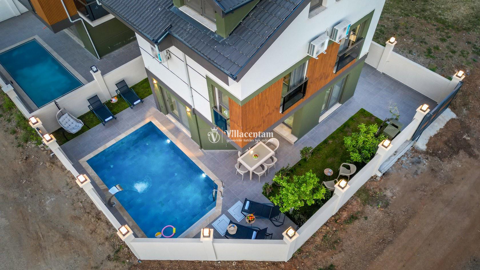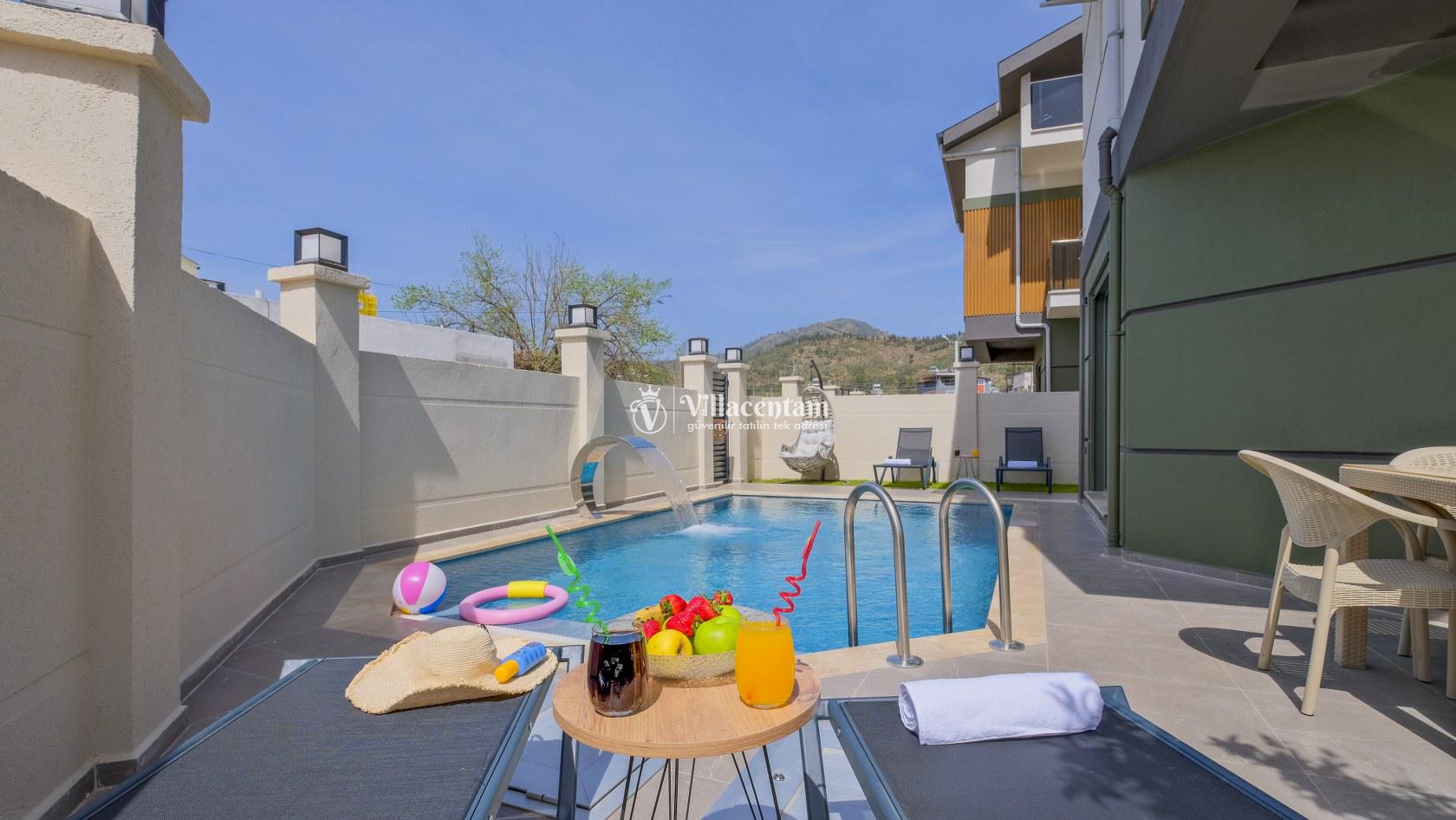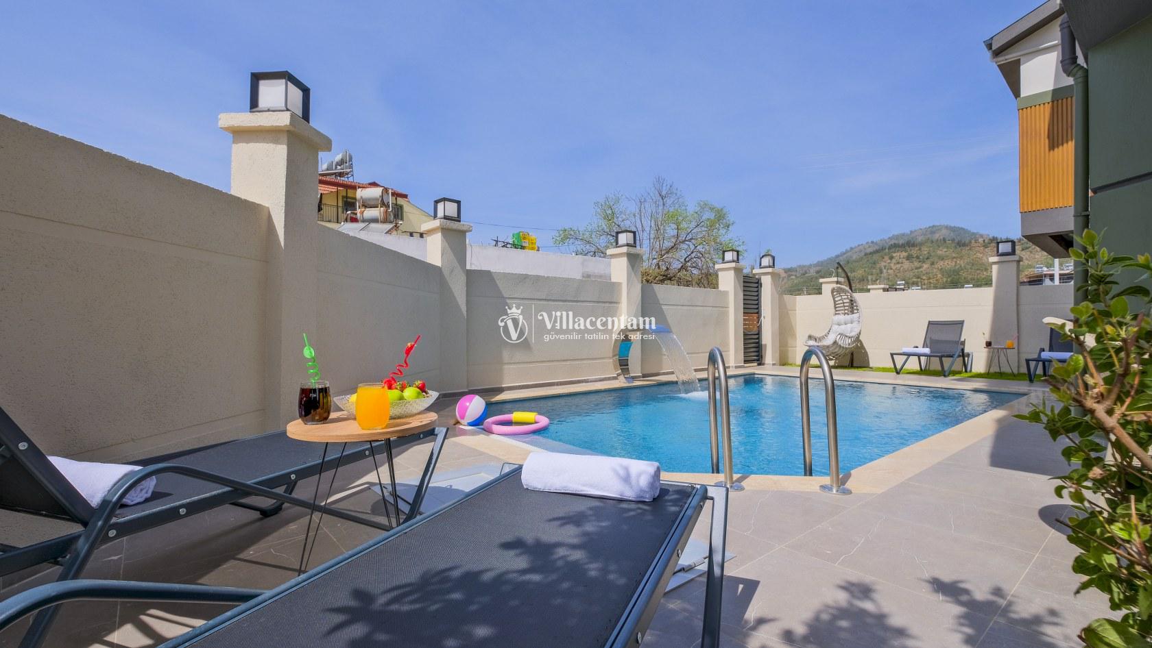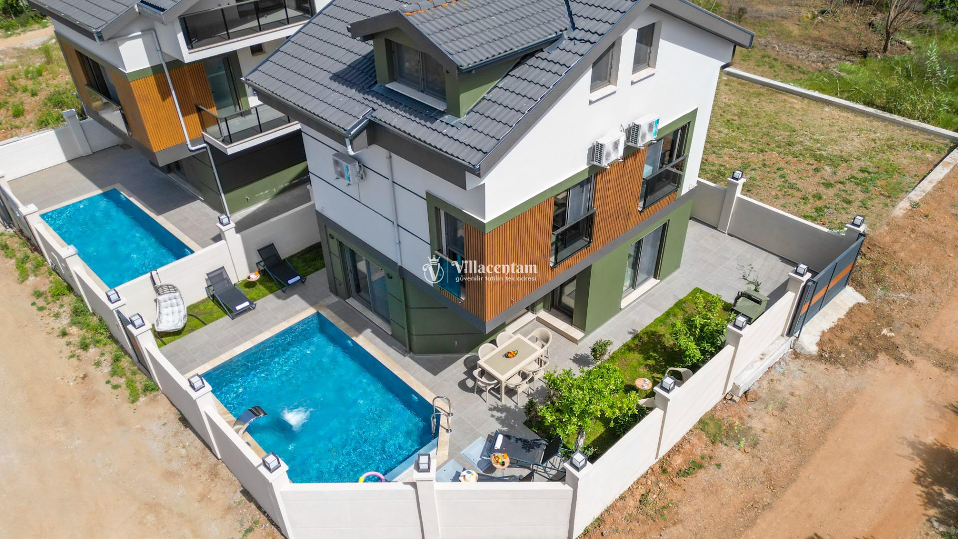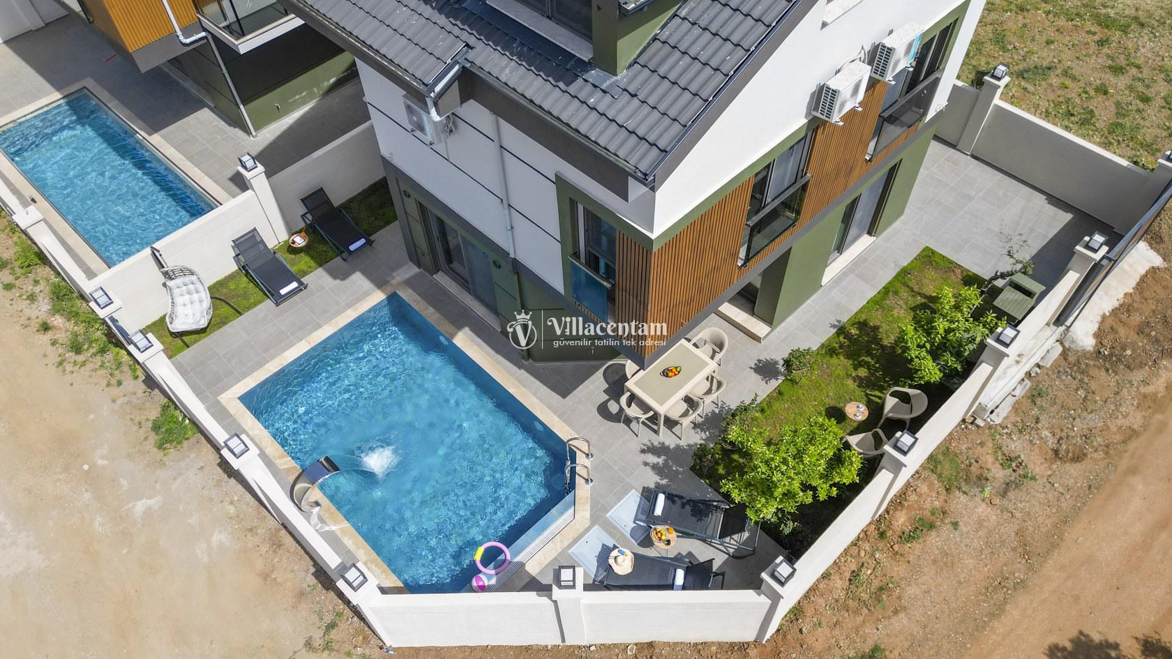 Villanın dış alanında yer alan özel yüzme havuzu, geniş bahçe ve güneşlenme alanları tatilinizi keyifli hale getirir. Şezlonglar, oturma alanı ve barbekü imkânı sayesinde gün boyu açık havanın tadını çıkarabilir, akşam saatlerinde sevdiklerinizle birlikte keyifli vakit geçirebilirsiniz. Havuz terasına açılan salon alanı, yaz aylarında ferah bir kullanım sunar.
