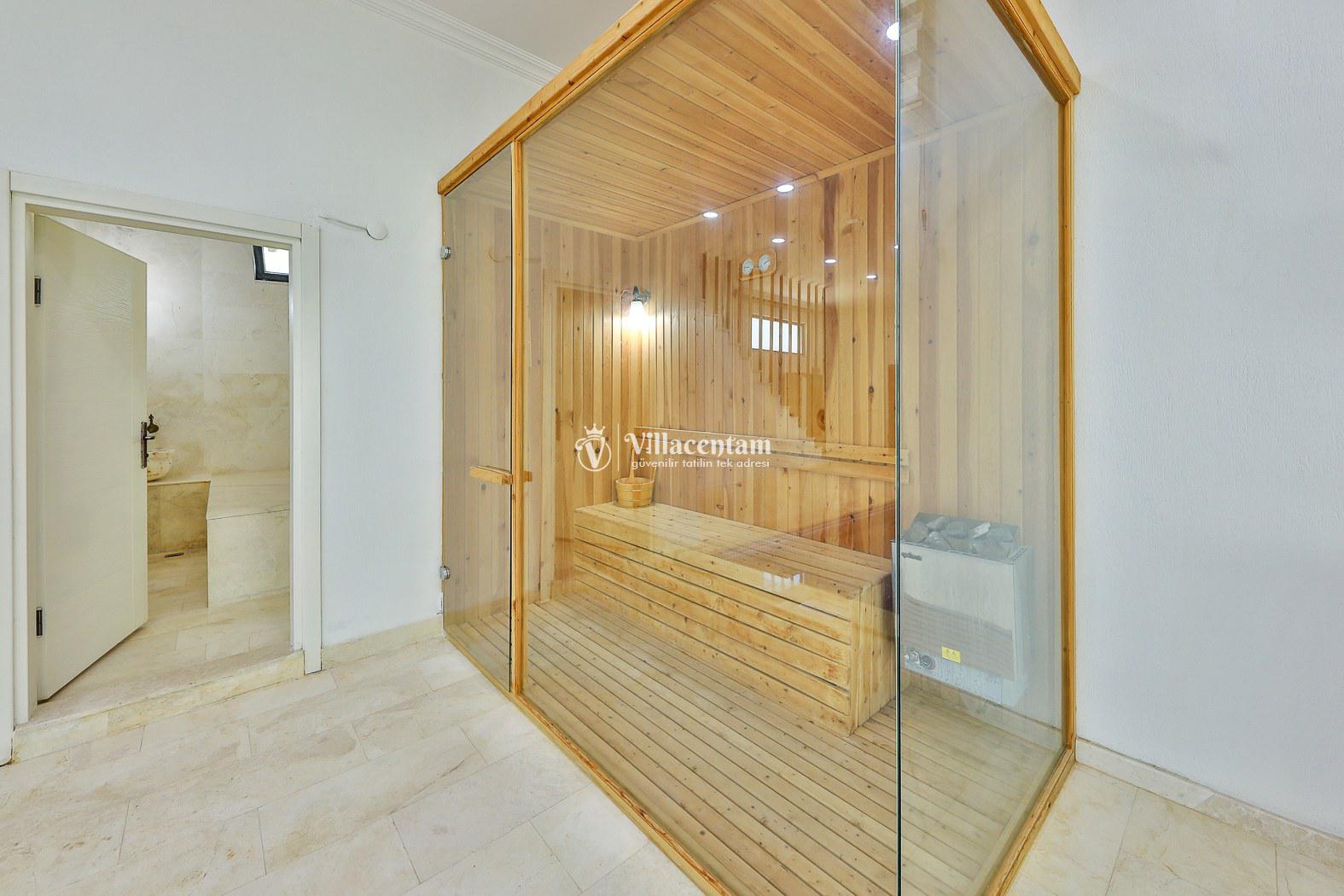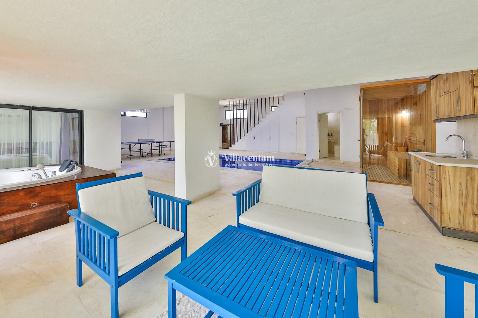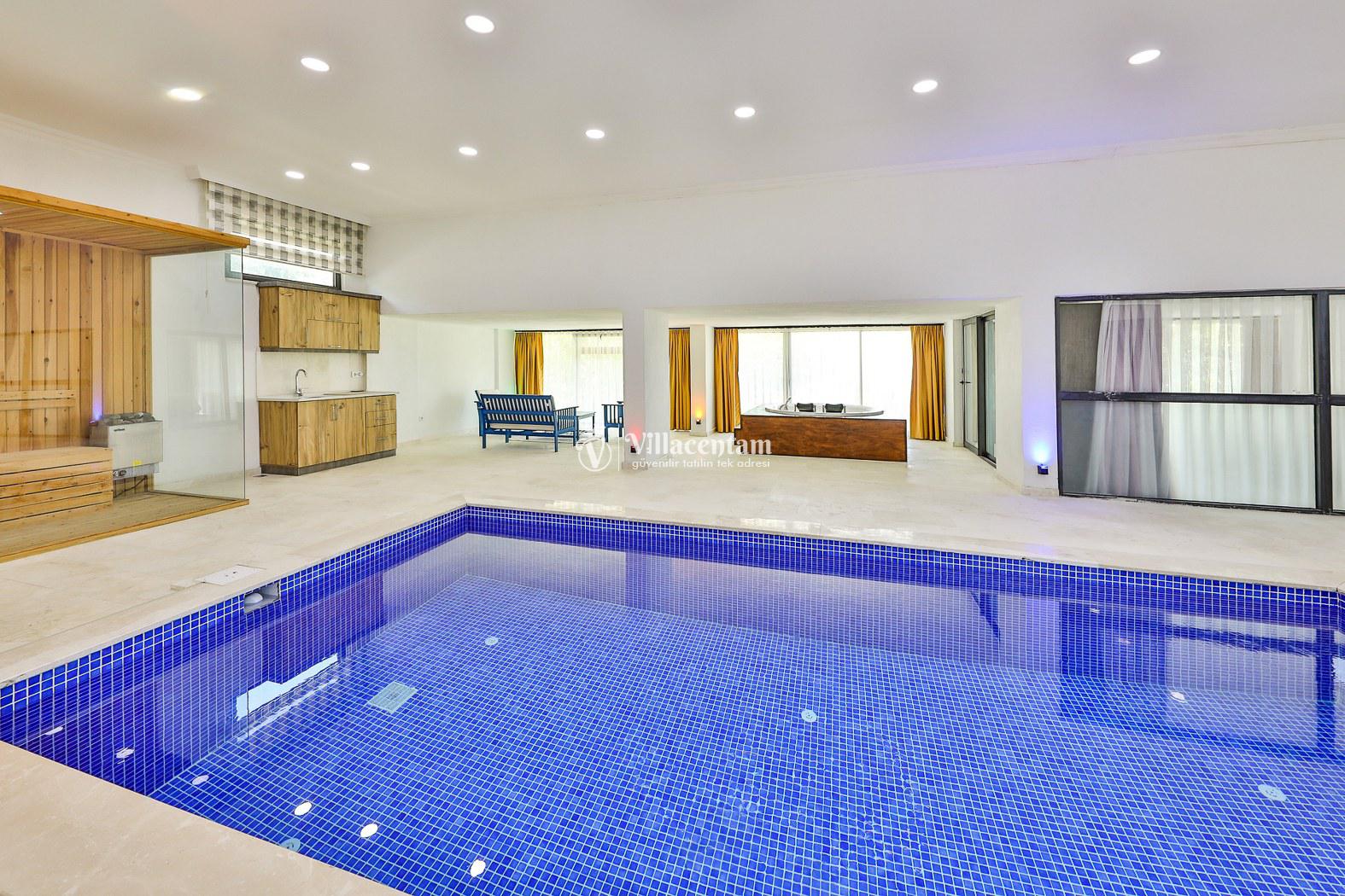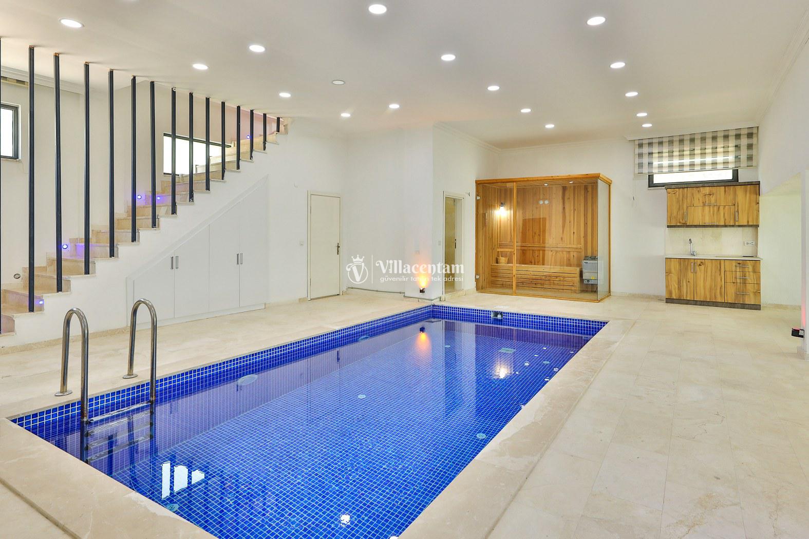 Villanın en dikkat çekici özelliklerinden biri, kapalı iç havuzunun bulunmasıdır. Bu alan içerisinde jakuzi, masa tenisi, 1 yatak odası ve sauna yer almakta olup, dört mevsim keyifli ve konforlu bir kullanım imkânı sunar.