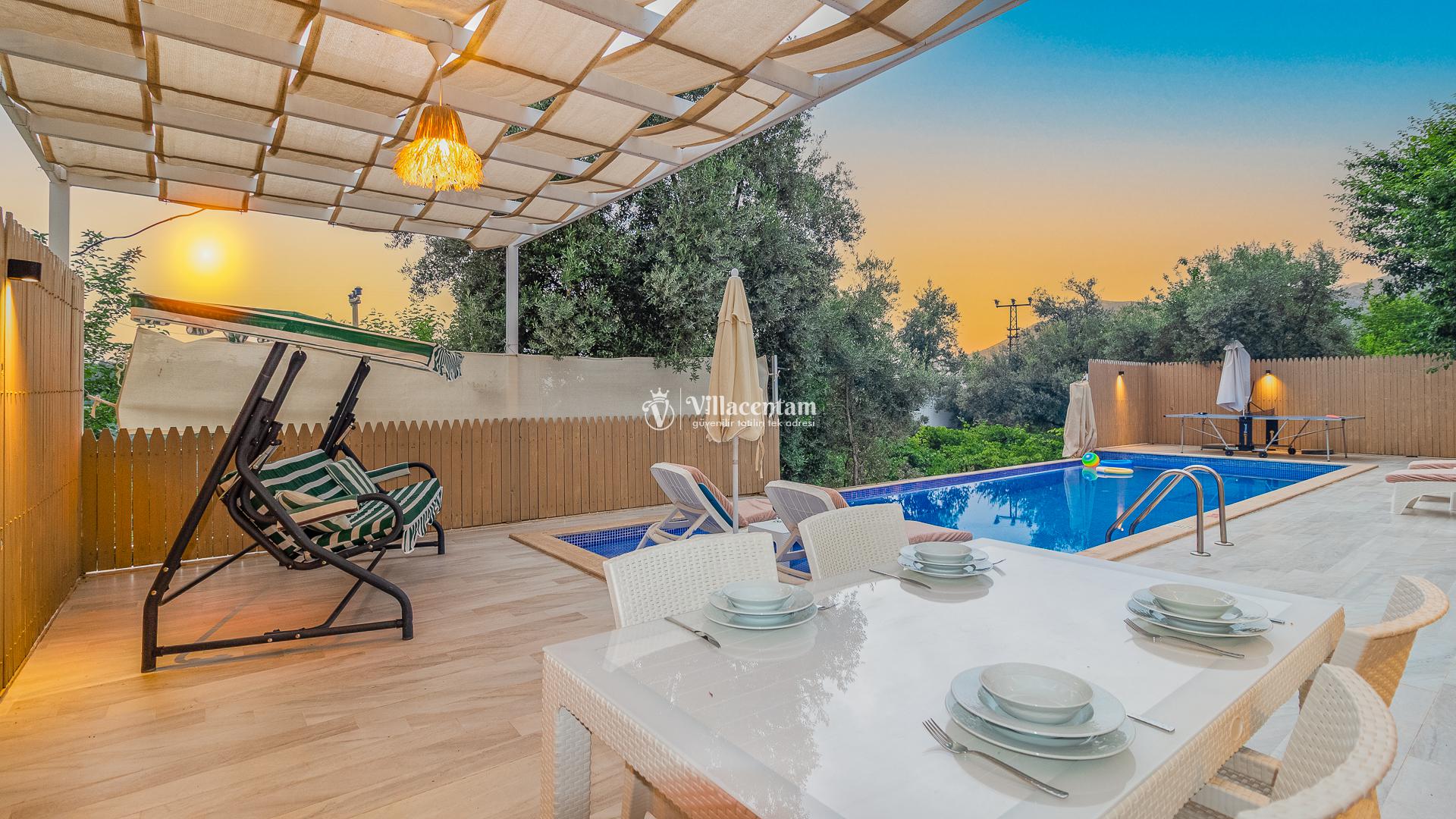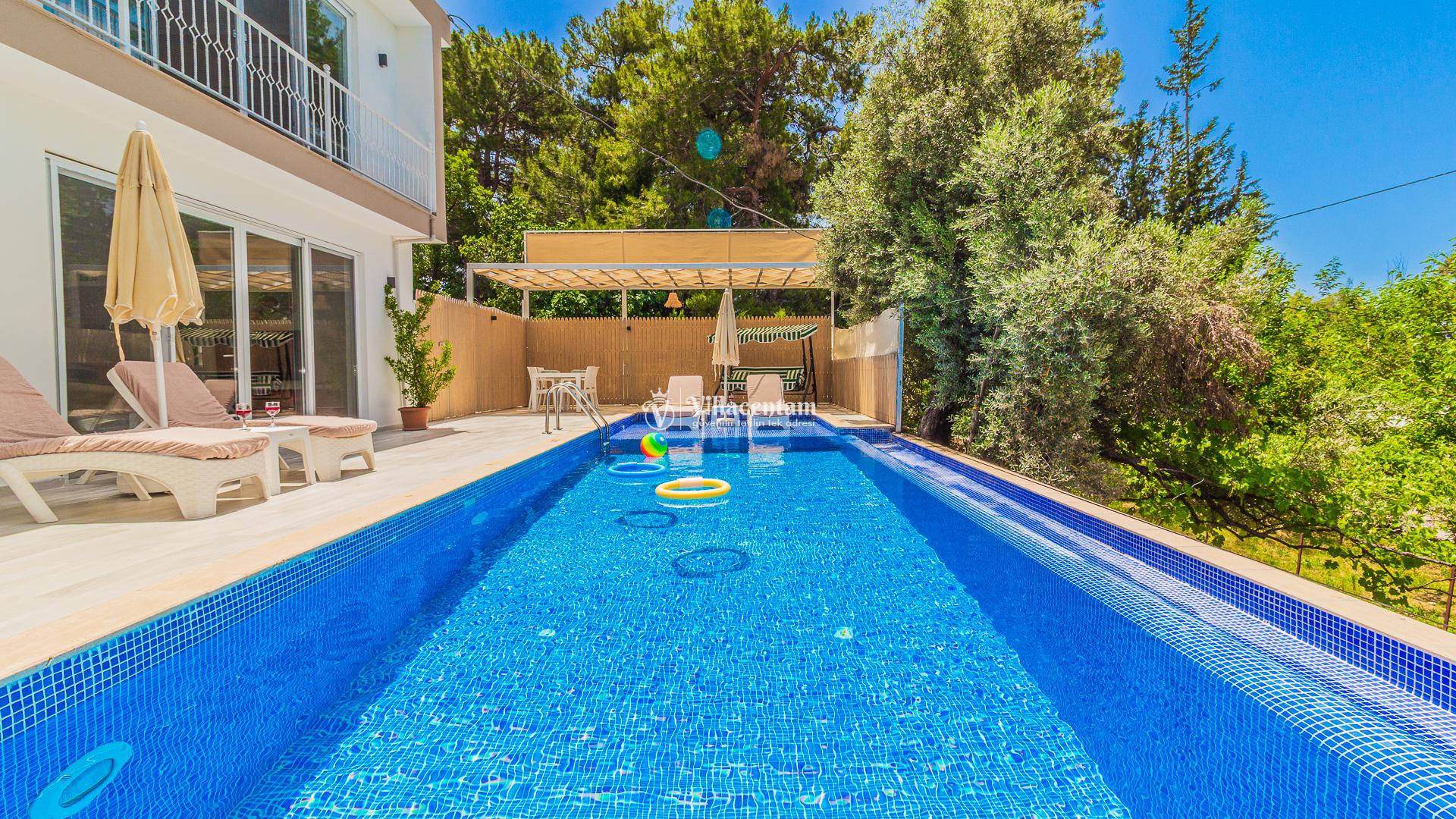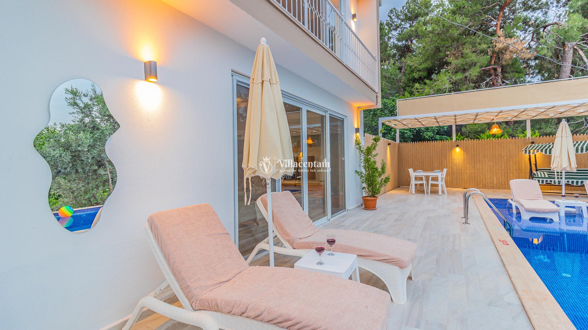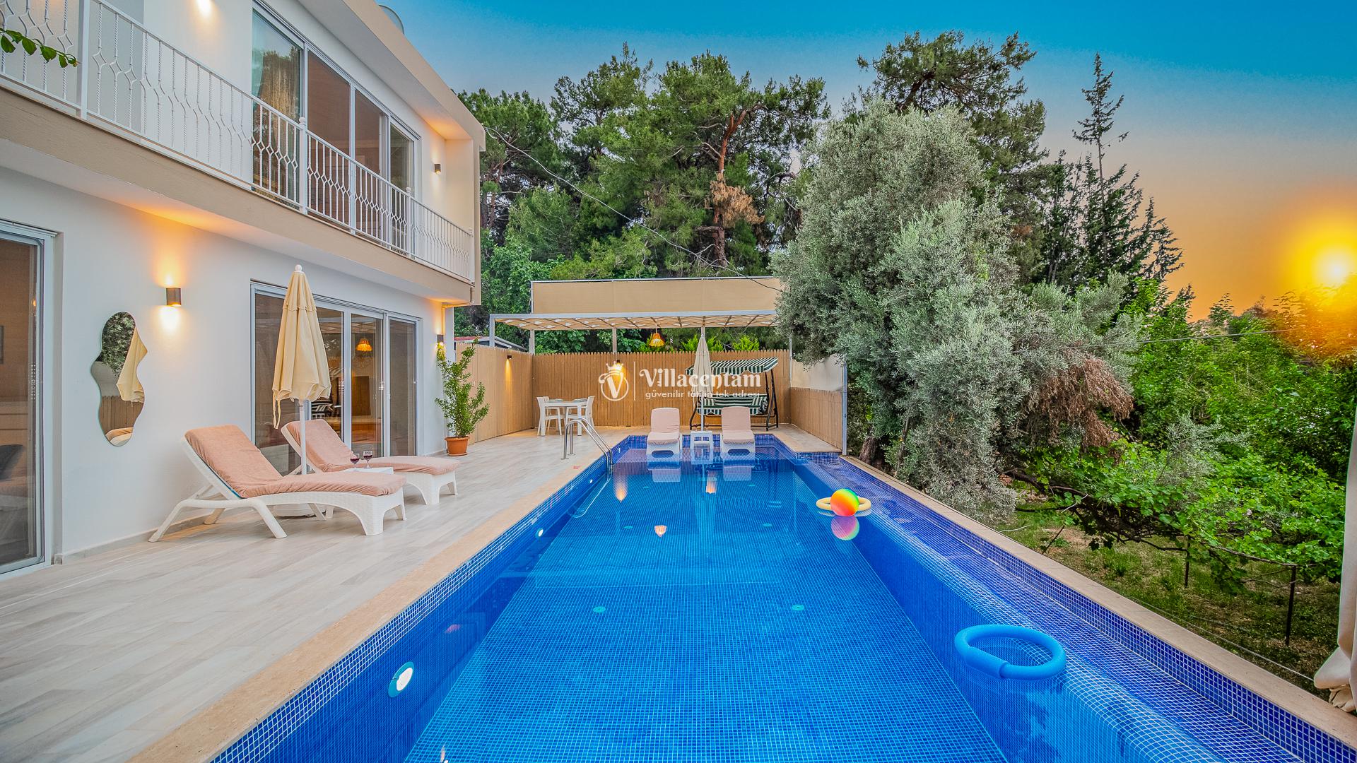 Villamızda bulunan özel yüzme havuzu, dışarıdan görünmeyecek şekilde planlanmış olup tatiliniz boyunca özgürce vakit geçirmenize olanak tanır. Jakuzi, doğanın huzur veren atmosferi eşliğinde dinlenmeniz ve günün yorgunluğunu atmanız için özel olarak tasarlanmıştır. Modern ve konforlu iç dekorasyonu, tam donanımlı mutfağı, ferah salonu ve özenle hazırlanmış yatak odaları ile evinizin rahatlığını tatilde de yaşamanızı sağlar. Şehir kalabalığından uzak, sakin ve keyifli bir tatil arayan misafirler için ideal bir villadır.