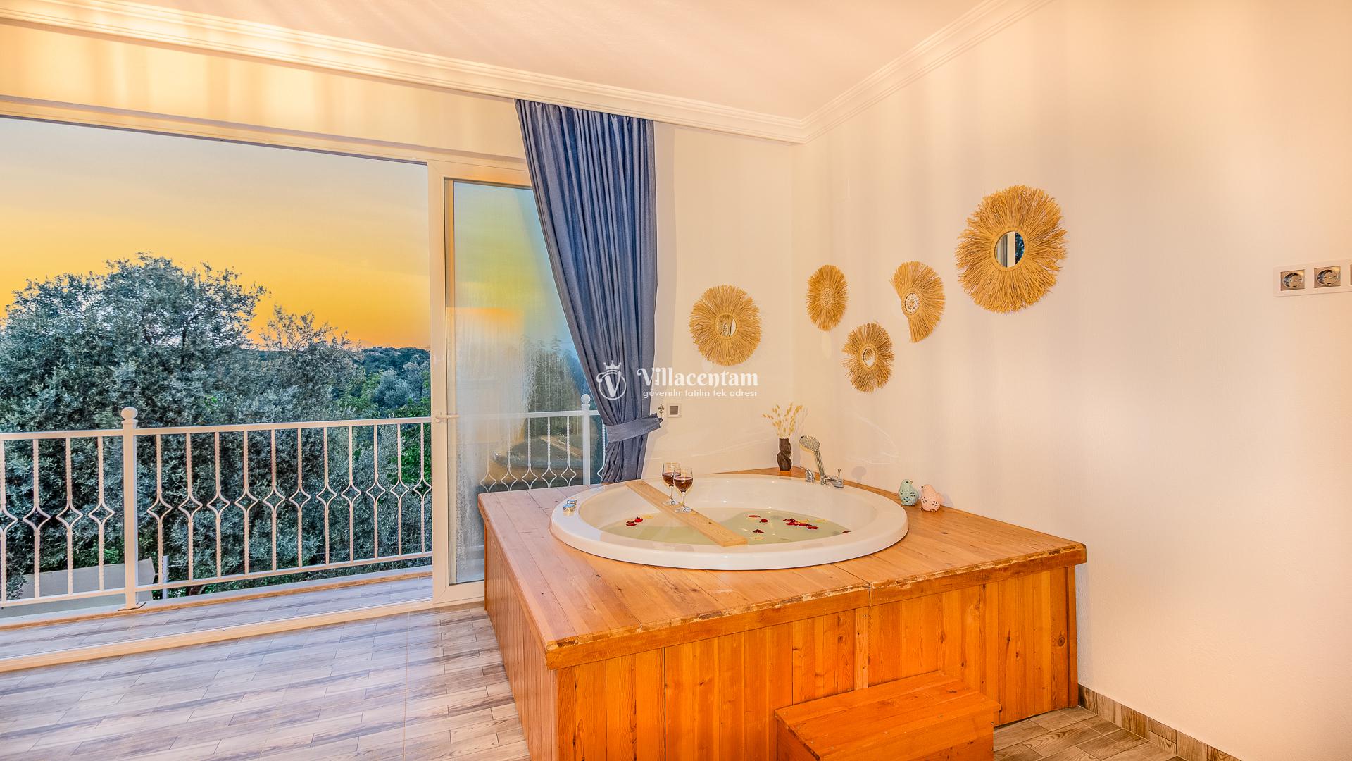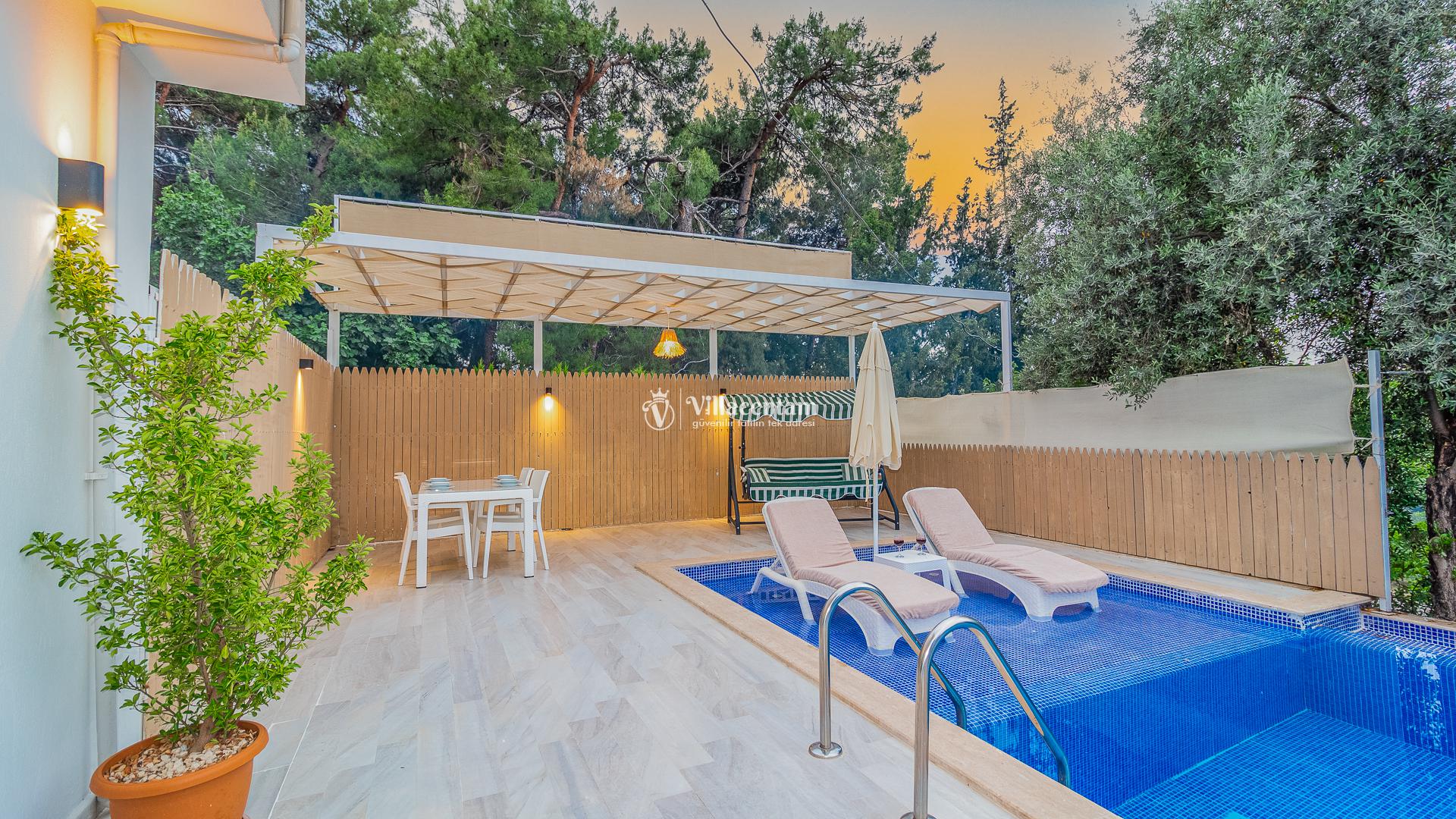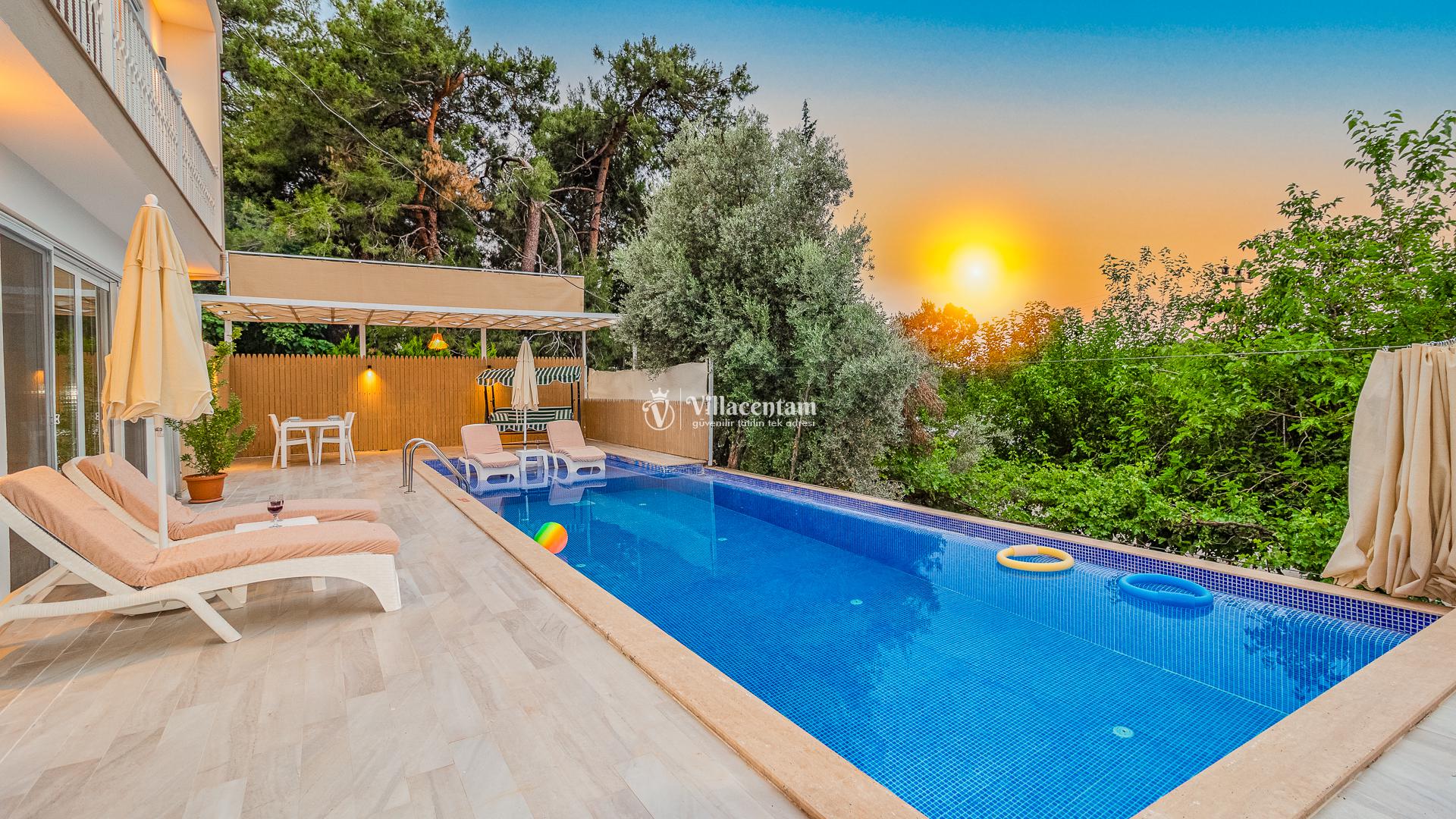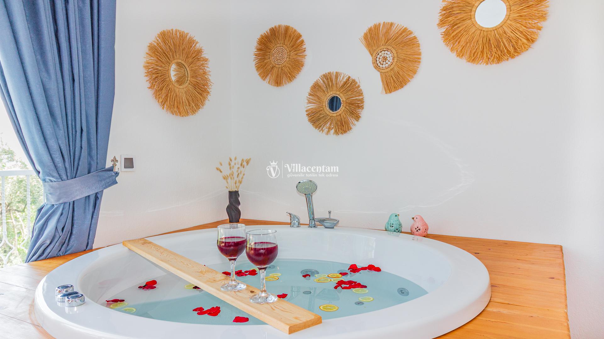 Villamızda bulunan özel yüzme havuzu, dışarıdan görünmeyecek şekilde planlanmış olup tatiliniz boyunca özgürce vakit geçirmenize olanak tanır. Jakuzi, doğanın huzur veren atmosferi eşliğinde dinlenmeniz ve günün yorgunluğunu atmanız için özel olarak tasarlanmıştır. Modern ve konforlu iç dekorasyonu, tam donanımlı mutfağı, ferah salonu ve özenle hazırlanmış yatak odaları ile evinizin rahatlığını tatilde de yaşamanızı sağlar. Şehir kalabalığından uzak, sakin ve keyifli bir tatil arayan misafirler için ideal bir villadır.
