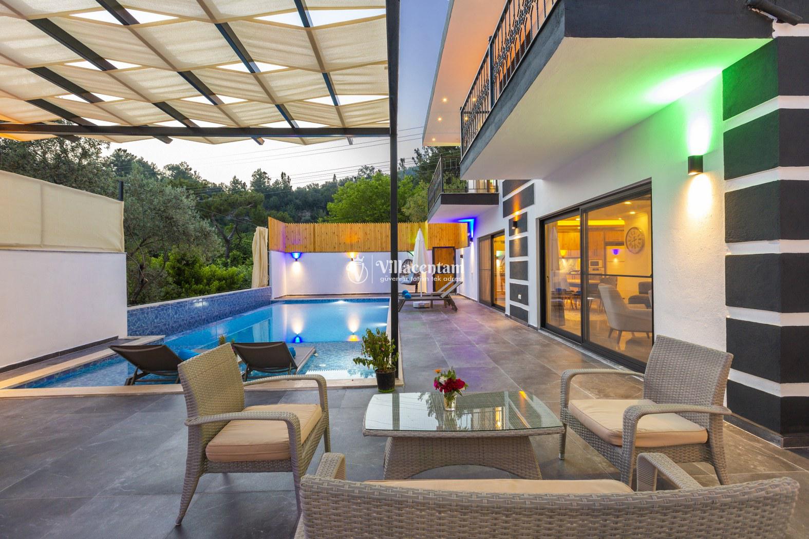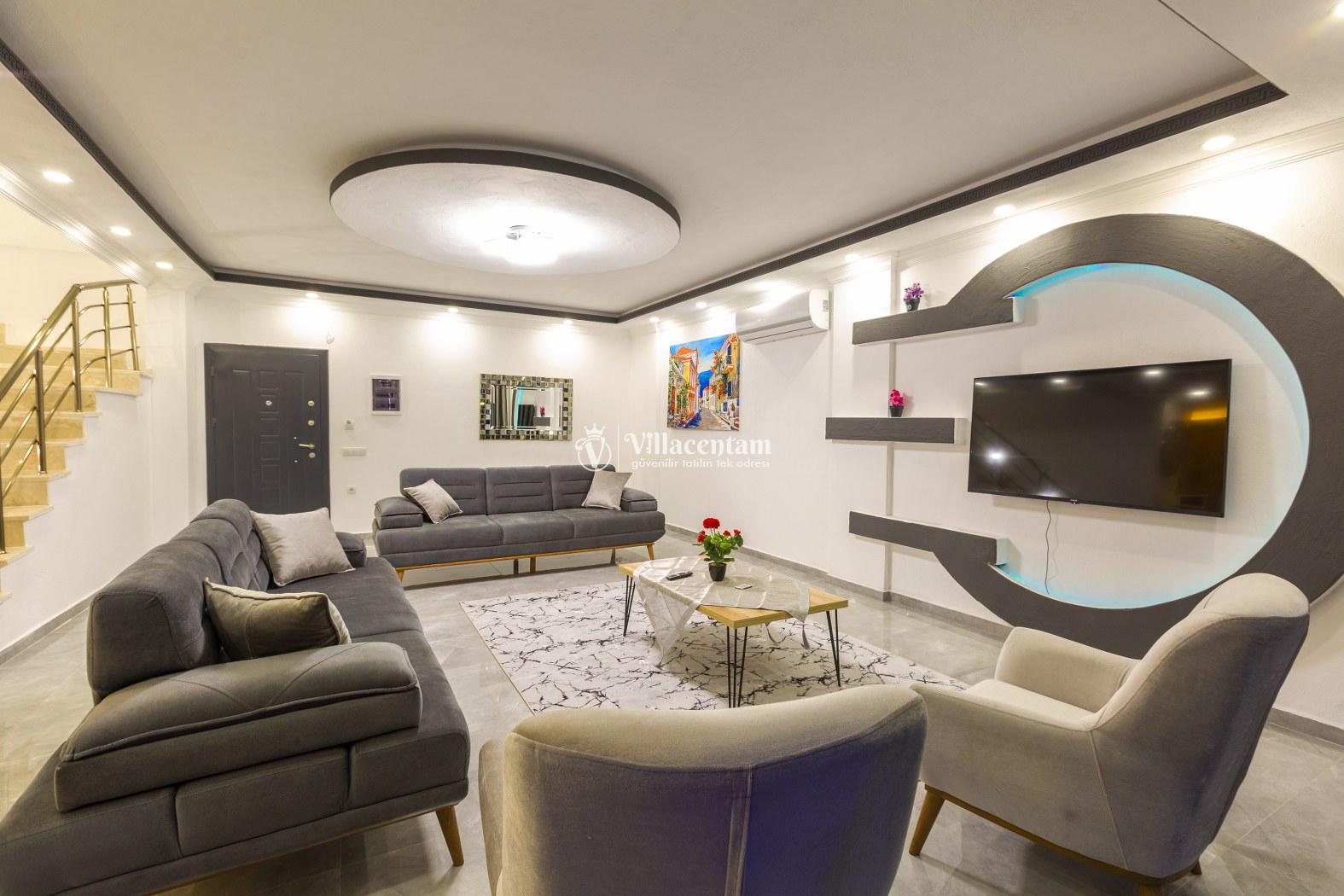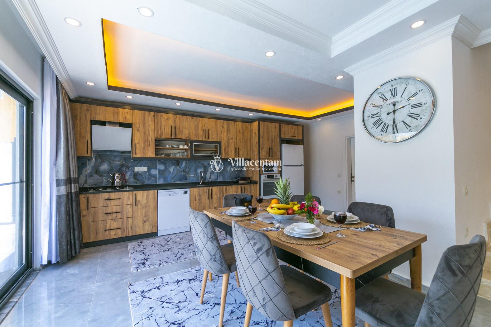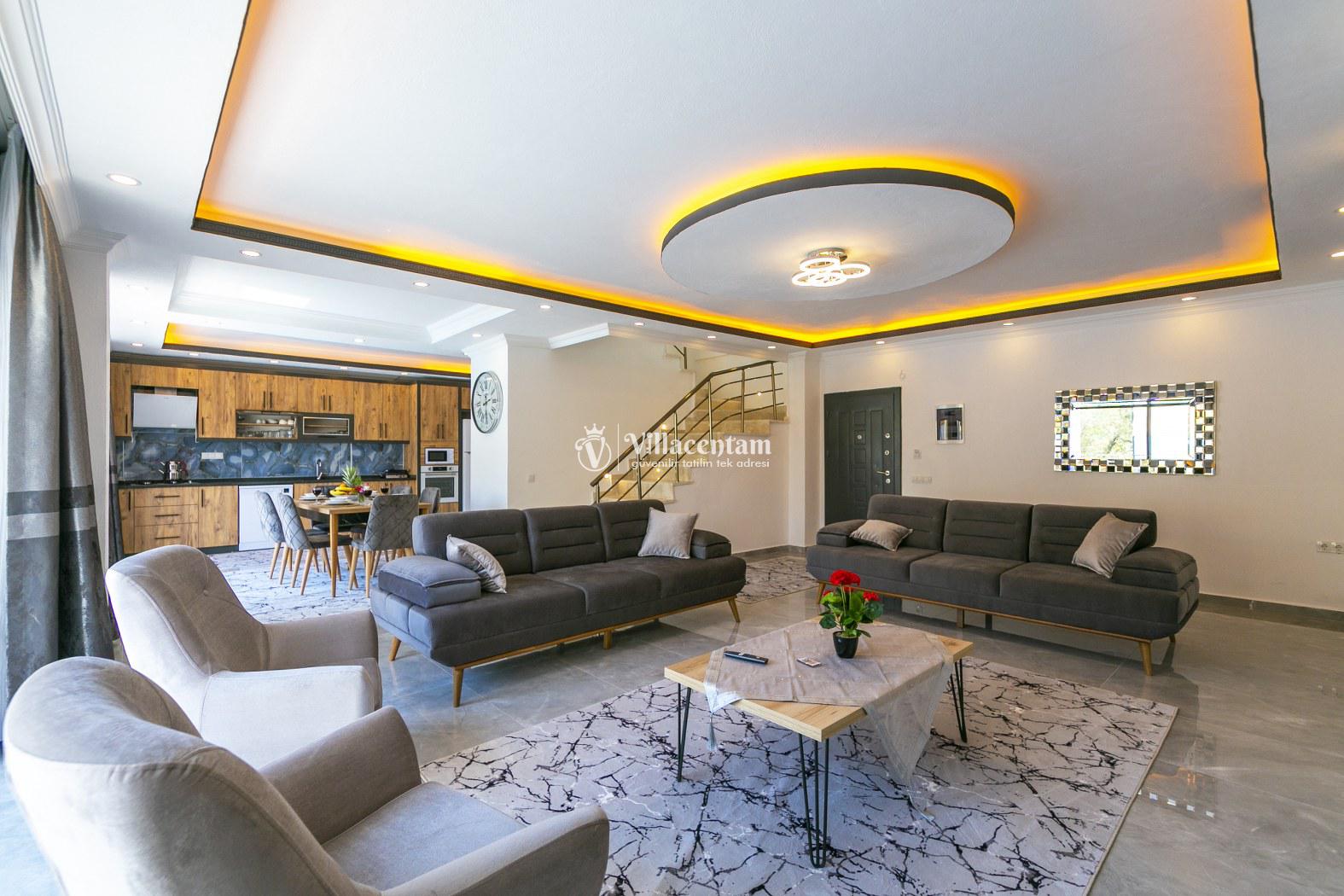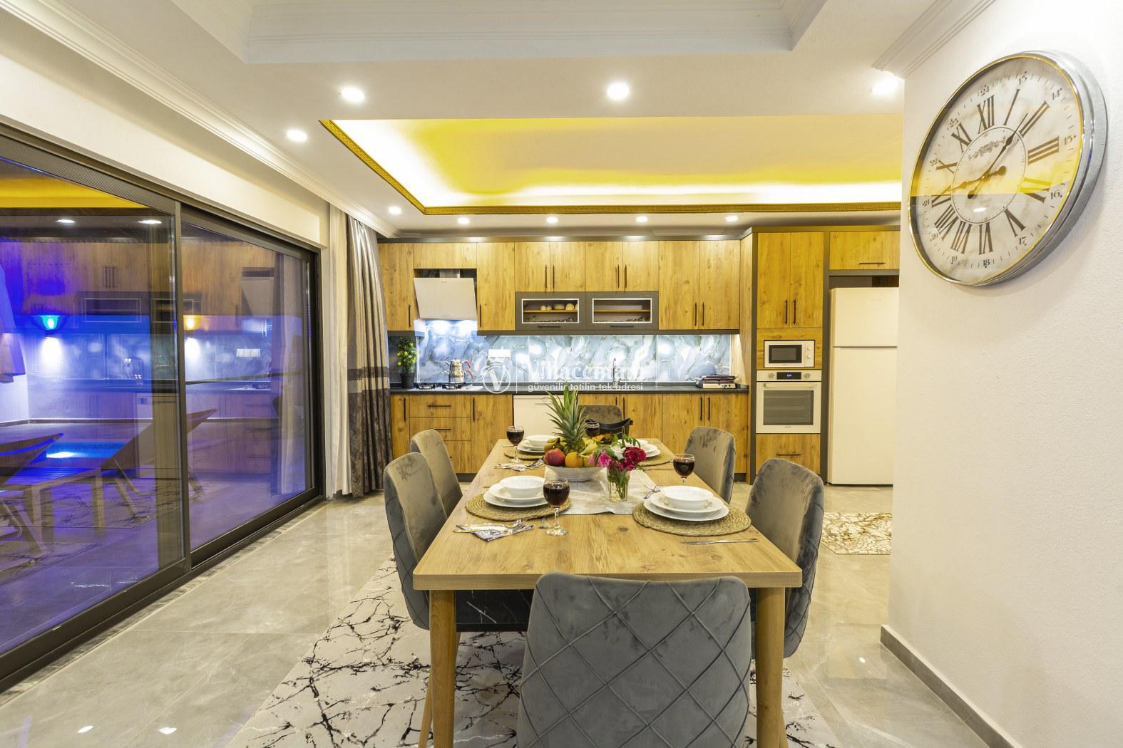 İç mekân modern ve şık detaylarla döşenmiş olup ferah salonu, tam donanımlı mutfağı ve günlük yaşam alanları ile ev konforunda bir tatil imkânı sağlar. Villa, sevdiklerinizle birlikte konforlu ve keyifli bir konaklama için ideal bir düzen sunar.