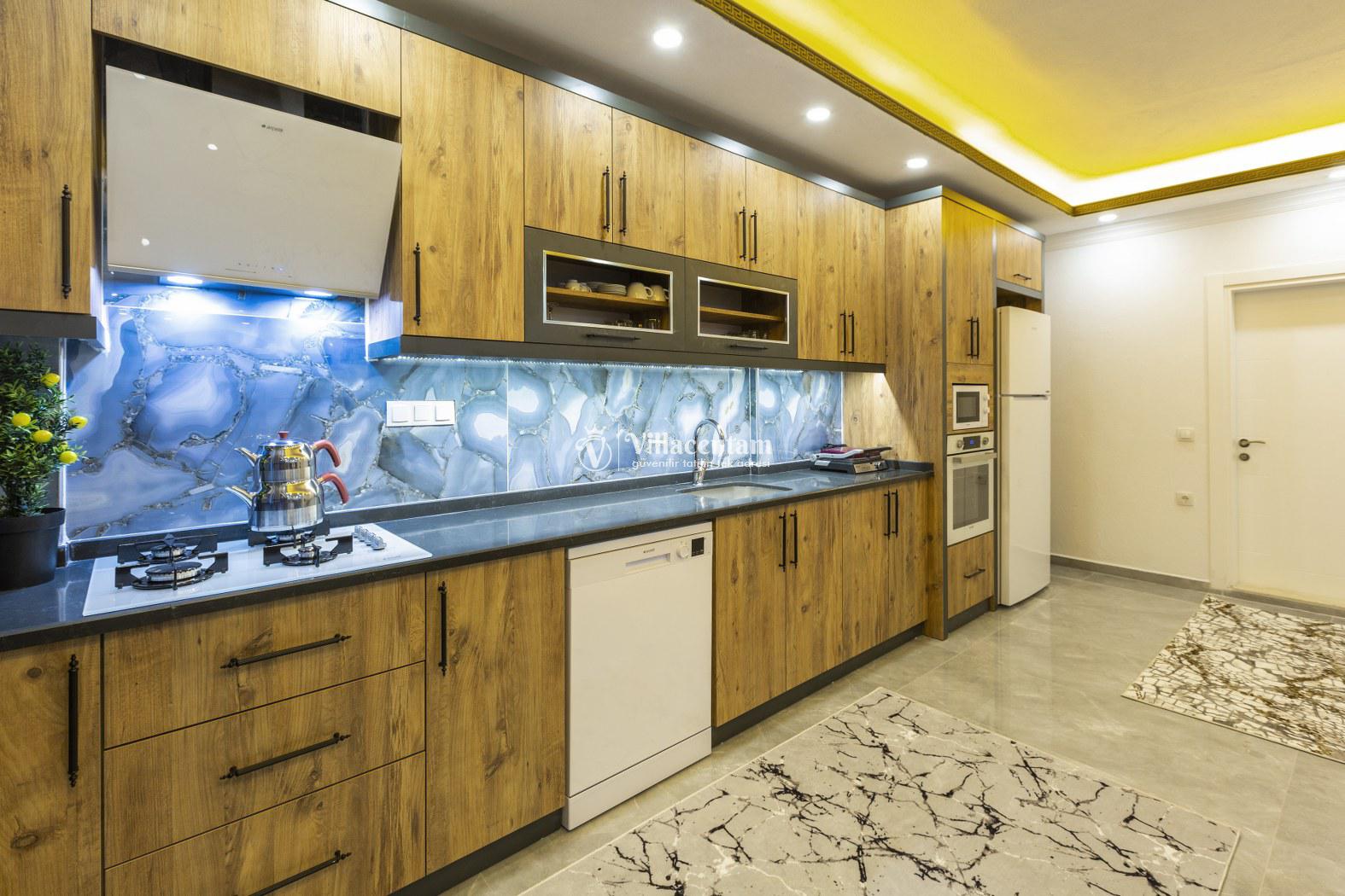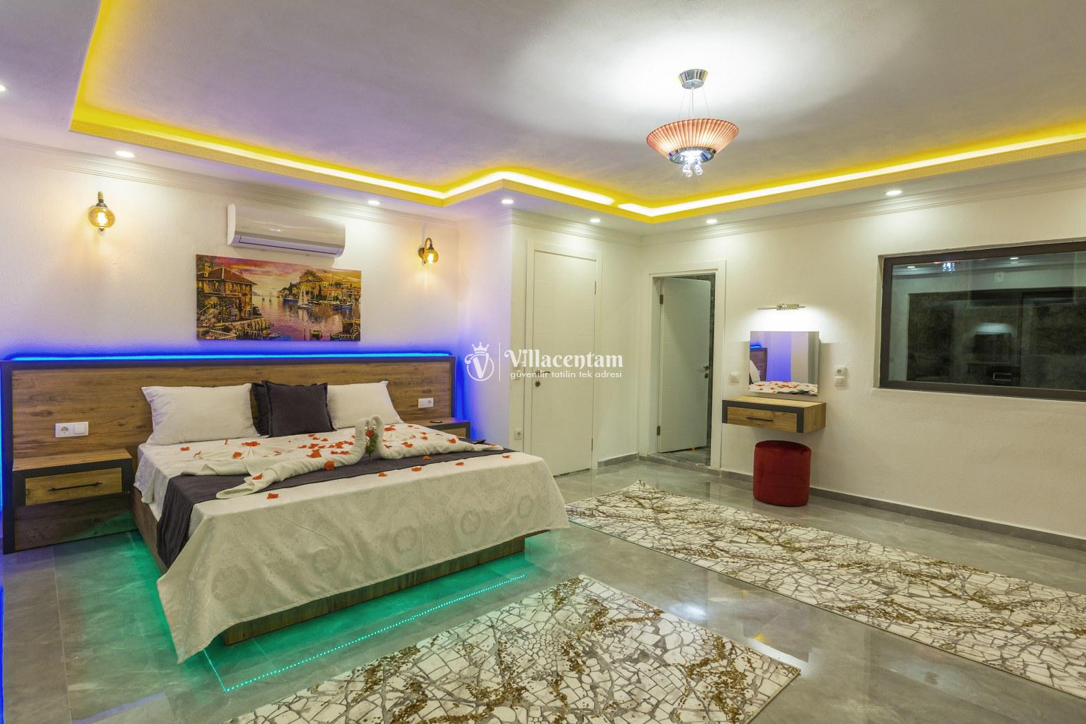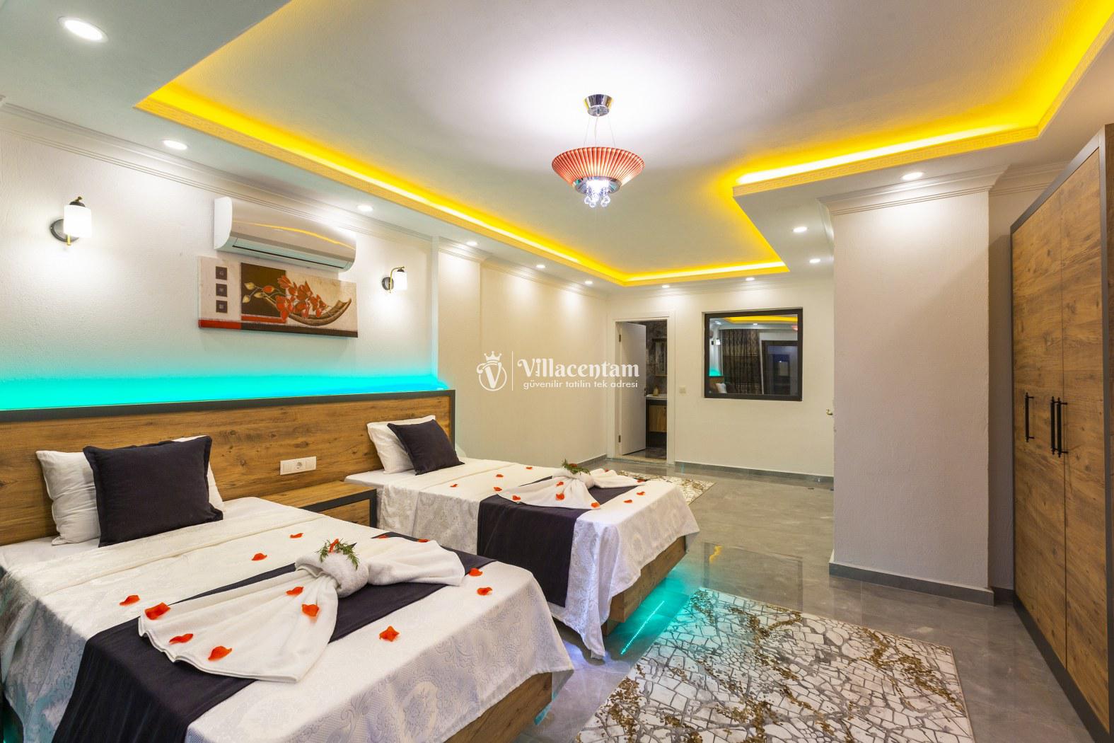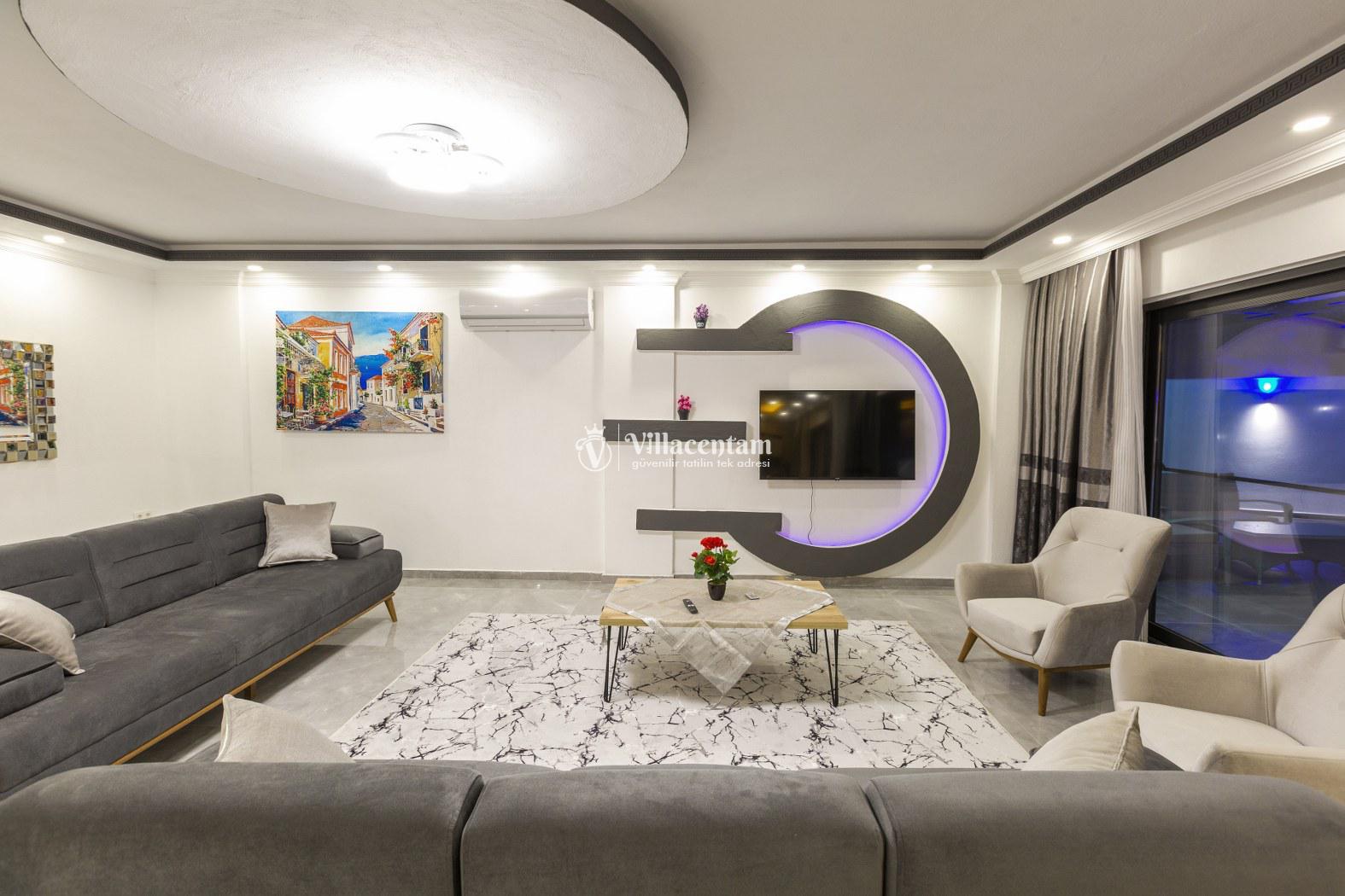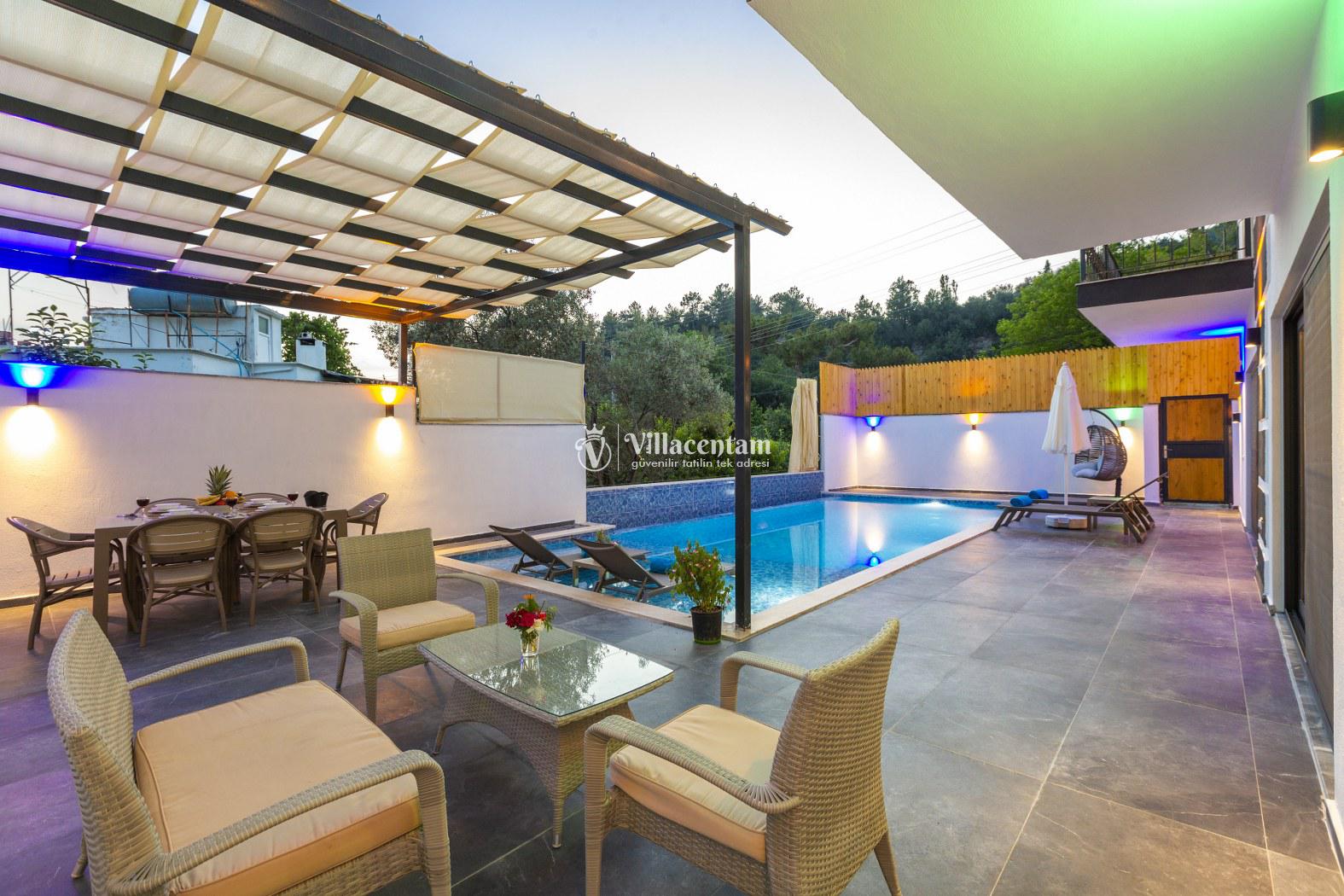 İç mekân modern ve şık detaylarla döşenmiş olup ferah salonu, tam donanımlı mutfağı ve günlük yaşam alanları ile ev konforunda bir tatil imkânı sağlar. Villa, sevdiklerinizle birlikte konforlu ve keyifli bir konaklama için ideal bir düzen sunar.
