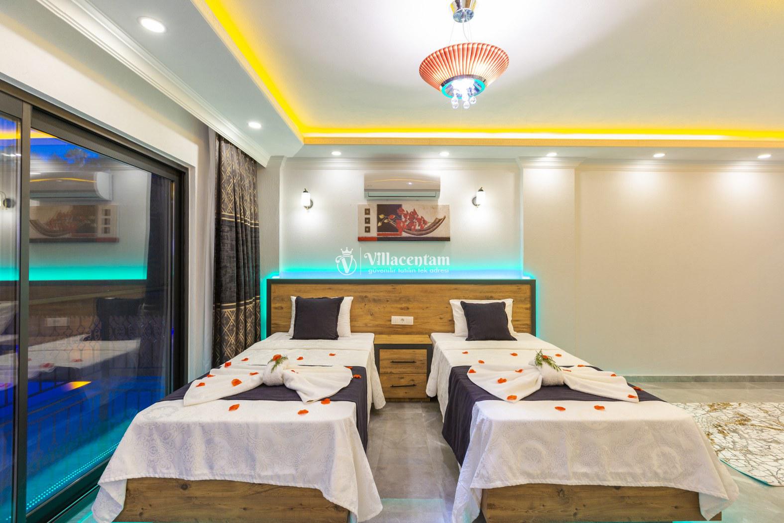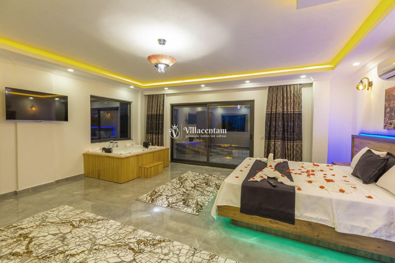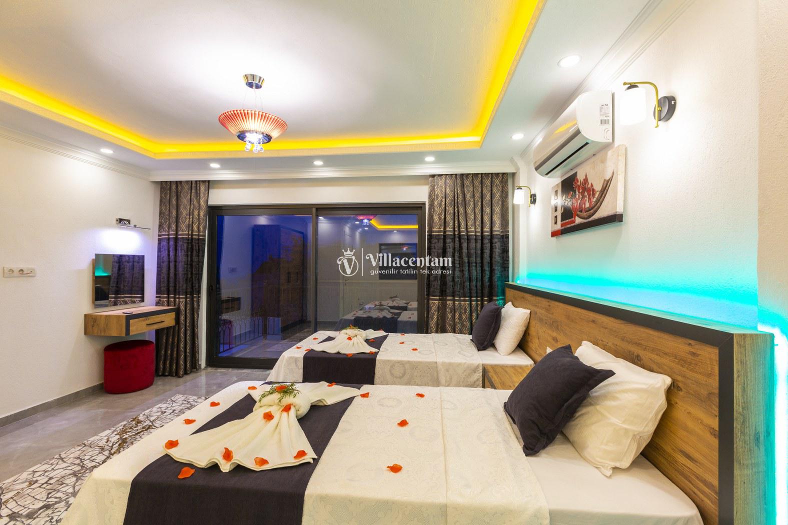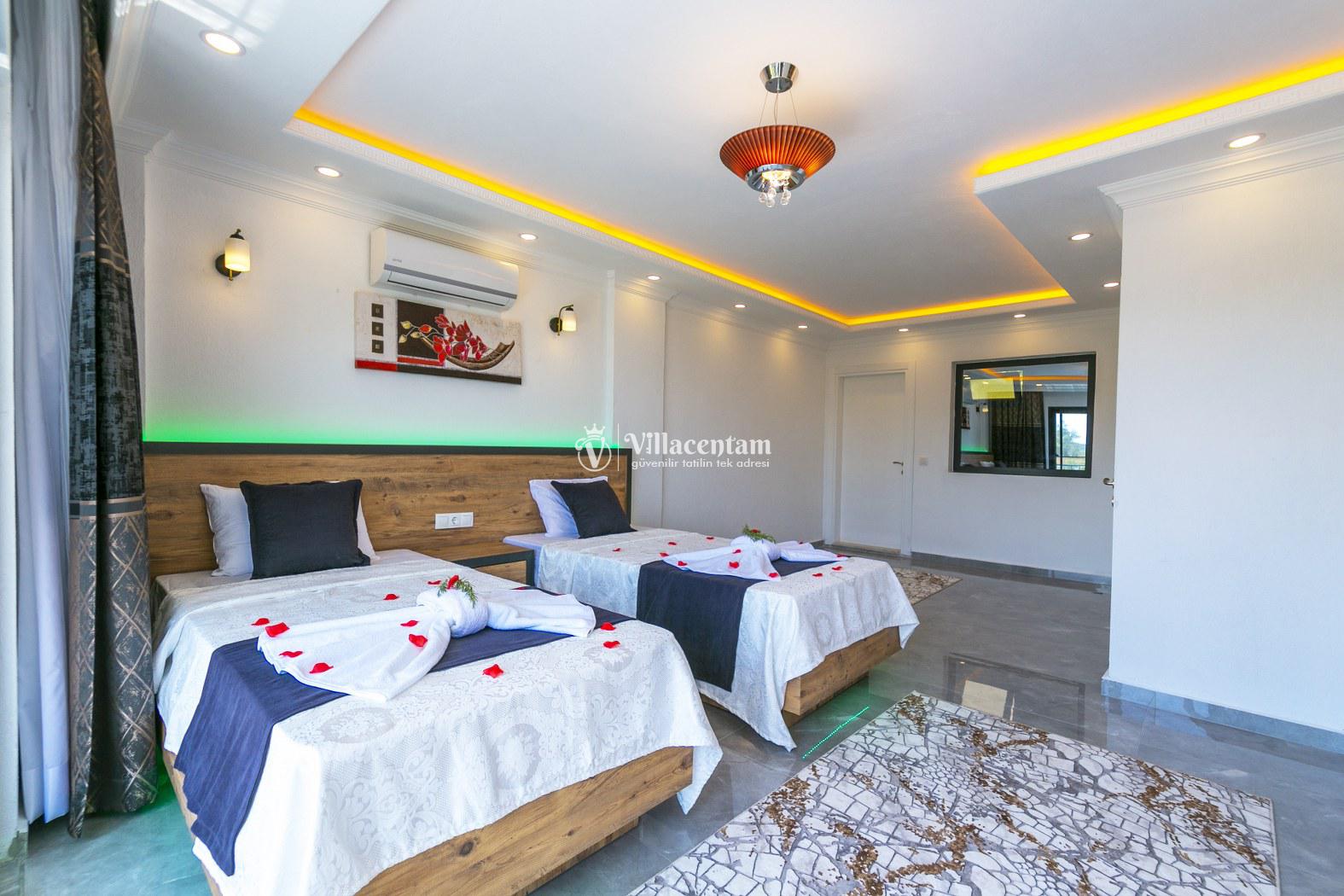 *Villalarda sıcak su için güneş enerjili su ısıtma sistemleri kullanılmaktadır. Çok yoğun sıcak su kullanımında, yoğunluğa ve su tankının büyüklüğüne bağlı olarak su tankında sıcak su tükenebilmekte ve tekrar suyun ısınması için belirli bir süre geçmesi gerekmektedir. Bu not sadece bu villa ile ilgili değil, tüm villalarımız için geçerli bir durumdur.